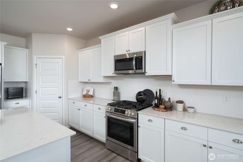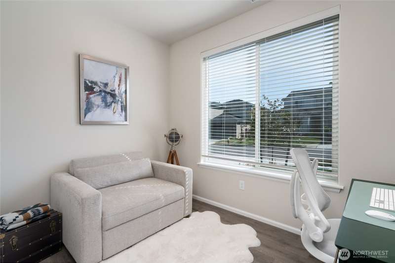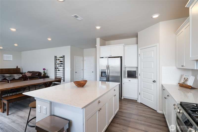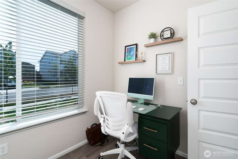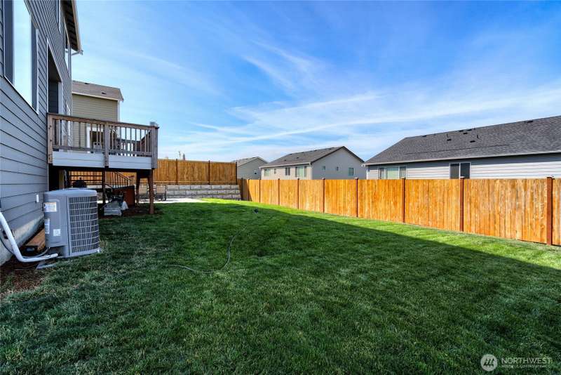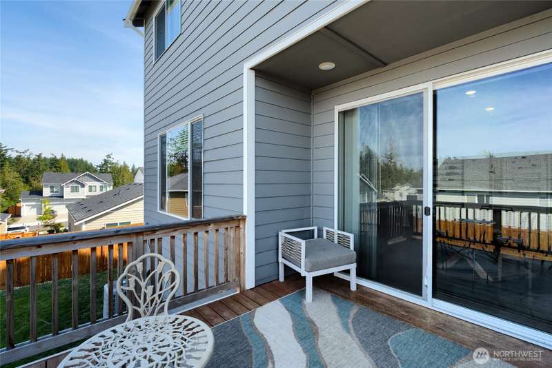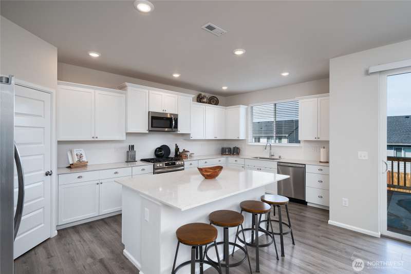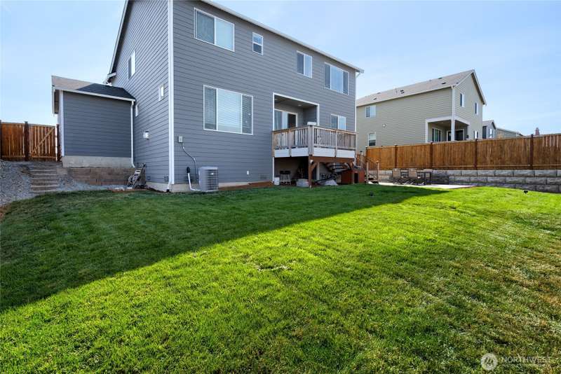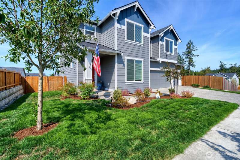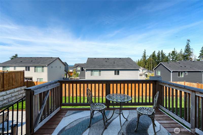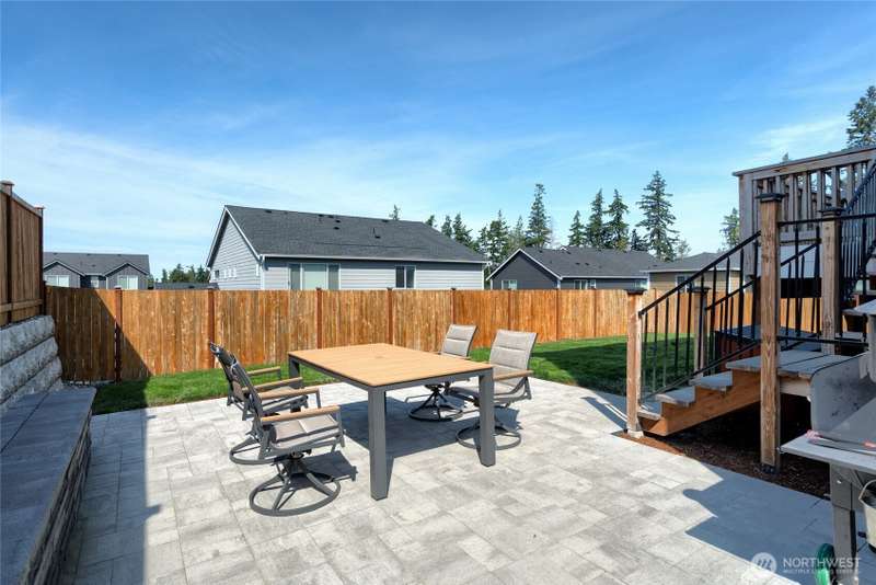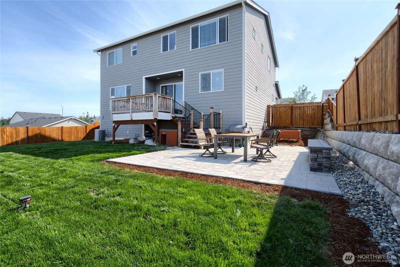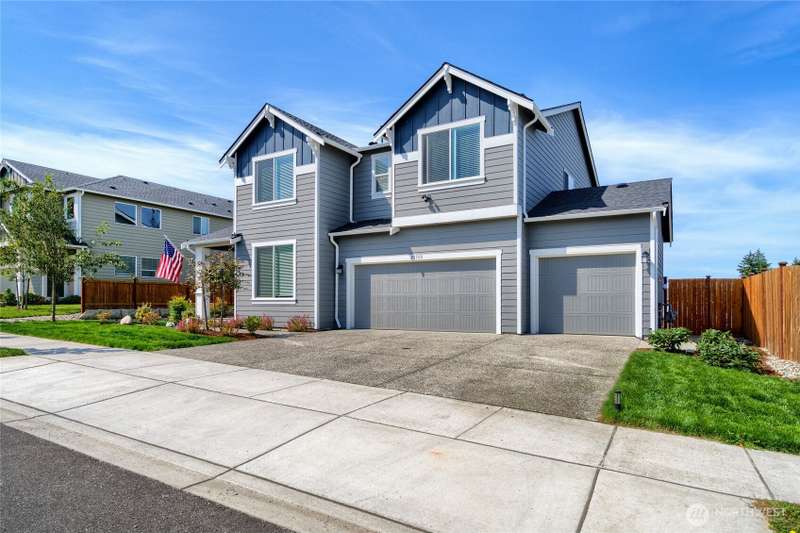 Chandler's Reserve in Stanwood location. The "Stevenson" floor plan with 3- car garage, is a spacious 2700 sq ft floor plan designed for modern living, with a convenient first floor office and open layout among the well equipped kitchen, Great Room and dining area. Upstairs is a bonus room surrounded by all 4 bedrooms, including the owner's suite with spa-like bathroom and walk-in closet. Interior features include hardwood on the main floor, quartz countertops in the kitchen & primary suite, dishwasher, microwave, oven, side by side refer and blinds. Backyard features deck off the kitchen with stairs to fully fenced extra large flat yard with new patio and sitting wall, perfect for entertaining. Garage has dedicated outlet for EV.