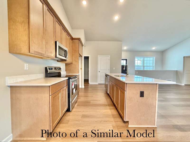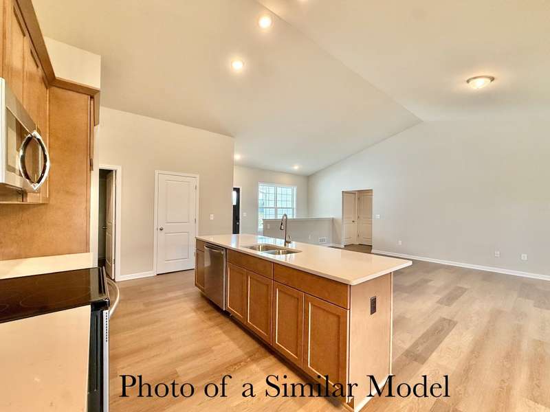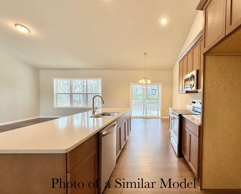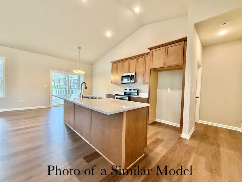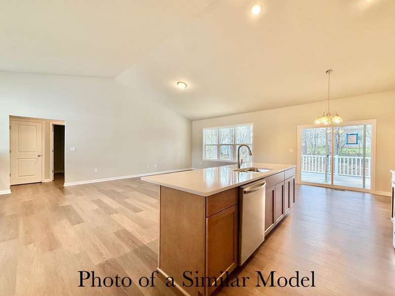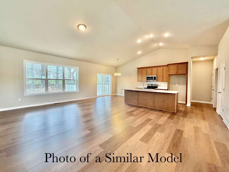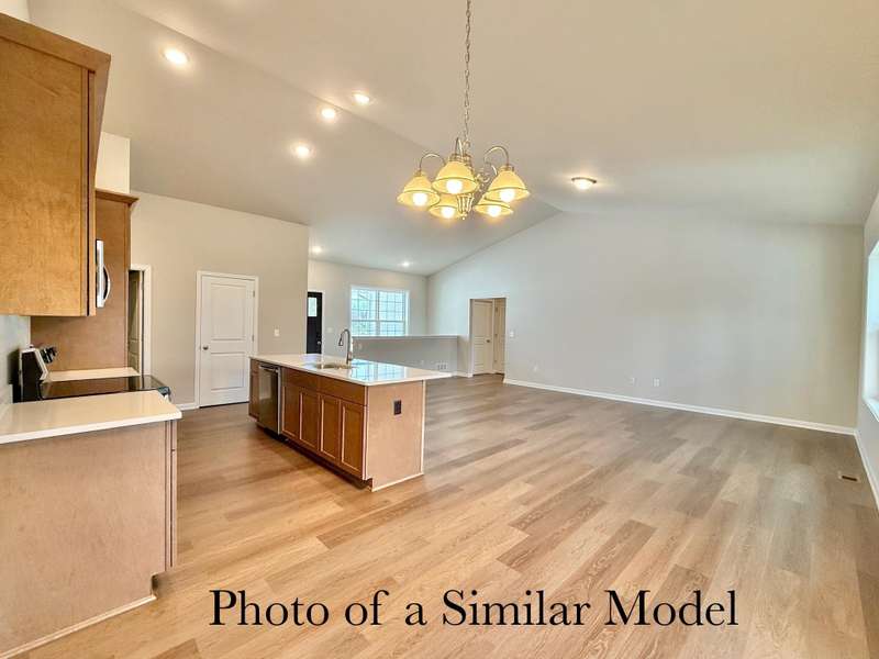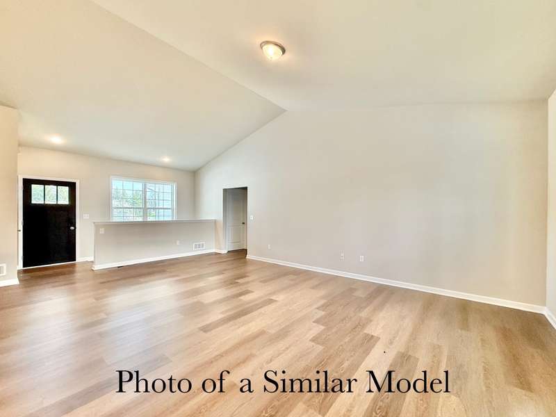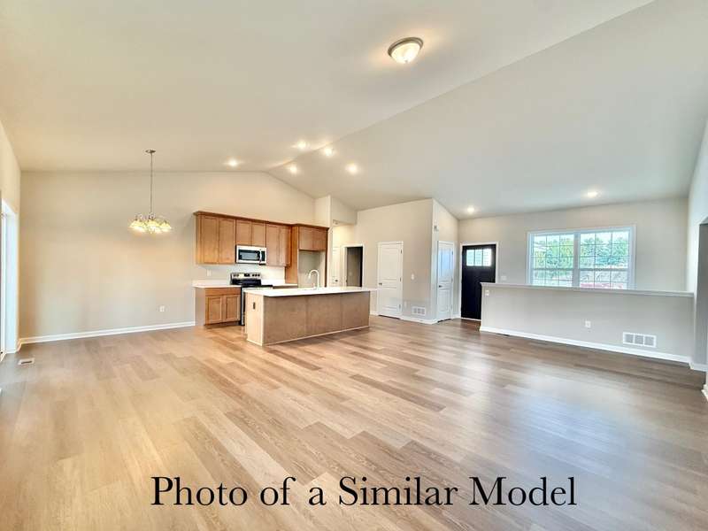 Brand new and built to impress! This 3-bedroom, 2-bath split bedroom ranch checks all the boxes. Step inside to soaring vaulted ceilings and an open-concept layout designed for modern living. The eat-in kitchen is a showstopper, featuring a breakfast bar island, walk-in pantry, and plenty of space to gather. The oversized 3-car garage leads directly into a smartly designed drop zone and laundry area, keeping daily life neat and organized. The primary suite offers a spacious walk-in closet and double sinks for added convenience. With quality craftsmanship throughout and thoughtful design in every corner, this home blends function and style for easy living.