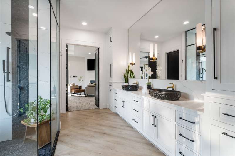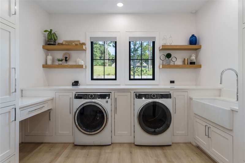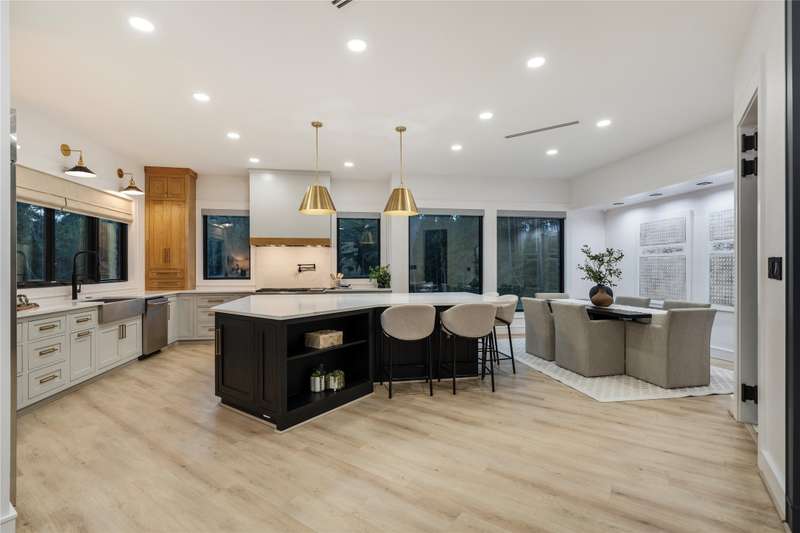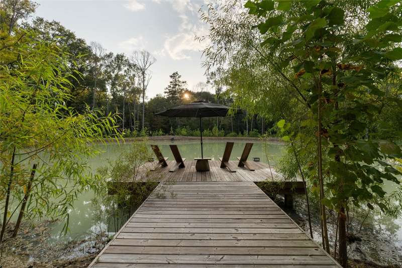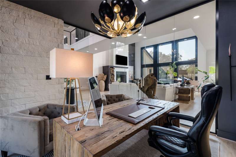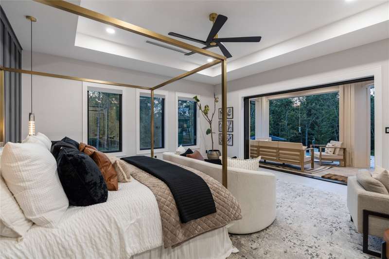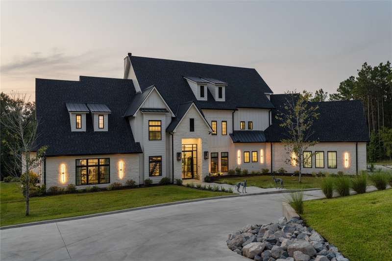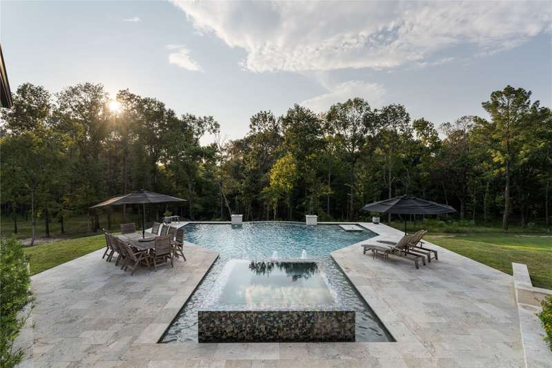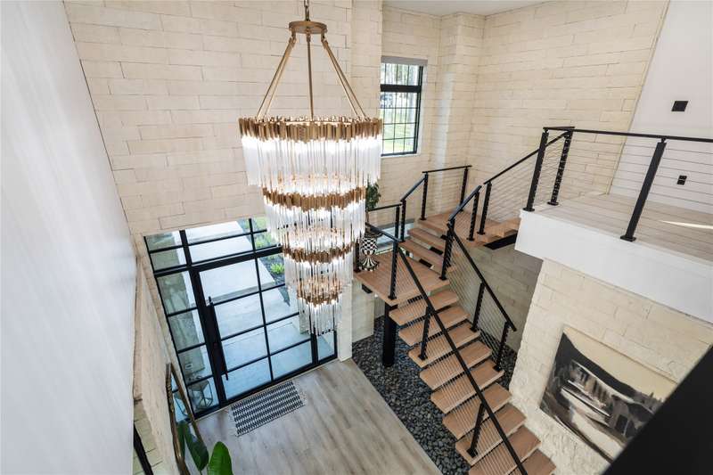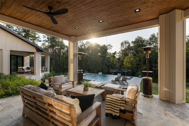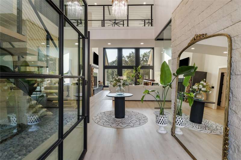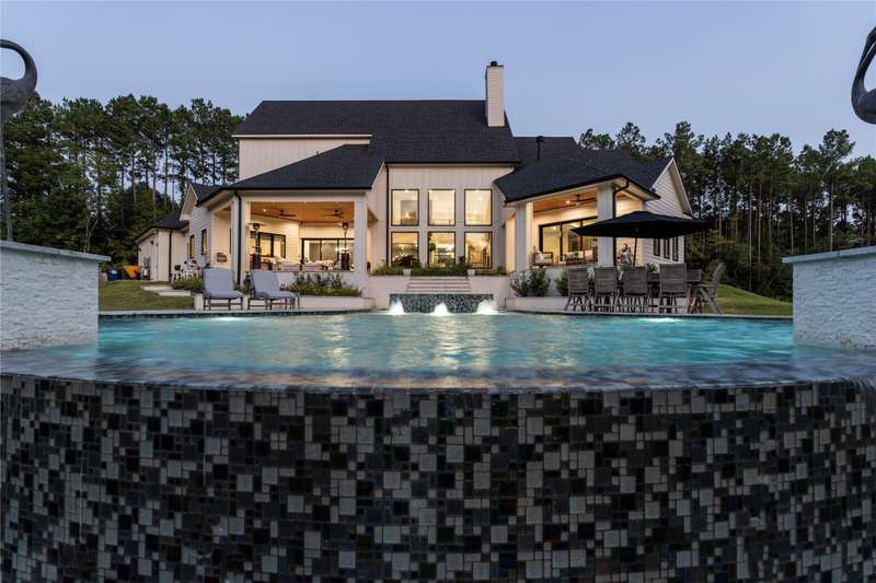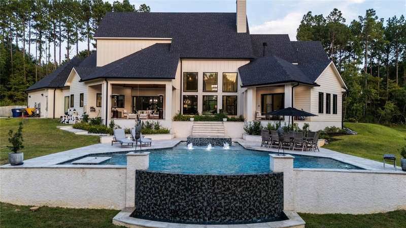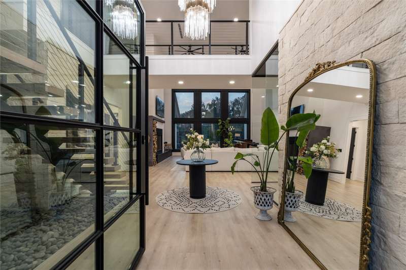 Step into a world of refined luxury, natural beauty, and architectural brilliance on 6.2 private, wooded acres. This custom estate welcomes you with an 11-ft glass pivot door, a dramatic chandelier, and soaring 26-ft ceilings. Floor-to-ceiling windows blur the line between indoors and out, offering breathtaking treetop views. The chef’s kitchen is a masterpiece—quartz countertops, Café commercial appliances, and a full butler’s pantry with ice maker and beverage fridge. The primary suite is your personal sanctuary, featuring a fireplace, a private wellness center, and disappearing glass doors that open to an infinity-edge pool. A sleek glass-partitioned office balances modern design with serenity. Enjoy a stocked pond, media room, two utility rooms, smart home technology, and a lighted custom staircase. Gas appliances, two private wells, and a whole-home water filtration system complete this extraordinary retreat. Every detail speaks luxury. Every moment feels like escape.