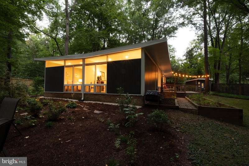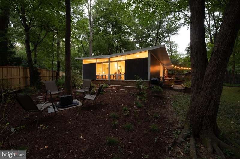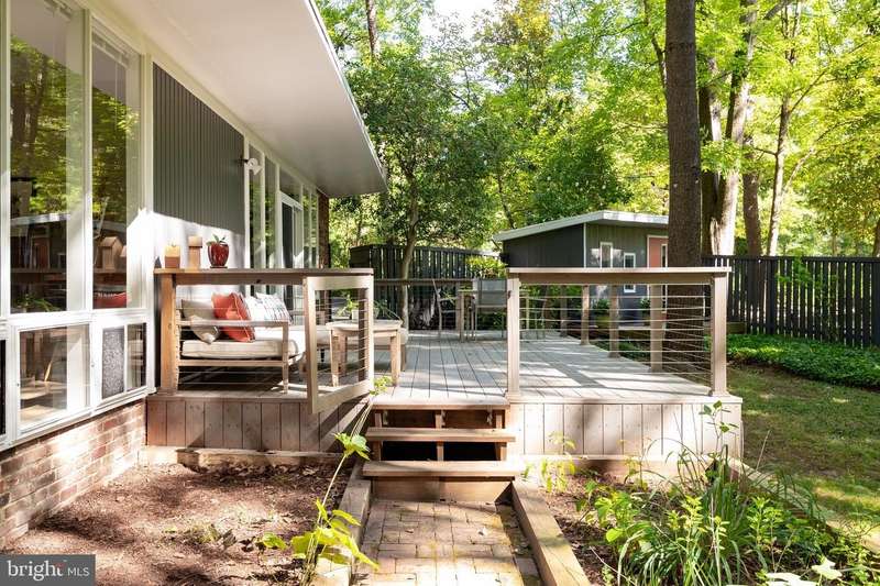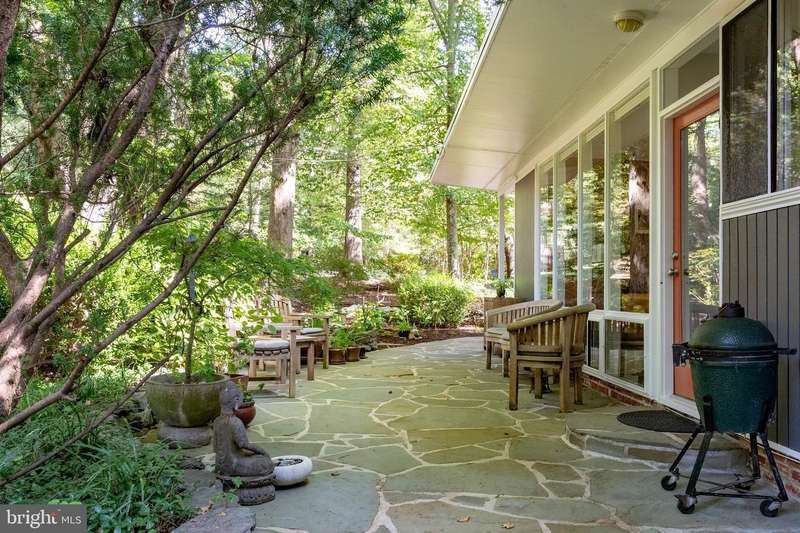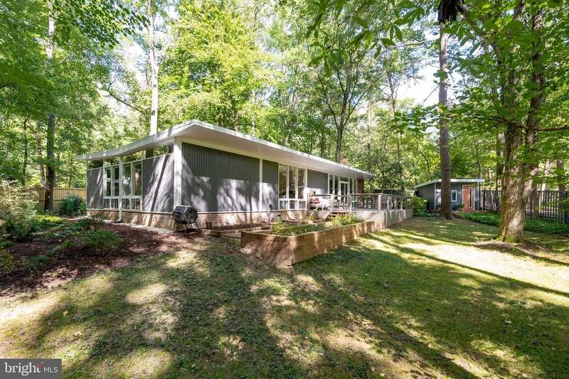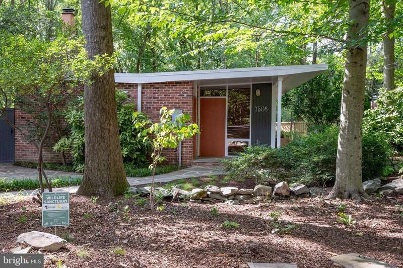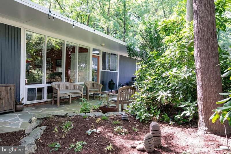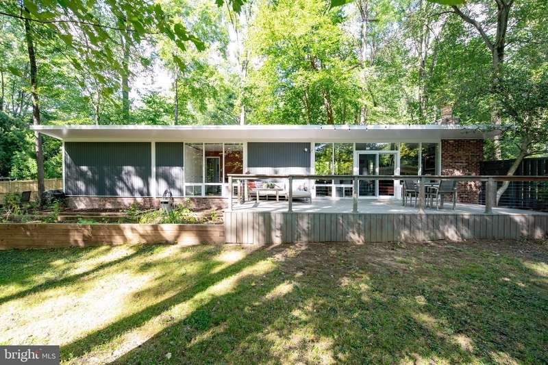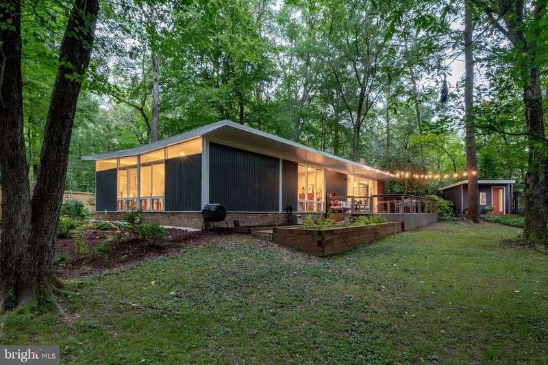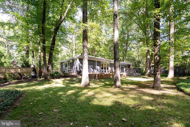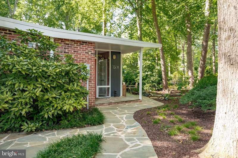 This rare, one-level Mid-Century Modern home designed by renowned architect, Charles Goodman, is located in the highly sought-after neighborhood of Hollin Hills. The home features a distinctive butterfly roof, floor-to-ceiling windows and three skylights, three outdoor living areas, and an extended floor plan expanded in width and depth during construction making it notably larger than typical Hollin Hills homes. Nestled on a beautifully native landscaped lot recently certified as a Wildlife Sanctuary that backs to five acres of Fairfax County parkland, the home provides a private sanctuary within the heart of a vibrant, active community. Within the home, the owners will have over 1,700 square feet of thoughtfully designed living space to call their own. Upon entering, you're welcomed into a foyer with original Hollin Hills stonework that opens to a spacious, light-filled open floor plan offering many options for living, dining, relaxing, and gathering. This multi-functional space boasts a gas fireplace hearthed with more original stonework and a dining area with sliding glass doors that lead to a brand-new deck complete with modern stainless steel railings, further extending the living space. The updated and sleek modern kitchen boasts a skylight, granite countertops, stainless steel appliances, a pantry and ample storage, as well as a glass door that opens to a charming front slate patio. Additionally, this home features three spacious bedrooms, all with windows facing the beautiful landscaping outdoors; two full, updated bathrooms; and multiple oversized closets for storage. The true primary bedroom - so large that a king sized bed seems small - has a beautifully remodeled en-suite bathroom with a skylight and a custom tile shower. The second bedroom is uncommonly large as well, giving the home the feel of two primary bedrooms. The third bedroom overlooks the lush backyard and park and can easily accommodate its new owners beautifully as a bedroom, an inspiring art studio, or as a relaxing home office. The hallway bathroom features a tub with glass doors and another skylight, flooding the space with natural light. High-end laminate wood flooring runs throughout the home, and most closets include premium organizers for efficient storage. Outdoor amenities include a newly rebuilt, slant-roof detached shed with windows, electricity, and a small front porch area-offering great potential as a home office or studio. An additional attached storage space provides ample room for bikes and other equipment, rounding out the home's thoughtful blend of form and function. The scenic, Hollin Hills neighborhood also boasts over 30 acres of community-owned parkland and trails, offers membership to 2 community pools as well as membership to a tennis and pickleball club, and is a commuter's dream being just minutes from GW Parkway and trails, D.C., Pentagon, Fort Belvoir, and Andrews AFB & Tysons Corner via I-495. If you have ever dreamed of living in a park like setting where you can gaze upon nature from literally every room of your home, all the while retaining all of the urban conveniences of restaurants, stores, and culture just minutes away; wish you could step outside your door and see a multitude of native Virginian plants and animals from the solitude of your own personal native woodland garden, without spending more than a few minutes a week caring for it; and aspire to be a part of a true community of neighbors who look out for one another, have planned social events throughout the year, and where a simple walk around the block leads to lots of hand waves or curbside chats, while still retaining your own private space to recharge as needed - look no further than the well-cared for Sanctuary offered at 7508 Range Rd. This home is truly a one of a kind in a one of a kind location in a one of a kind community and an idyllic place to call home! Seller has right to accept an offer at any time.