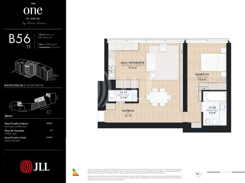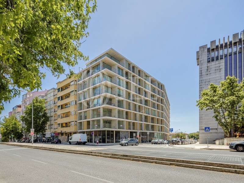O CORAÇÃO DA MINHA CASA É O BAIRRO. Apartamento T1 com 69 m² de área bruta privativa, em estado novo, localizado no 6.º piso do edifício The One, projeto de autoria do arquiteto Eduardo Souto de Moura, situado na Avenida João XXI, em Lisboa. Inclui um lugar de estacionamento e uma arrecadação. A zona social é composta por sala e cozinha em open-space com 31 m². A área privada inclui uma suite com casa de banho completa e uma casa de banho social. A orientação para o interior do quarteirão garante tranquilidade, desafogo, e boa exposição solar. O apartamento está equipado com ar condicionado por ventiloconvetores em todas as divisões, sistema de águas quentes sanitárias com apoio de painéis solares e bomba de calor, e sistema de domótica. Os acabamentos incluem pavimento em madeira multicamada de carvalho, mármore nas instalações sanitárias, piso radiante na instalação sanitária da suite, estores elétricos e cozinha equipada com eletrodomésticos Bosch. O lugar de estacionamento dispõe de infraestrutura para carregamento de veículos elétricos. O edifício oferece aos residentes um ginásio equipado (Technogym) e jardim comum. Da autoria do arquiteto Eduardo Souto de Moura, Prémio Pritzker 2011, o projeto destaca-se pela linguagem contemporânea e funcional, pelo detalhe, e pela integração harmoniosa entre espaços interiores e exteriores. Situado numa das zonas mais centrais de Lisboa, o apartamento encontra-se a poucos minutos a pé do Campo Pequeno, da Avenida da República, da Culturgest, da Praça de Londres e do Jardim do Arco do Cego. Está também próximo da Escola Dona Filipa de Lencastre e de várias opções de transportes públicos, incluindo metro e comboio (Campo Pequeno e Entrecampos). O Aeroporto de Lisboa fica a cerca de 15 minutos de distância. Categoria Energética: A #ref:88398