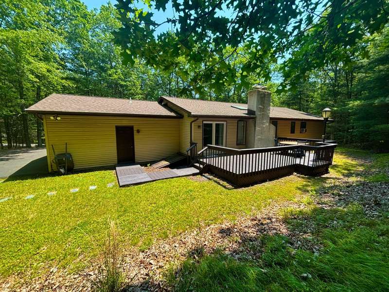 Your private oasis awaits! Situated on nearly 1.2 wooded acres, this charming ranch has so much to offer it's next owners. Located in a desirable neighborhood in scenic Chestnut Hill Twp, this home offers a bright and airy feeling in a peaceful and private setting. The modern kitchen has ample space for dining. Beautiful hardwood floors flank the living room and hallways. The living room is stunning with a wood burning fireplace, vaulted ceilings, a skylight, and sliders to an over-sized deck out back. The primary bedroom is spacious with a large closet and en-suite with walk in shower. Two additional bedrooms are ample in size and an additional full bathroom for added convenience. The basement is clean and dry offering options for storage, or could be finished to add extra living space. Outside, a large deck surrounded by trees feels like a private retreat! Conveniently located near major arteries, and amenities including shopping, skiing, hiking, and more!