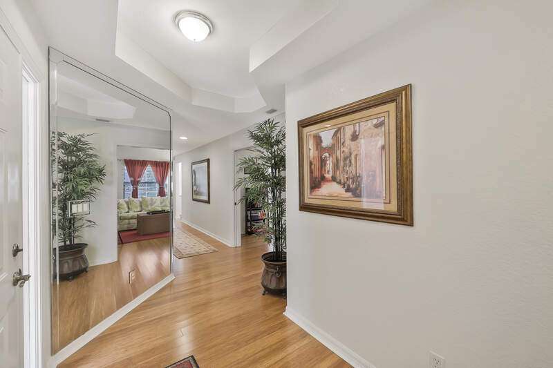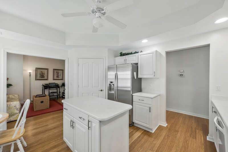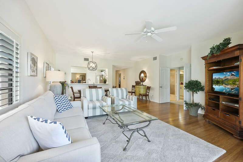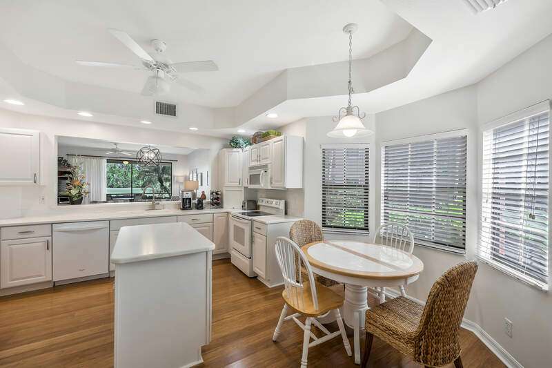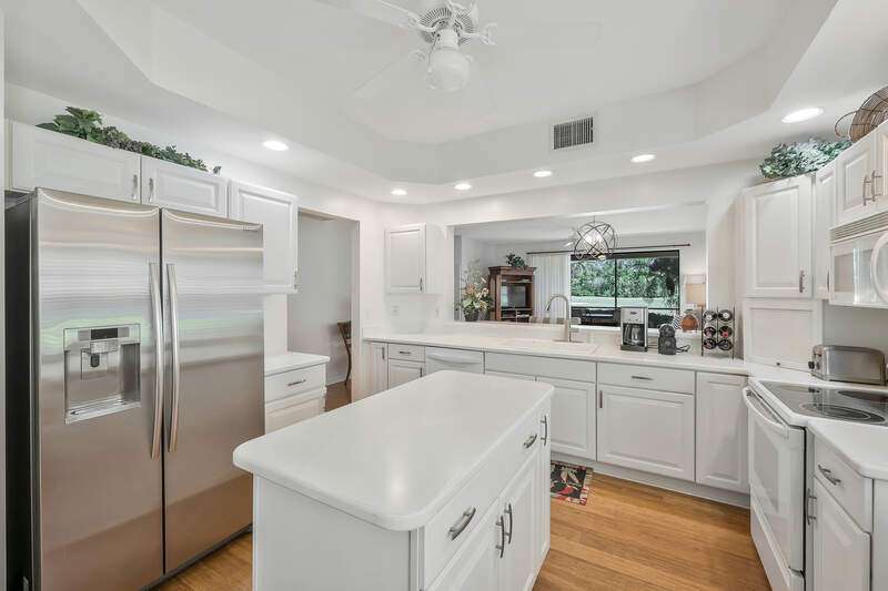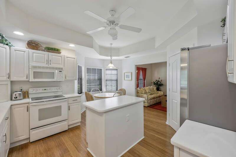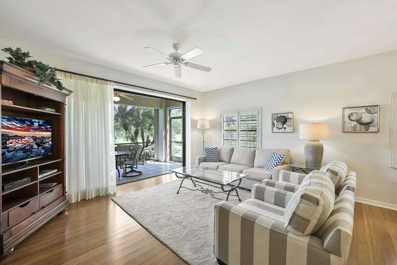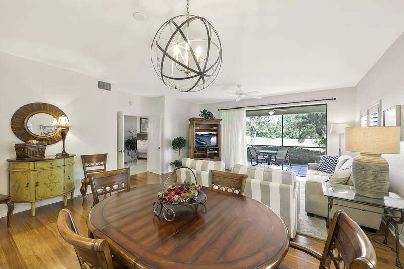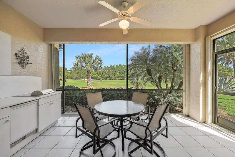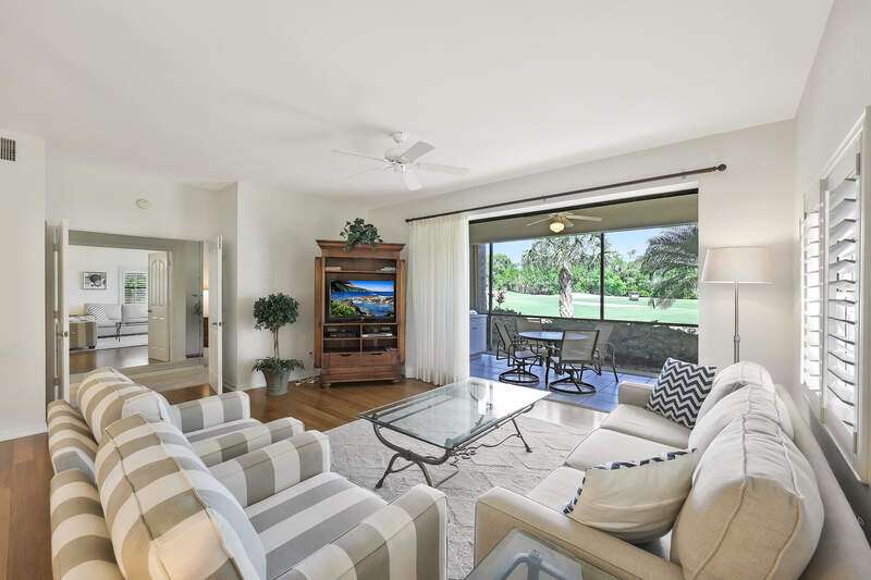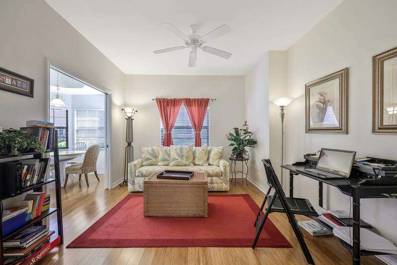 Nestled in a serene and private setting with breathtaking views of the lush golf course, this beautifully appointed first-floor residence offers a perfect blend of comfort and elegance. The home is being told turnkey furnished, with exquisite custom interior details that create an inviting atmosphere from the moment you step inside. NOW WITH A BRAND NEW AIR CONDITIONER, this home provides stunning views that stretch from the well-equipped kitchen, through the expansive Great Room, and out to the screened lanai with outdoor electric grill and beverage refrigerator - a perfect space for relaxing and enjoying the scenery. The plantation shutters & rich bamboo flooring adds a touch of natural beauty, while the updated bathrooms create more modern feel. A generous den provides an ideal space for a home office or separate cozy retreat. The community is just as appealing, with the Grand Reserve community pool within walking distance, offering a convenient spot to relax and unwind. For those looking to enjoy the full range of luxury amenities, The Strand offers access to a state-of-the-art 32,000 sq. ft. clubhouse, as well as tennis & pickleball courts, a fully equipped fitness center, spa facilities and exceptional dining options. Whether you are seeking an exceptional year-round residence or a tranquil seasonal getaway, this home provides the perfect setting to enjoy the best of Florida living. Don't miss the opportunity to experience this elegant retreat - where comfort, convenience, and natural beauty come together in perfect harmony.