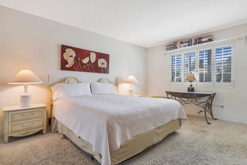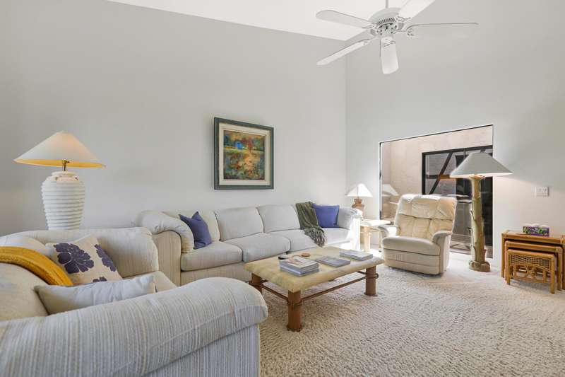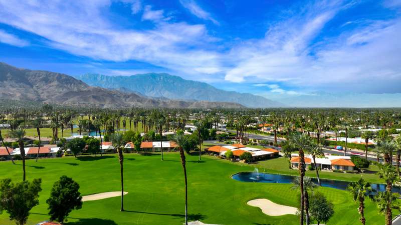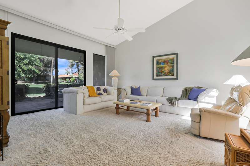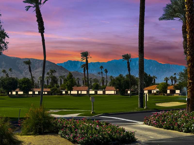 Experience both timeless elegance and modern amenities in this meticulously maintained, fully furnished home. Rustic Spanish tile floors combine with vaulted ceilings and a comfortable, carpeted living room to create a welcoming atmosphere. The kitchen is updated with new appliances and accented by sleek white tile countertops. Dual pane windows boost energy efficiency while offering picturesque views throughout the year. Each bathroom is fitted with contemporary showers, including a double vanity in the primary suite for added luxury. The residence is completely handicapped accessible, with cozy carpeting in each bedroom for warmth. Plantation shutters on the west side frame breathtaking views of the golf course and mountains, ideal for relaxing evenings. A newer HVAC system and water heater provide additional peace of mind.Sunrise Country Club offers secure, guard-gated living with 746 residential condos, an 18-hole Par 64 golf course, nine championship tennis courts, ten pickleball courts, twenty-one pools and spas, plus a clubhouse featuring a dining room, lounge, grille, pro shops, and a fitness/activity center. Two new bocce ball courts add to the recreational options. Located in Rancho Miragethe heart of the desertthe community is close to top shopping, entertainment, and health facilities. Palm Springs International Airport is only 20 minutes away.