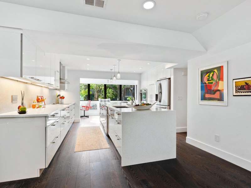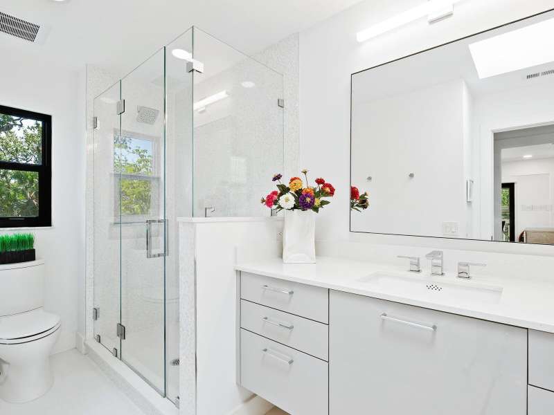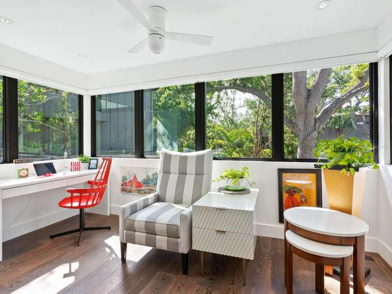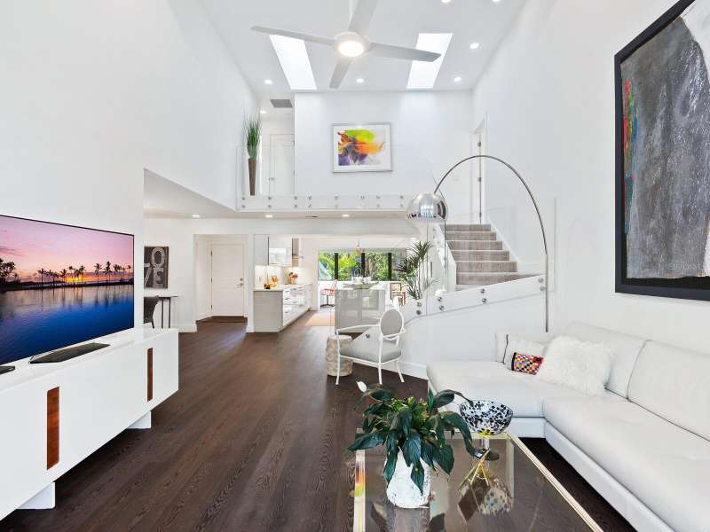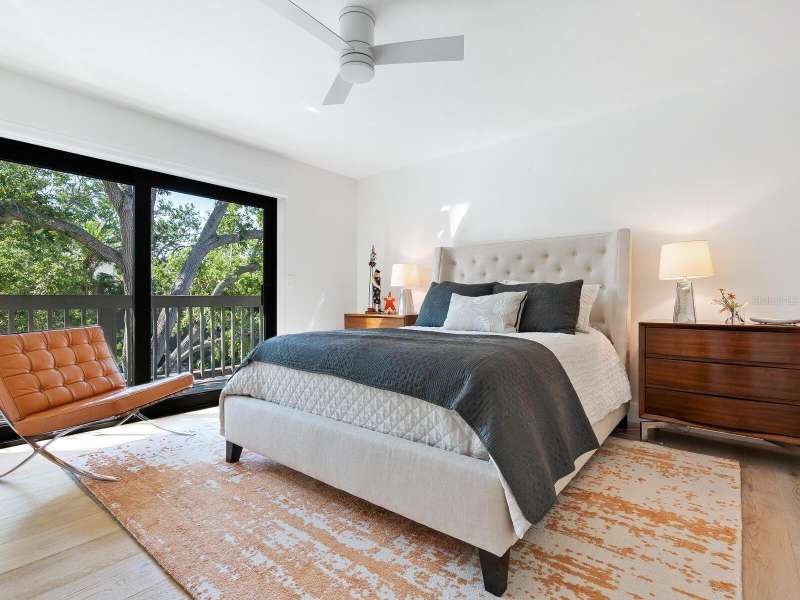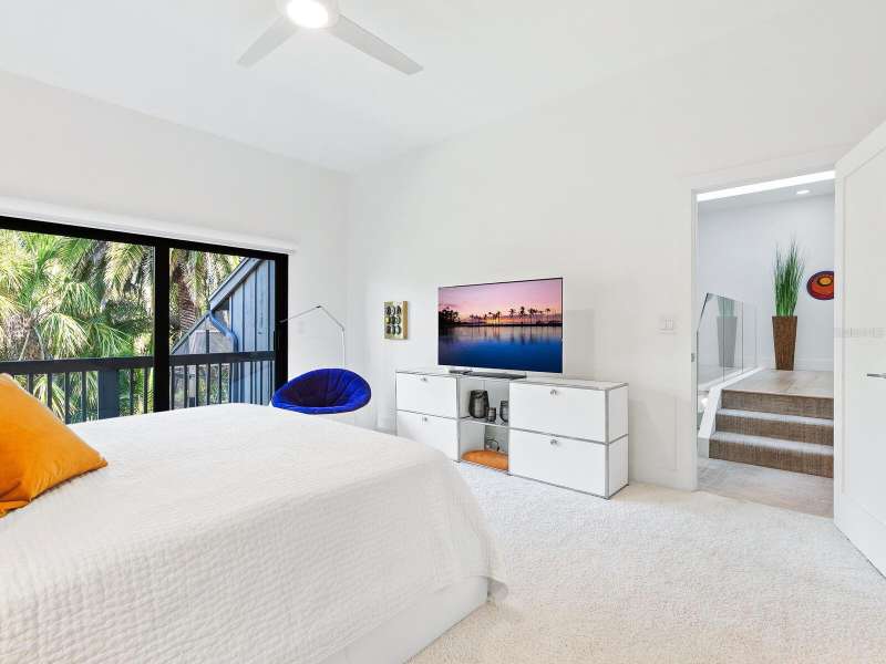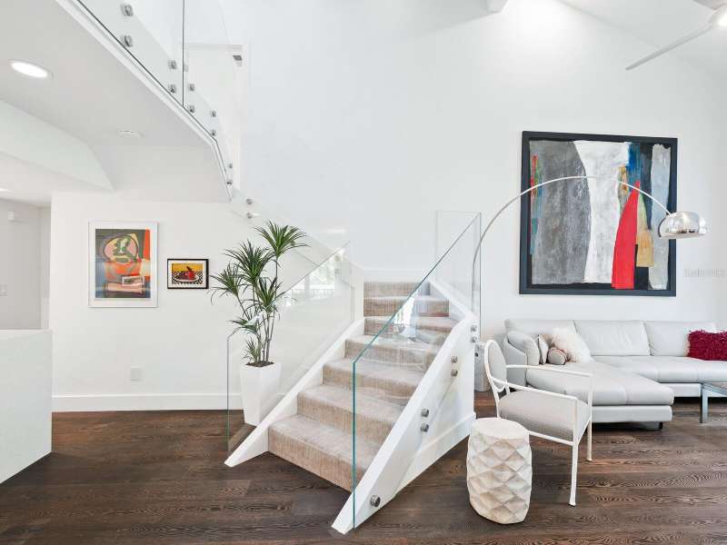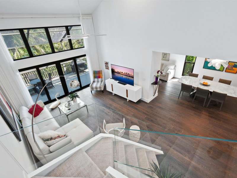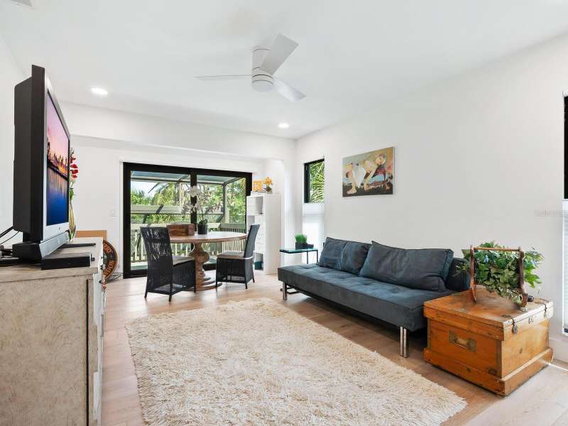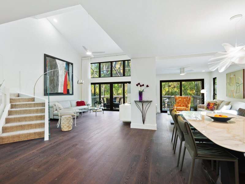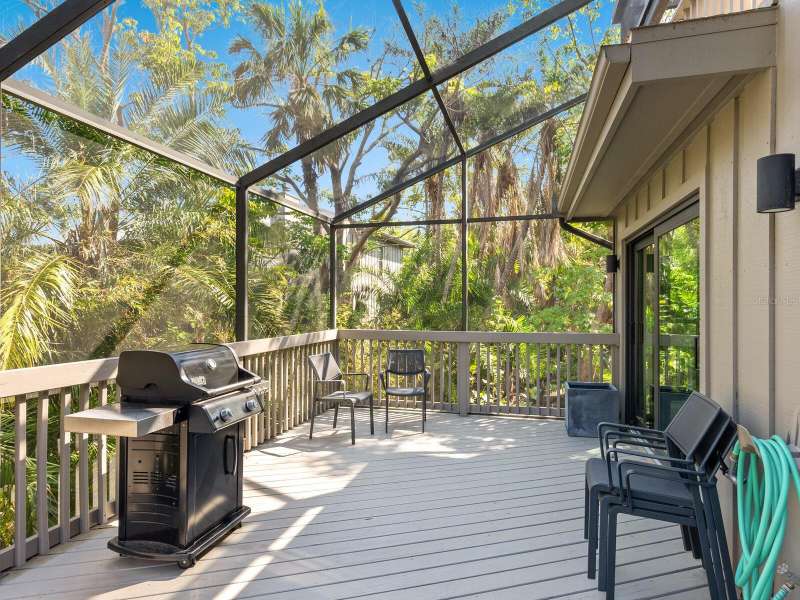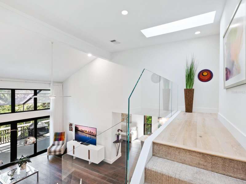 Take a look- this 3 bed, 2.5 bath treehouse is stunning- a top-quality renovation enhanced with sleek sophisticated contemporary styling. Every detail was thought of and no expense spared- peace of mind is prioritized with hurricane windows installed throughout the residence, enhancing energy efficiency and reducing ambient noise. Upon entering you are captivated by the abundant light which bathes this modern, split floor plan, multi-level treehouse thanks to the “wall of glass” featured in the living room by the combination of expansive feature windows above the large sliding glass doors. Open the sliding doors and you walk out to the sizable, screened deck, perfect for outdoor entertaining. The open-concept living area features a cathedral ceiling with sky-lights, a re-positioned custom staircase with glass sidewalls, all new LED lighting, new modern baseboards and engineered wood flooring throughout the first floor. Additional upgrades include all new interior doors, updated electrical outlets, switches, fans, and ceiling lighting fixtures. This treehouse has been expanded off the dining area is a retreat for casual living, as well as access to the outdoor deck. The beautifully remodeled kitchen boasts an expansive island with breakfast bar, a deep sink, white lacquer cabinets with plenty of storage, neutral quartz counter tops, and sleek stainless-steel Samsung appliances. Another expansion from the kitchen is convenient for casual dining or a workspace, adding versatility to this spacious and airy home. The primary bedroom has an open deck with an enchanting treehouse view, carpeted flooring, a walk-in custom California Closet, and redesigned ensuite with walk-in shower. The staircase, upstairs landing, and guest bedrooms have engineered wood flooring. The second bedroom's sliding doors lead to its open deck. The third bedroom has been expanded and creates an ideal retreat for your guests or as your own upstairs den/office. A walk-in closet offers more storage. The upstairs guest bath and lower-level powder room have been tastefully updated. Roof, exterior, and decks are maintained by the Treehouse Homeowner’s Association. A single car garage and laundry room complete this remarkable move-in ready home. The Landings is a gated community with 24-hour security located “West of the Trail” close to the revitalized Landings Shopping Center, Siesta Key, and Sarasota’s vibrant downtown. The community boasts a nature trail leading to the Intracoastal Waterway with a fishing pier and storage racks for kayaks. Membership to the Landings Racquet Club with tennis, pickle ball, gym with cardio and weight equipment, pool and spa, and two community rooms for all sorts of social functions is optional.