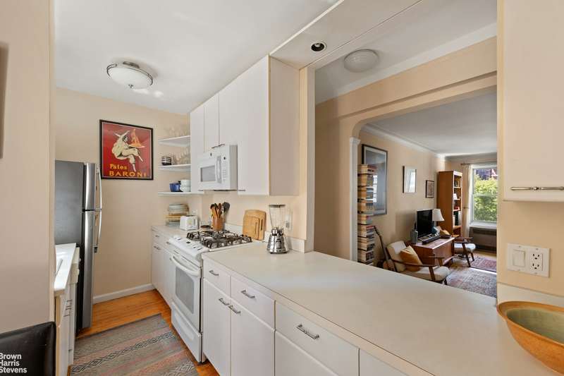 One enters into a spacious entry foyer, ideally suited for a home office or dining area. The graciously proportioned sunken living room has lovely light from a northern exposure. An oversized, windowed kitchen and windowed bathroom provide natural light and ventilation. The king-sized bedroom has two exposures and excellent closet space. Other apartment features include abundant storage, 8'8" ceilings, and oak hardwood floors.