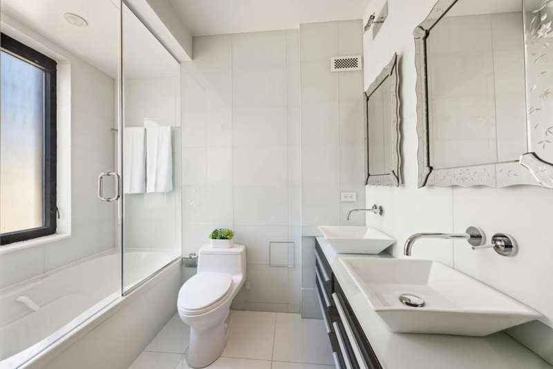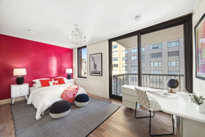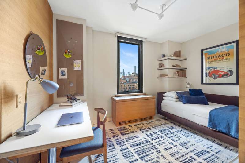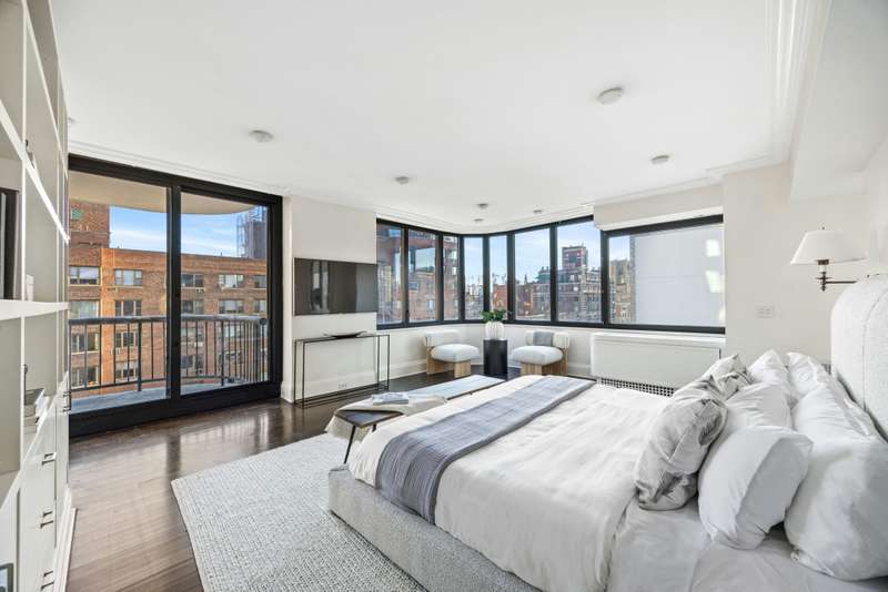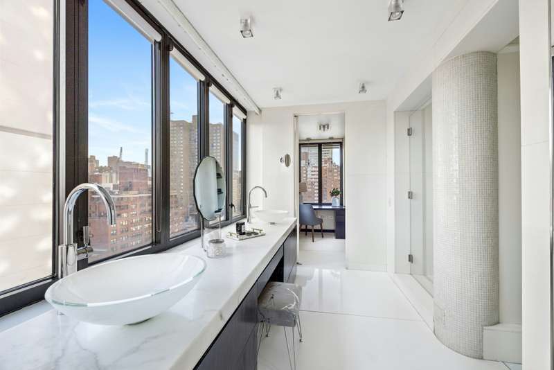 At the top of the stairs, you are once again greeted by sunlight from floor to ceiling windows, looking north to see Carl Schurz Park and east to see a sliver of the East River. This room makes an excellent den or media room. The primary bedroom suite feels unbelievably luxurious in size, with a dressing room, enormous walk-in closets, and a primary bathroom with a wall of windows facing south, double vanities, walk-in shower and yet another home office! The primary also has a balcony and curved windows facing south and east allowing the room to bask in sun.