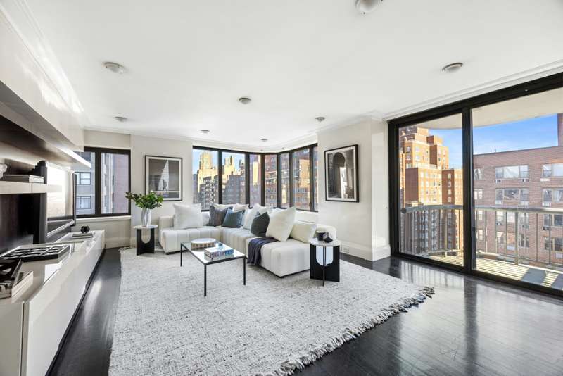Enter into the apartment from a semi-private vestibule into the expansive 40 foot wide double living room and dining room with its elegant glass and wood staircase in between. You are greeted by 3 exposures from the moment you walk in, and 2 balconies overlooking the tranquil East End Avenue. There are dark wood floors, crown and base moldings and enormous windows throughout.