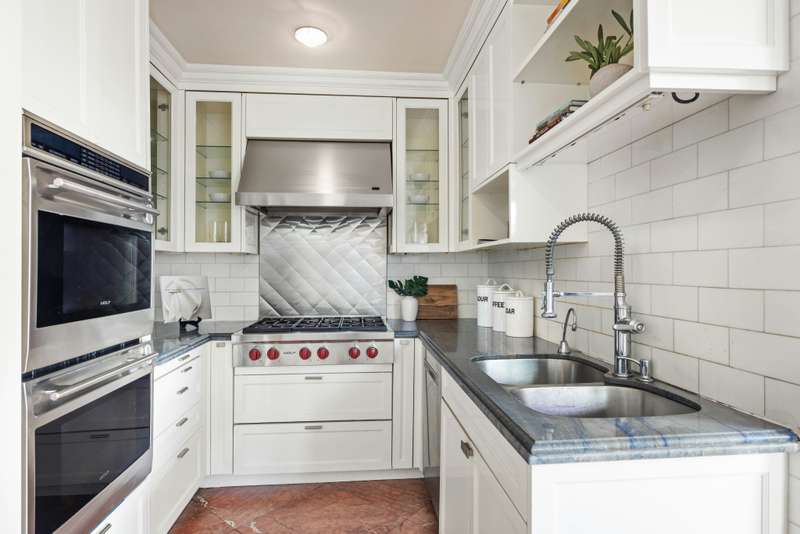 The sunny corner eat-in kitchen is perfect for any chef or home cook, replete with 2 Wolf ovens, a Wolf 6 burner range, Bosch dishwasher, two large soaking sinks, as well as a pantry sink,Marvel wine cooler, and an extra-large Sub-Zero refrigerator as well as a small mini Sub-Zero fridge. The kitchen fits a large table or island, has a walk-in pantry closet, plentiful storage, a little bench, and a home office. A powder room and a small staff room with its own bathroom complete the lower level.
