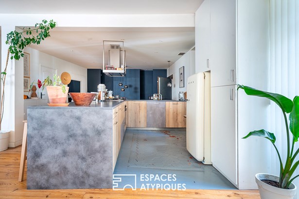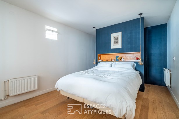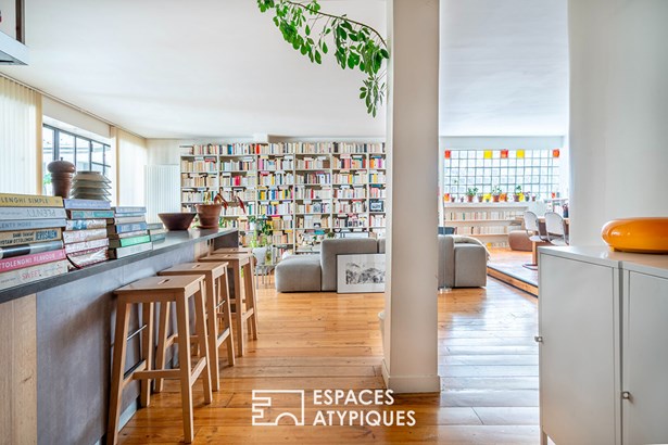 Located near Montreuil Town Hall, this 110.59 m2 (Carrez law) loft, redeveloped from a former carpentry workshop, boasts generous volumes in a warm and contemporary atmosphere.