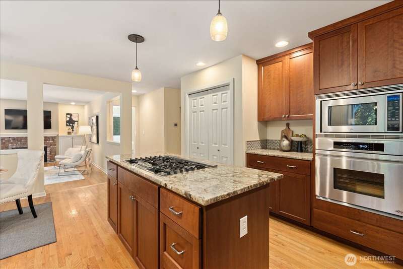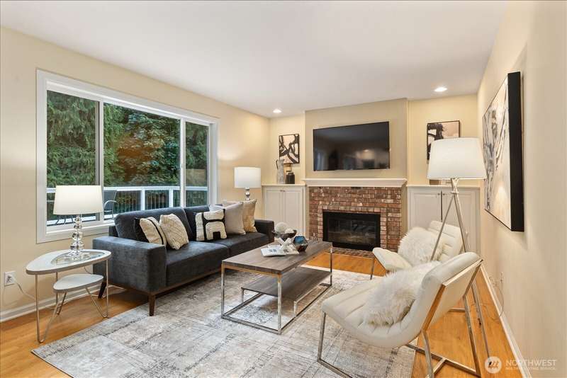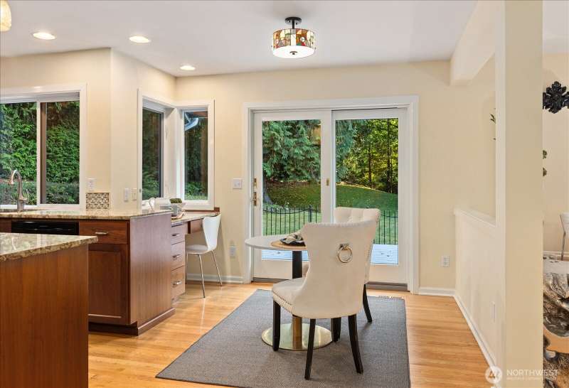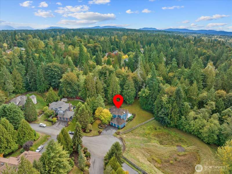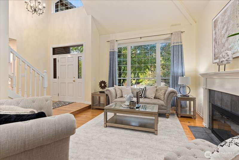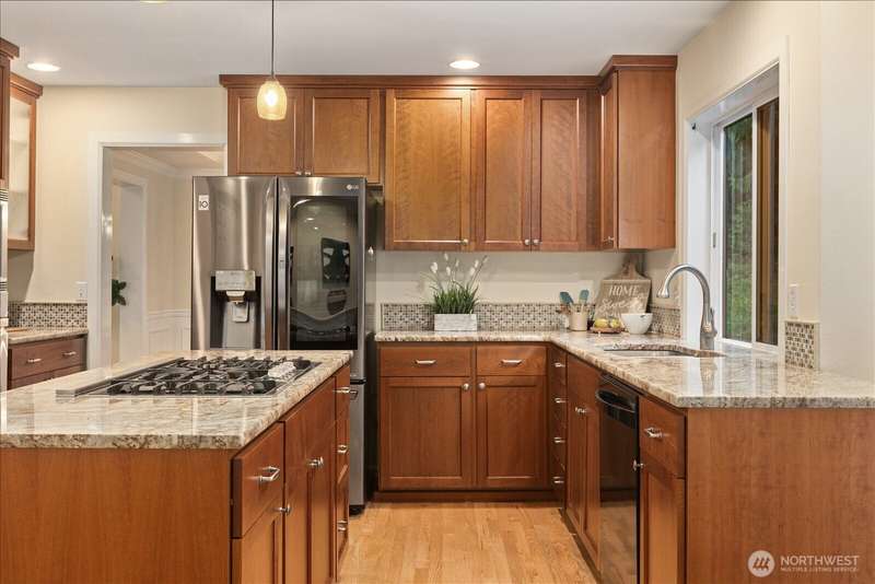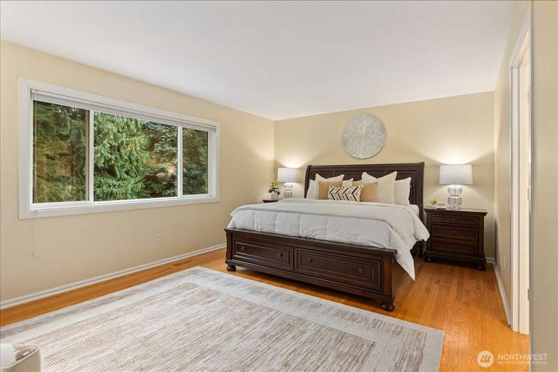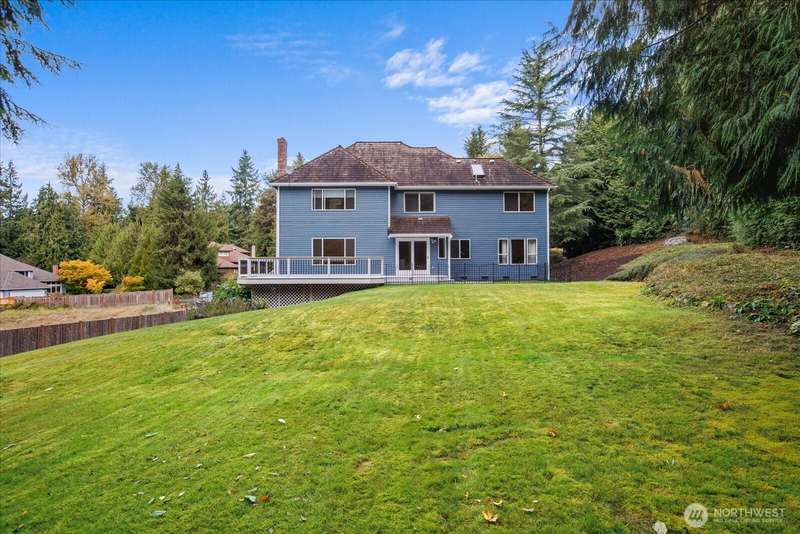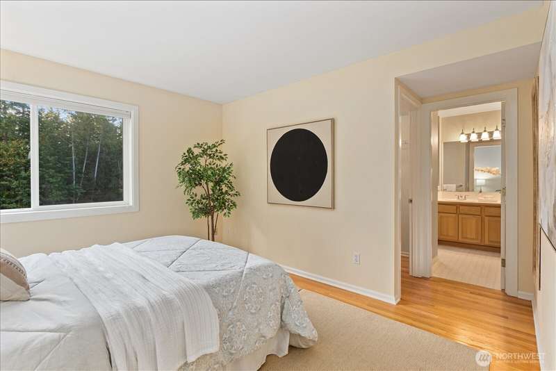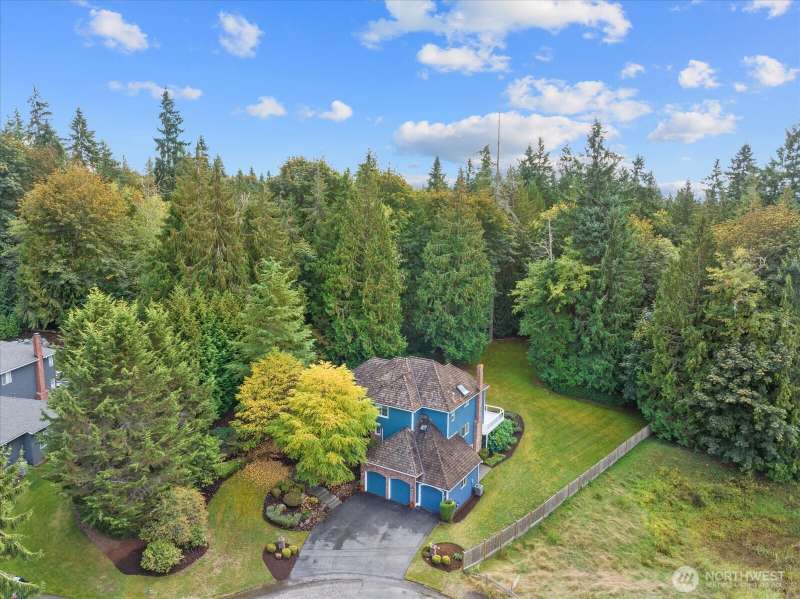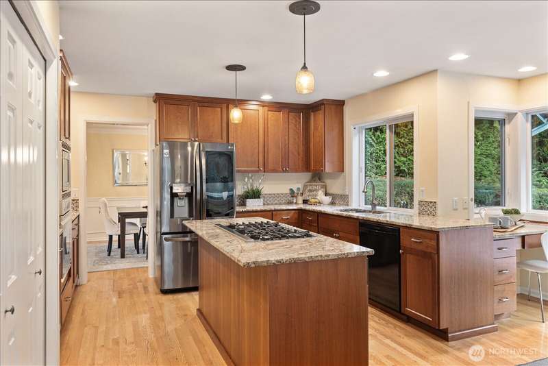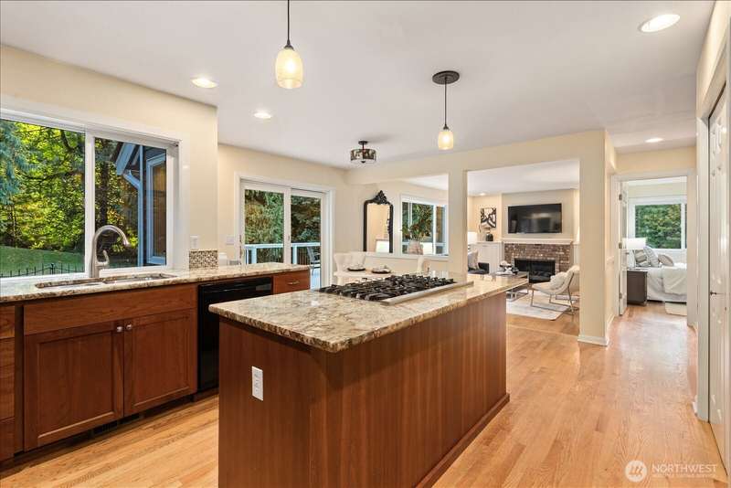 PRICE REDUCED $65k!! Tucked away at the end of a private lane, this beautiful 4 bedroom, 3.5 bath home offers the perfect blend of privacy and elegance. Located in a sought after area, this home invites you to a park-like setting on 1.18 acres next to a greenbelt. The well designed floorplan features hardwood floors throughout, large windows, skylights, granite counters, stainless appliances and 2 cozy gas fireplaces & large 3-car garage. A spacious primary suite includes a 5-piece bath, plus an ensuite bedroom on the main floor for guests. The lower level boasts a huge bonus room, perfect for a home gym or media space. This home has been well maintained and offers a peaceful retreat just minutes from all that the Eastside has to offer!