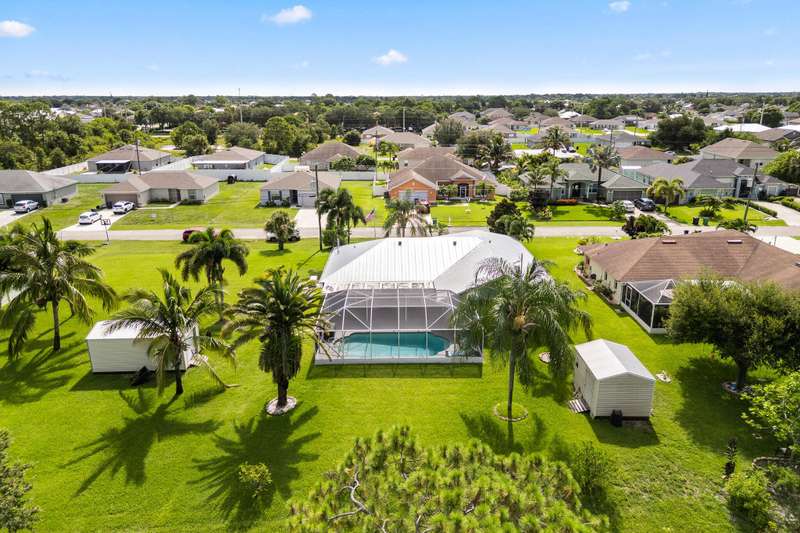 Built in 2009, this Port St. Lucie concrete block home offers 2,126 sq. ft. of comfortable living on a rare 0.46-acre double lot with no HOA. Featuring a 2021 metal roof, impact doors and windows and a Generac generator. It's built for peace of mind. The spacious open-concept kitchen boasts granite countertops, seamlessly flowing into bright living areas. Enjoy Florida living with a large screened-in pool, perfect for relaxing or entertaining. The two-car garage and multiple sheds provide ample storage, while the expansive lot offers room to spread out. A true combination of comfort, durability, and space-ready to welcome its new owner!