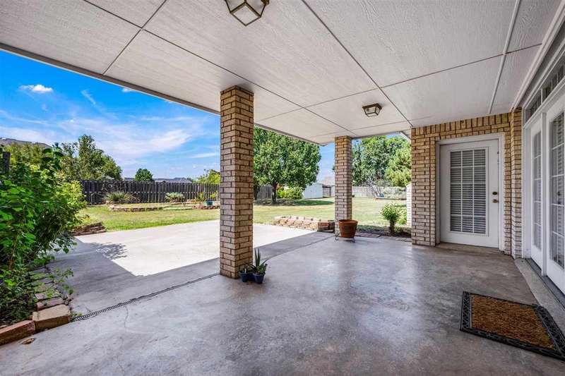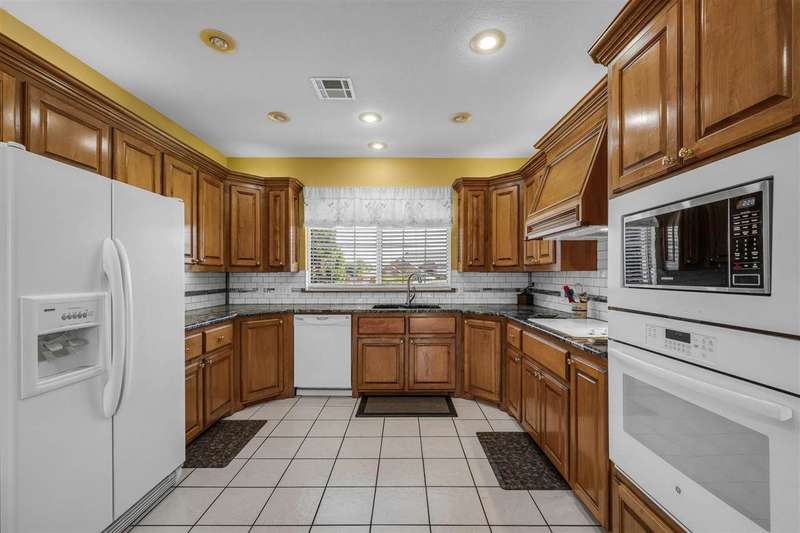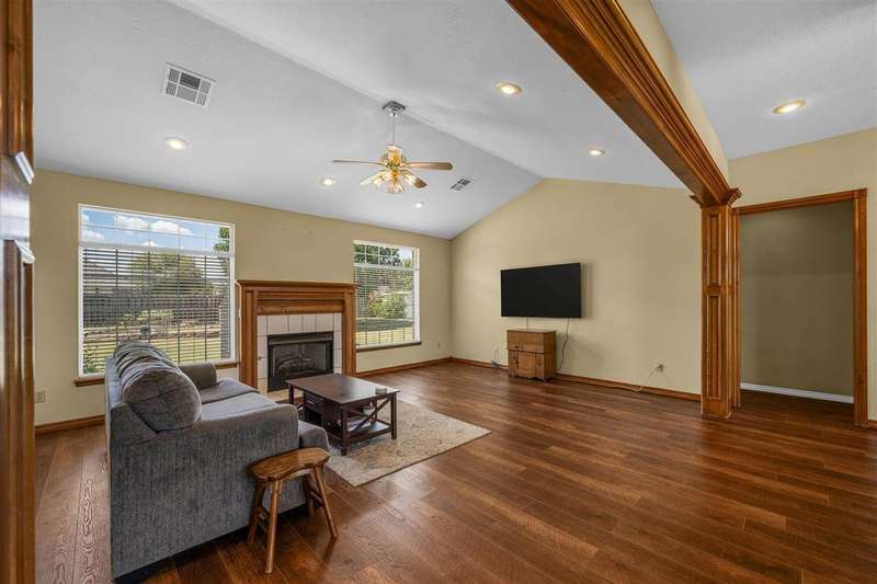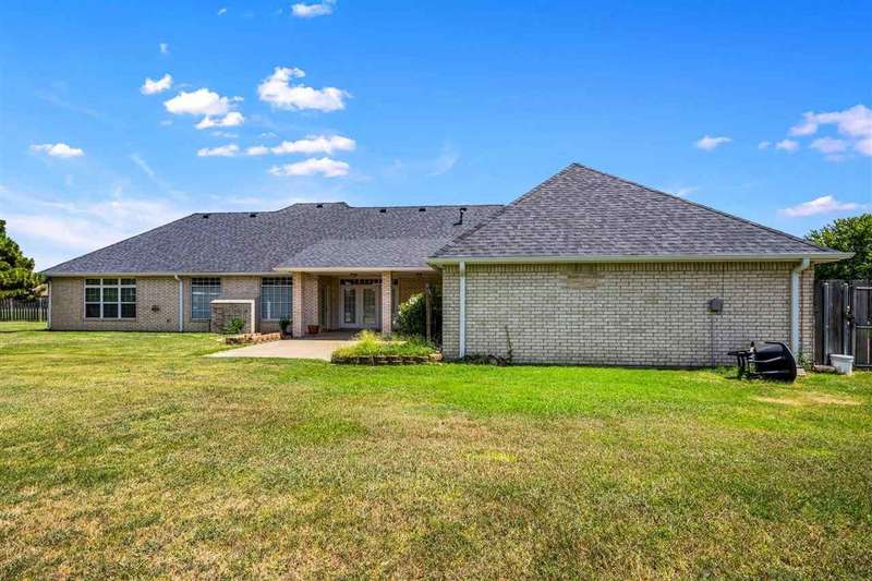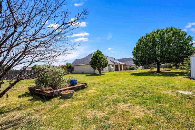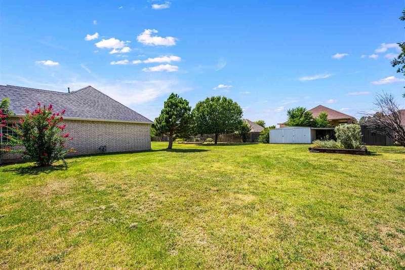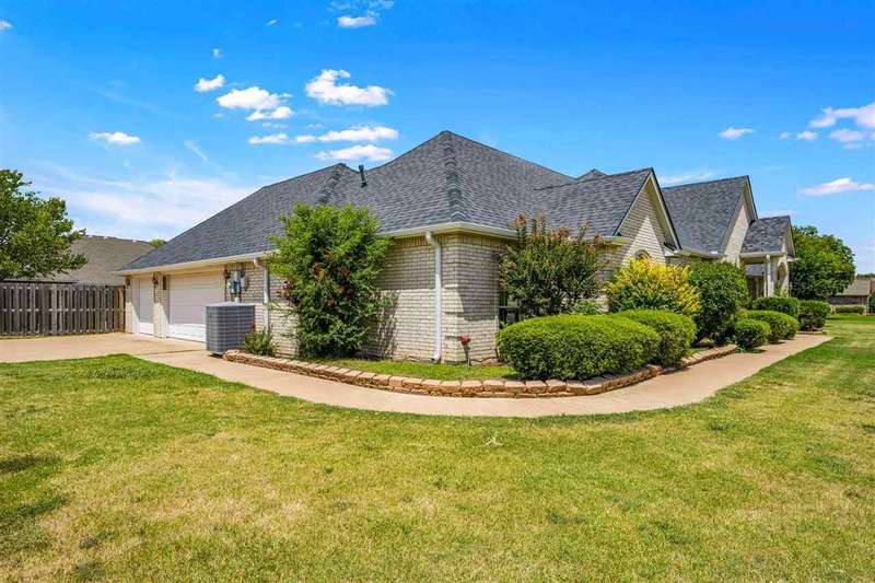Welcome to this stunning corner-lot home offering spacious living and exceptional features throughout! This beautifully maintained property boasts 3 generous bedrooms, 2.5 bathrooms, and a 3-car garage. You'll love the striking curb appeal and durable luxury vinyl plank flooring that runs throughout the entire home including all bedrooms with ceramic tile in the kitchen and bathrooms. Step inside to find a formal dining room, an expansive open-concept living area with soaring ceilings and a cozy gas log fireplace, and a well-appointed kitchen featuring granite countertops, custom cabinetry, pull-out drawers, three lazy susans, and built-in baking racks. There's also a casual dining area and a large bonus room off the kitchen to be used as a second pantry, or utility room complete with a built-in ironing board. The private primary suite is a true retreat, offering a spacious bedroom, en-suite bath with dual vanities, a corner whirlpool tub, separate shower, and two walk-in closets. Enjoy outdoor living with a covered patio, a storm shelter for peace of mind, and a fully fenced yard with a wood privacy fence. Contact Tiphanie Murphy@580-512-2135