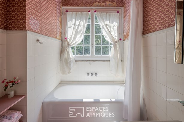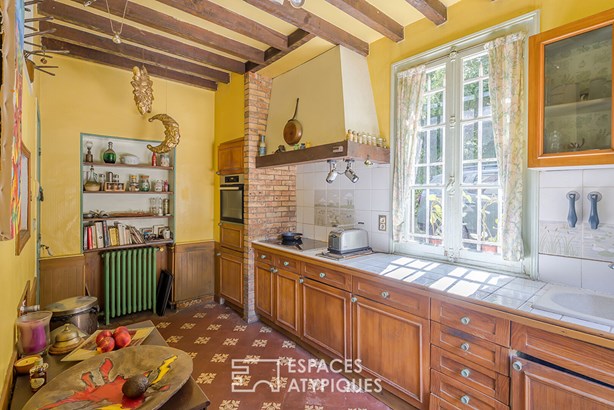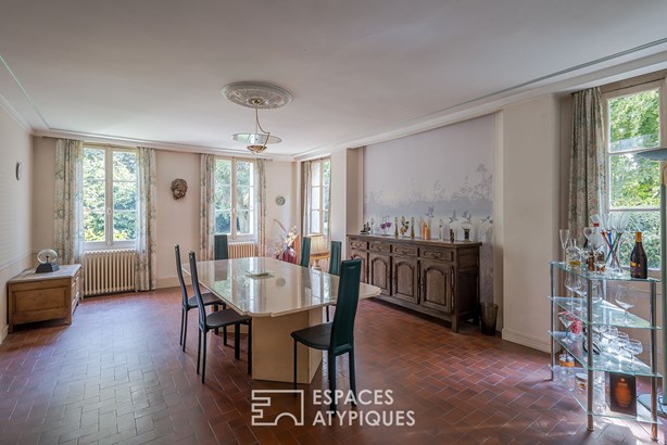 In the other wing separated by the entrance hall, a beautiful dining room with a tiled floor in burgundy monochrome overlooks the kitchen.