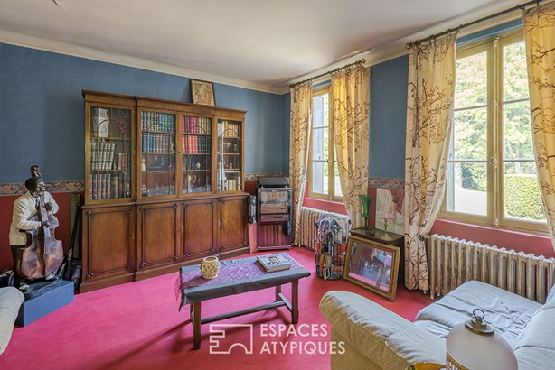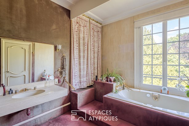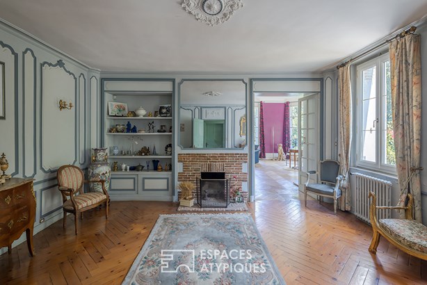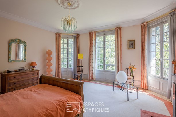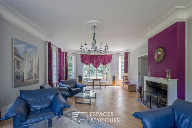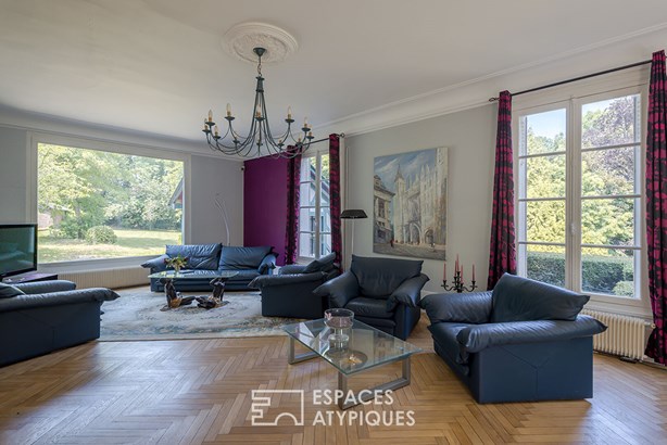 The entrance on the travertine floor leads to an intimate 22m2 living room, with solid Hungarian point parquet flooring and its brick fireplace, with in its continuity a through living room including a 55m2 period fireplace. This living room is dotted with many windows offering a multitude of views of the wooded park.