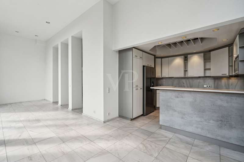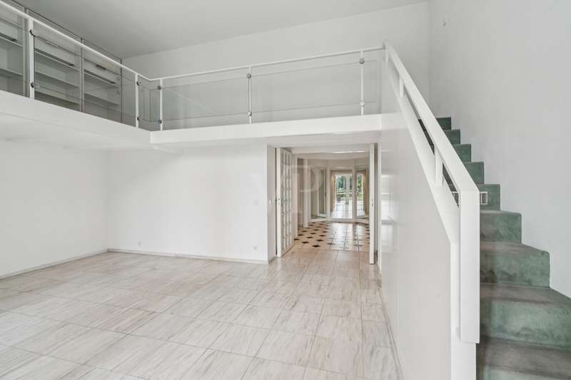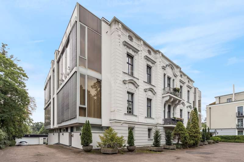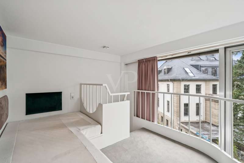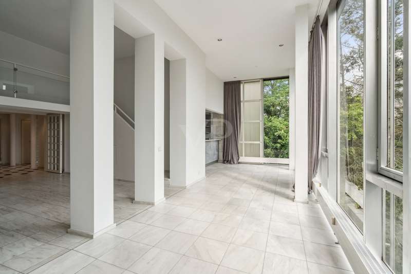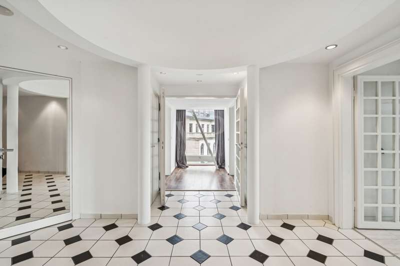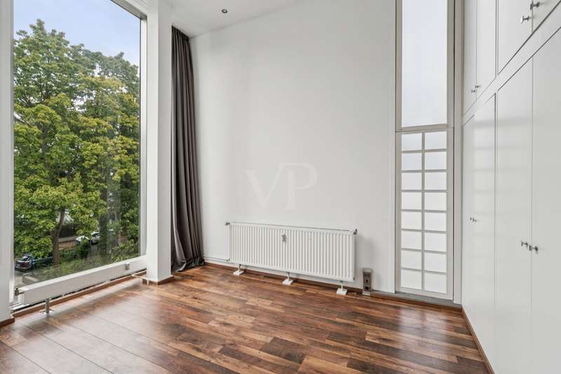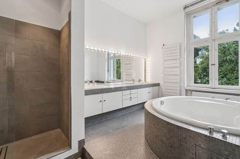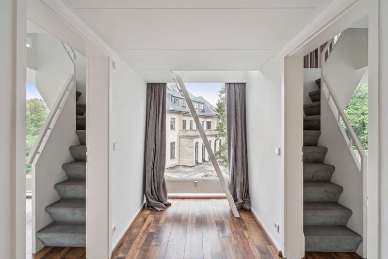 Stylish living, spectacular living - with a view of Lake Königsee This apartment is no ordinary home. It is a place full of character, history and atmosphere - a real architectural gem in the heart of Berlin's Grunewald forest, just a few minutes from Kurfürstendamm and yet nestled in soothing tranquillity and nature. Situated in a former hotel building dating back to 1897, a dream home that is second to none is revealed upon entering. Even the first impression is impressive: you step out of the elevator, walk along the red carpet towards the apartment, just like in a grand hotel, and then enter an apartment that surprises you at every turn. On around 154 square meters, impressive room heights of almost four meters merge with the finest furnishings and sophisticated design. At the center of the apartment is a breathtaking entrance hall with an illuminated dome, an architectural statement that lends the entire space an almost sacred calm. The adjoining living and dining area opens up to the south-east, flooded with light, and impresses with its gallery level, which not only creates new visual perspectives, but also offers space for art, music or very personal productions. White marble floors from Greece lend the central living area a cool elegance, which is stylishly complemented by custom-made built-in wardrobes and high-quality, white lacquered double doors. Electric blackout blinds, integrated almost everywhere, provide comfort at the flick of a switch. The open-plan kitchen is more than just a functional space - it is a meeting place. The view out over the lush greenery and the glistening Königsee makes cooking a special experience. The floor plan also follows a clear, well-thought-out structure: the private parents' area is acoustically shielded and comprises a spacious bedroom with a floor-to-ceiling built-in wardrobe, an elegant dressing room with mirrors and a luxurious master bathroom with two washbasins set off by lamps - just like in the make-up area of a theater! The highlight here is undoubtedly the centrally positioned, round bathtub. The spacious shower is also sure to impress. A separate area has been created for the children on two levels - ideal for separating sleeping and play areas. Guests will also find a comfortable retreat in this area. Even a sleeping area for an au pair has been thought of - a loving detail that shows how carefully the planning was done here. The meter-high glass façade in the living area is fascinating. The filigree spire of the Grunewald church rises above the surface of the Königsee - a picture that exerts a quiet fascination at any time of day. This apartment is made for people who are looking for something special. For individualists, aesthetes, visionaries. For all those who not only want to live in architecture, but experience it. Arrange a viewing appointment now - and be inspired by a home that offers more than just rooms. It offers atmosphere. Personality. And a story that you can continue to write.