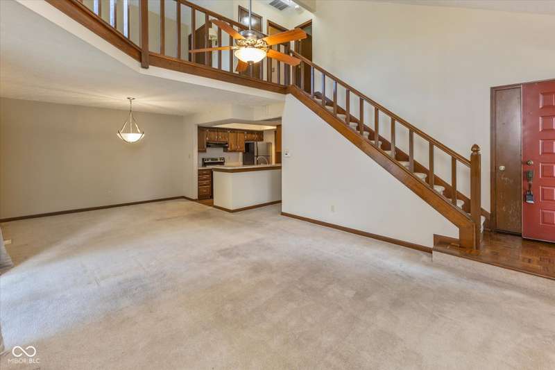 Welcome to your charming new home located in the heart of downtown Fishers! This low maintenance home features 1-bedroom, 1.5-bathrooms with 1,071 sq ft of living space offers a perfect blend of modern comfort and convenient living. Highlighted by soaring vaulted ceilings, the open-concept living space feels spacious, open, and inviting. The heart of the home is a stunning fireplace, perfect place for cozy evenings. The kitchen has beautiful corian countertops and breakfast bar plus the open flow into dining space perfect for entertaining. Upstairs features the primary bedroom with large walk in closet along with a loft which is a great space for a home office or easily converted to a 2nd bedroom. You will love how this home brings the living space to the outdoors. Enjoy coffee in the mornings on your new upper deck or enjoy evenings on your back patio. This home is designed with low maintenance in mind, with a perfect blend of comfort and style. Located in downtown Fishers, you'll have easy access to a variety of local dining options and shopping. Fishers provides an amazing farmers market and free concert and movie options for summer entertainment. Home has been updated with new windows and doors, Kitchen countertops, Appliances, just to name a few! Close to the Nickel Plate trail. Welcome home!