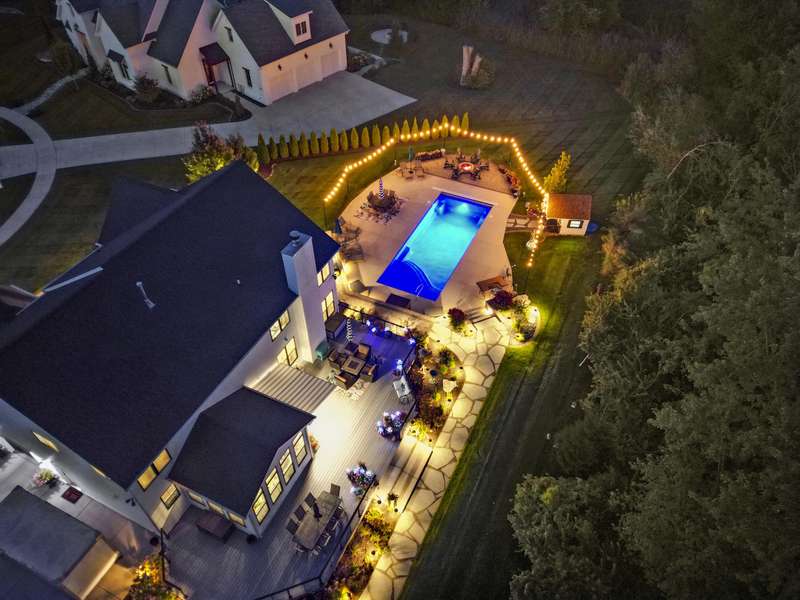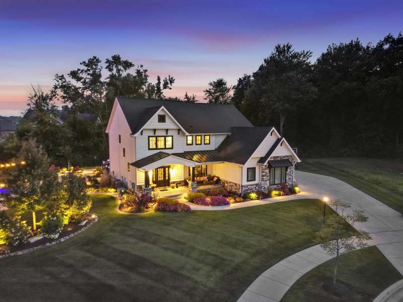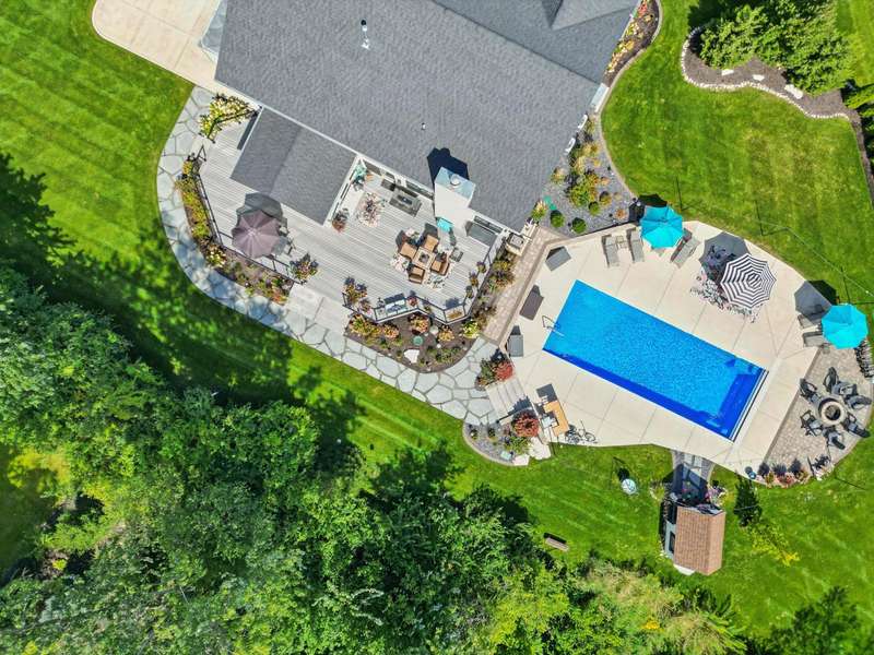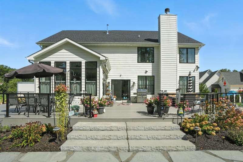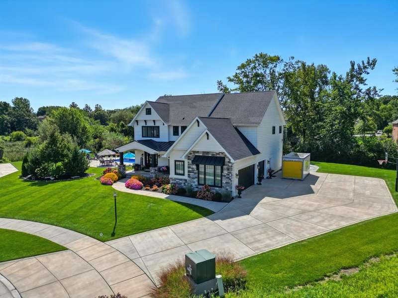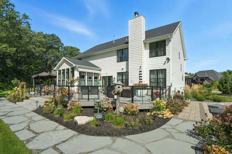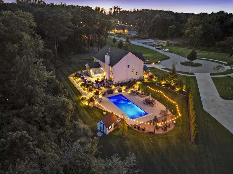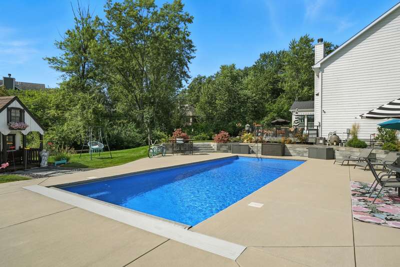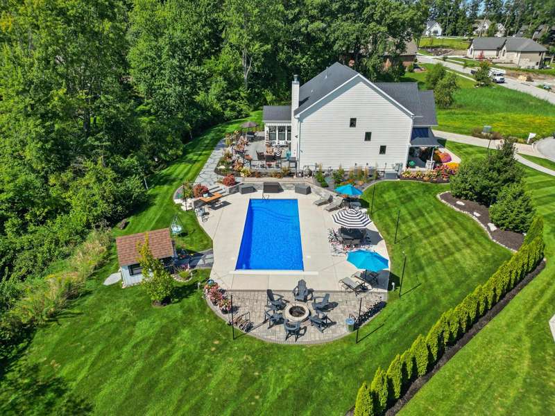 Welcome to this exquisite custom-built two-story home, perfectly situated on a serene .88-acre cul-de-sac lot, offering a peaceful and private wooded view that creates a tranquil atmosphere. As you approach the residence, you'll be greeted by a charming covered front porch, ideal for relaxing with a morning coffee or enjoying evening sunsets. Step inside to find an inviting foyer that seamlessly leads you into the great room, which features a stunning fireplace that adds warmth and ambiance, perfect for cozy evenings with family and friends. This space boasts a perfect blend of elegance and comfort. The open-concept kitchen is a culinary delight, featuring an oversized island that provides ample seating for gatherings, a spacious walk-in pantry, and a convenient mudroom. Sunlight floods the four-season room through an abundance of windows, creating a bright, airy space that's perfect for year-round enjoyment. The luxurious master suite is a true retreat, complete with an enormous walk-in closet, additional storage closets, and a spa-like master bathroom, ensuring your comfort and relaxation. The home also features three generously sized additional bedrooms and a well-appointed full bathroom, making it perfect for family living or entertaining guests. The main level is adorned with beautiful hardwood floors, adding warmth and sophistication. Step outside onto the expansive maintenance-free deck that wraps around the back of the home, complete with a powered awning to provide shade when desired, perfect for outdoor dining and entertaining. The professionally landscaped yard is nothing short of stunning, anchored by an inviting inground pool that serves as the focal point of the outdoor space. This backyard oasis features a cozy fire pit and a charming playhouse, coupled with ample grassy areas for hosting gatherings with friends and family. Unfinished basement is roughed in for future bath and finishing. 3.5 car garage is perfect for all your storage!