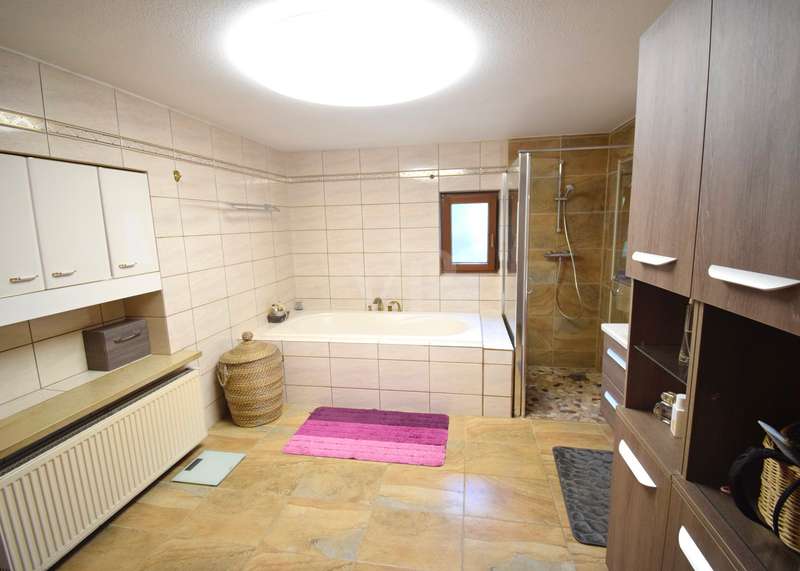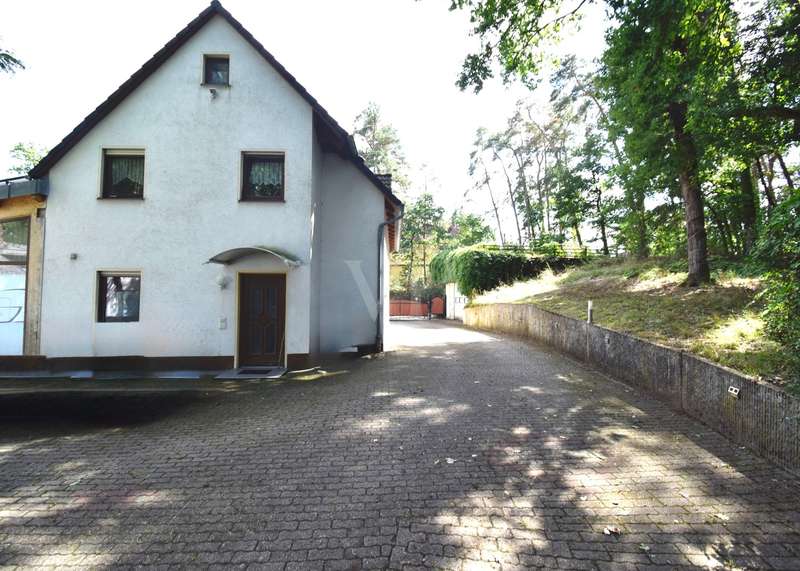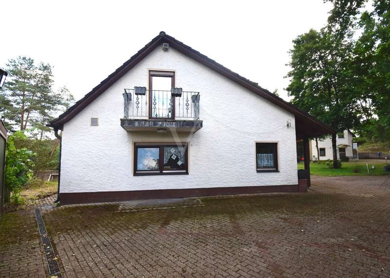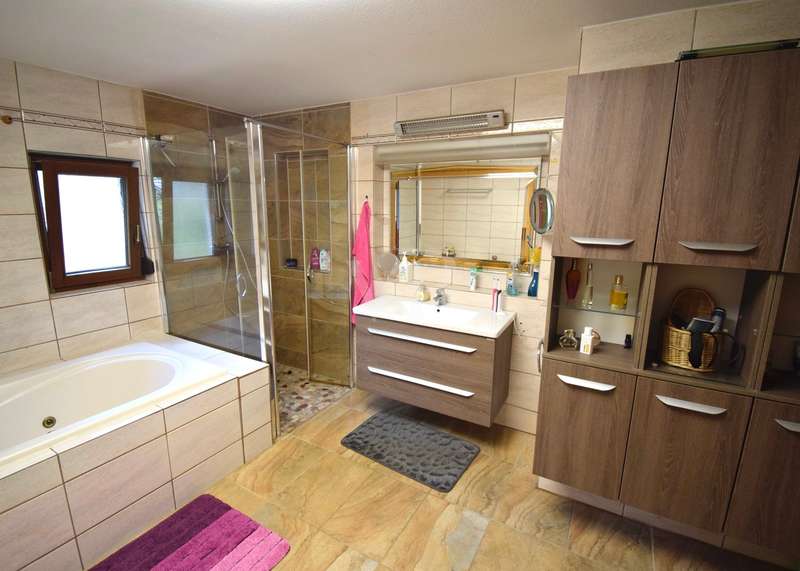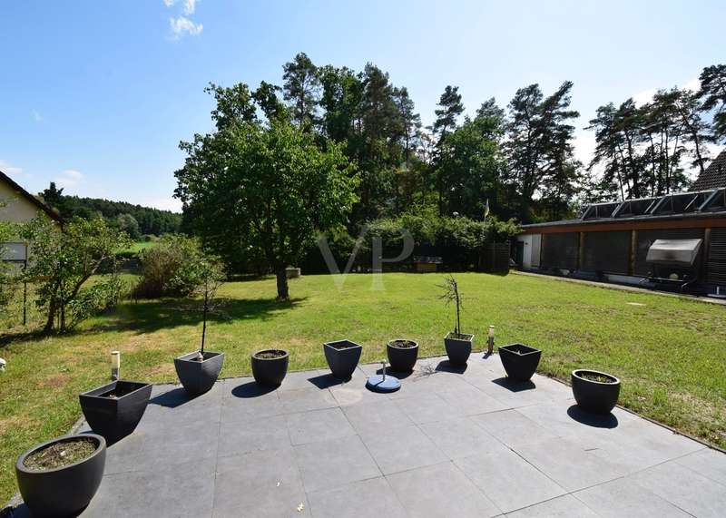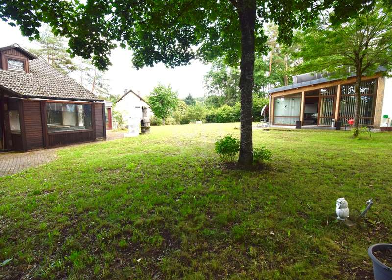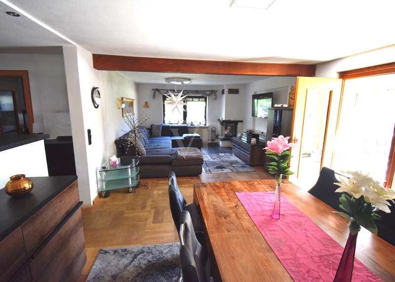 This property offers a rare opportunity to acquire a spacious plot in an almost secluded location. The main plot comprises approx. 1,931 m², supplemented by a directly adjoining wooded plot of approx. 1,383 m², which guarantees additional peace and privacy. There are two residential buildings on the plot, one of which has a spacious, integrated wellness area. The extensive garden is laid out like a park and offers a wide range of opportunities for recreation and leisure activities. The property is characterized by upscale furnishings, well thought-out floor plans and a particularly pleasant living ambience. It is ideal for sophisticated living, multi-generational use or the combination of living and working in a natural environment. The main house was built in 1945 and extensively renovated and extended in 1995. The property is in a well-kept condition and offers a well thought-out room layout on two levels. On the first floor there is a kitchen, a daylight bathroom and a spacious living and dining area with an integrated bar. The living area has a fireplace and is complemented by a conservatory, which provides plenty of natural light and a beautiful view of the outside. A further bedroom on the first floor offers additional flexibility of use. The upper floor comprises a spacious master bedroom with two separate dressing rooms, a modern shower room and a further room suitable as a children's room or office. There is access to a balcony from this room. Heating is provided by an oil-fired central heating system. The building has a full basement and thus offers additional usable space for storage, technology or hobbies. House 1 was built in 1995 and is in a well-kept condition. On the upper floor there is a well-designed residential unit consisting of a large living and dining room, a bedroom and a bathroom. The apartment is ideal for use as a granny apartment or for renting out. An indoor pool is integrated on the first floor, which is currently covered with a vinyl floor and used as additional usable space. The complete swimming pool technology, including counter-current system, softening and salt system as well as solar support, is housed in the basement. A spacious wellness area with kitchen, relaxation room, steam bath and changing area offers a variety of uses for relaxation and leisure activities in your own home. The building is heated by an oil-fired central heating system, also located in the basement. The property has 5 garages, including a large garage for mobile homes.