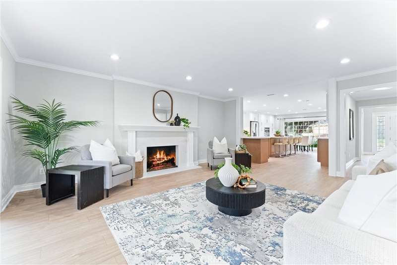 At the heart of the home is a stunning chef's kitchen, featuring quartz countertops, a large center island with bar seating, stainless steel appliances, soft-close cabinetry, and a full-height designer backsplash. Light pours into the open living and family rooms, enhanced by recessed lighting, crown molding, and a cozy fireplace.