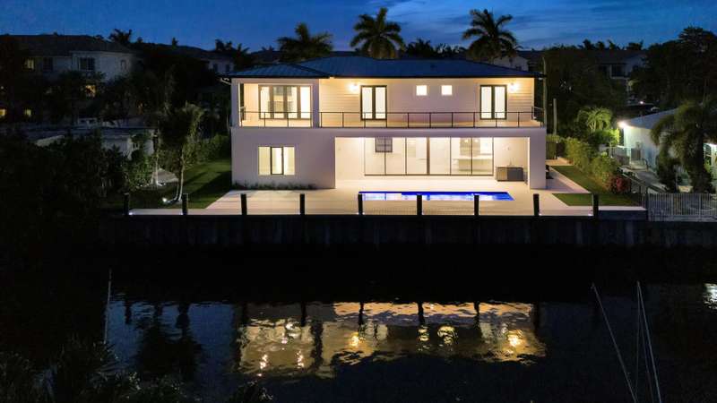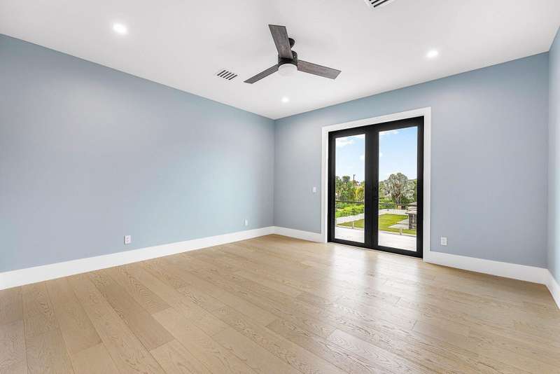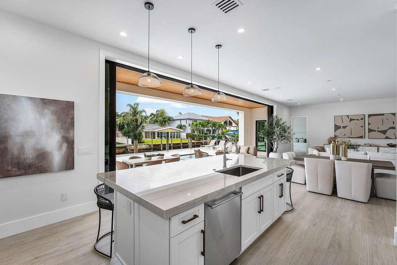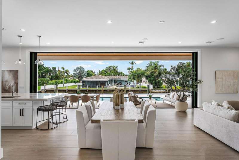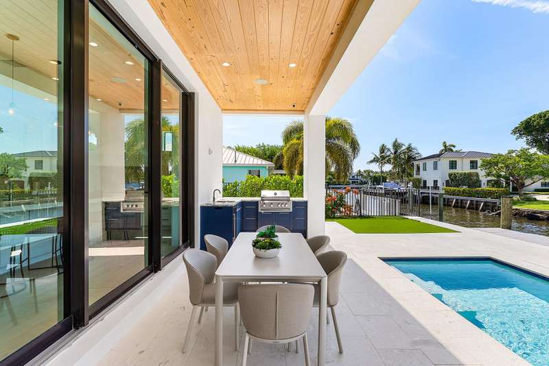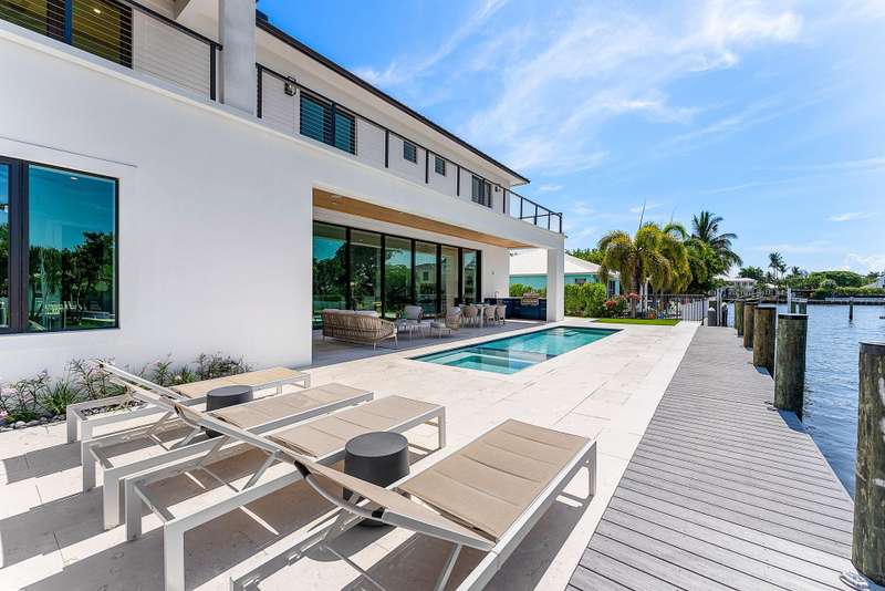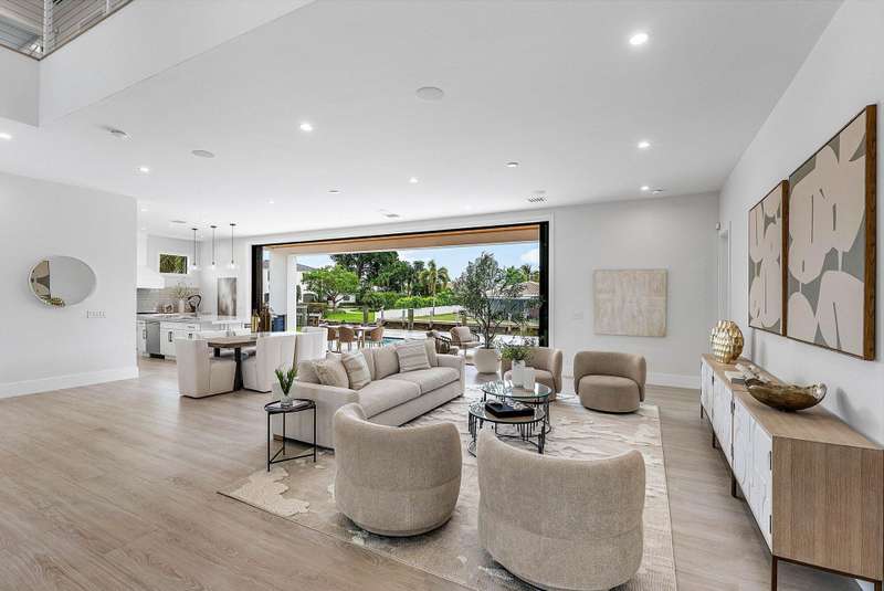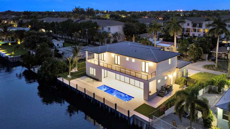 Welcome to 101 feet of direct waterfront on a private road in unincorporated Delray Beachs coveted 33483. This brand new residence offers a new seawall and dock, 5 bedrooms, 7 bathrooms and 5644 total sqft (4621 under air) with thoughtful spaces for work, play, and relaxation.Beautifully designed kitchen featuring a full Thermador appliance suite--6-burner dual fuel range with griddle, double oven, and sleek finishes flowing effortlessly into the expansive living and entertaining space where natural light pours in from every angle.Giant pocket sliders disappear like a curtain of glass blending indoor comfort with outdoor living. Step onto the covered loggia with a full summer kitchen, built-in grill, bar seating, cabana bath and outdoor shower--perfect for entertaining. The saltwater pool and spa are surrounded by travertine decking with expansive turf side yard offering a polished, low-maintenance outdoor retreat. Upstairs, the primary suite is a true sanctuary complete with a morning wet bar, a spacious covered terrace with wide water views and a luxurious bathroom with soaking tub, dual vanities, dual showerheads and two oversized walk-in closets. With space for a gym, studio, or office and an elevator for added convenience, this home brings together style, function and waterfront elegance in one unforgettable package.