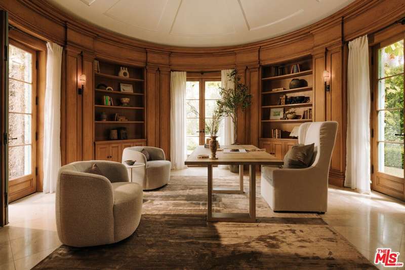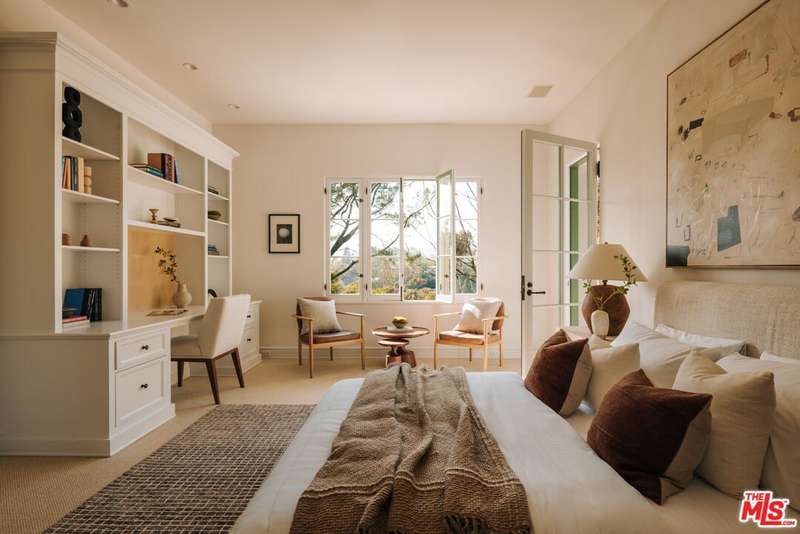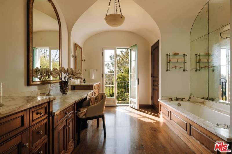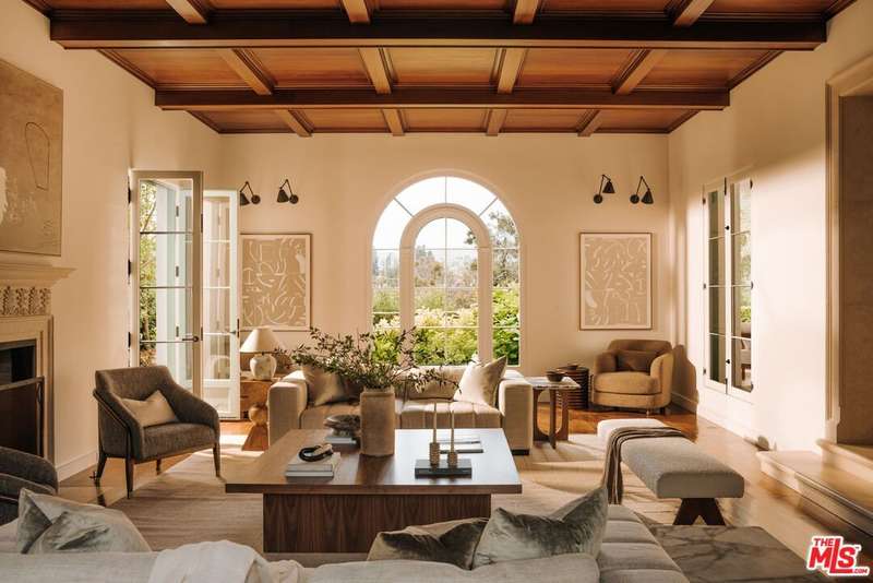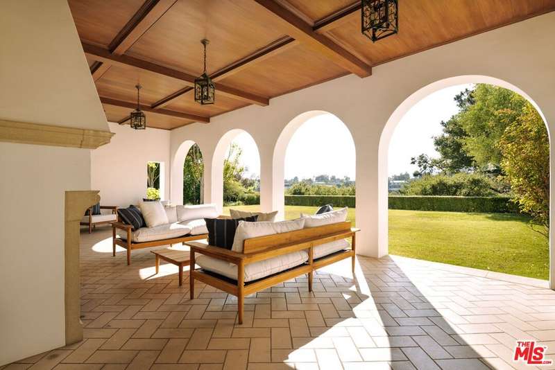 Brand new look!! This stunning California Mediterranean residence, nestled in the sought-after street of the Pacific Palisades' Riviera neighborhood, presents a rare opportunity to own one of the Westside's most exquisite properties. Crafted by acclaimed architect Thomas Proctor, this timeless home boasts meticulous attention to detail in its finishes, windows, arches, wrought iron gates, fireplaces, and more, appealing to the most discerning of buyers. Embracing the allure of Mediterranean-style architecture bathed in sunlight, it seamlessly blends Californian sensibilities with balconies, patios, porticos, and a captivating loggia that offers sweeping panoramic vistas across the canyon to the mountains. The outdoor living area, featuring a limestone fireplace and heated floors, becomes a haven for enjoying breathtaking sunsets. A splendid vaulted gallery leads to a grand living room on one side and an elegant dining room on the other. A walnut-paneled circular office/library stands as a private retreat, connected to the entry courtyard. At the heart of the home lies a den/family room with a limestone fireplace, complemented by arched doors opening to the loggia, yard, or kitchen. The breakfast area, adorned with a raised fireplace, and a spacious kitchen, equipped with a central island, cater to culinary needs with grace. Upstairs, the primary suite, accompanied by two walk-in closets and a spa-like bath, shares in the serene, breathtaking views. Additionally, three generously sized ensuite bedrooms and a gym occupy the upper level, while an extra bedroom resides downstairs. The residence boasts four zones of HVAC, a three-car garage, an outdoor shower, and a wine cellar, ensuring both luxury and practicality.