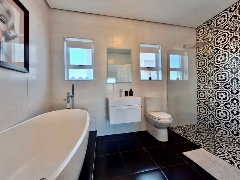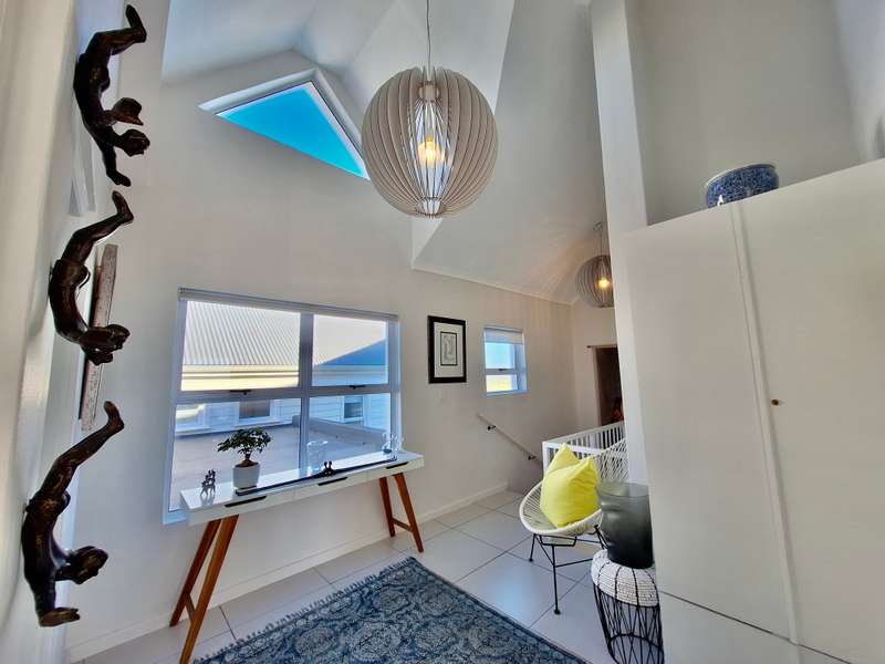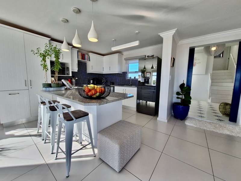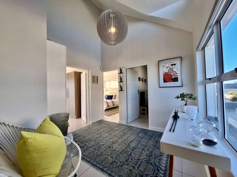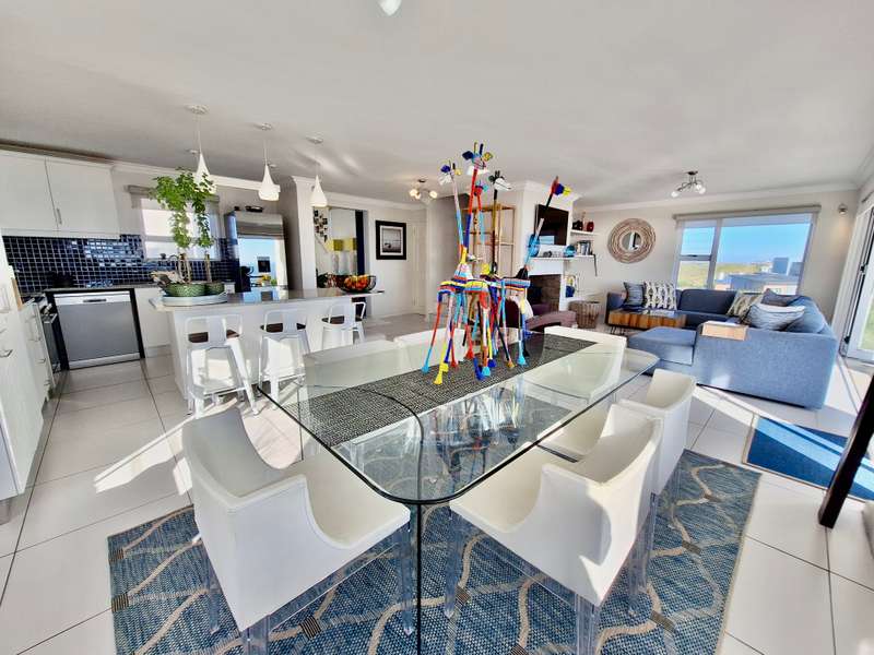 Perched on a hill with panoramic views of the Atlantic Ocean, Dassen Island, and Table Mountain, this beach house offers a front-row seat to nature's beauty. First Impressions: Step through the garden gate into a vibrant, fragrant sanctuary. A charming entrance hall sets the stage for the elegance and tranquility within. Main Living Area: Open-plan design with seamless flow between kitchen, dining, and lounge. Cozy fireplace for intimate gatherings. Folding stacking doors open to a spacious patio with breathtaking ocean views and lush greenbelt vistas. Bedrooms: Second Level: Two sea-facing bedrooms (one en-suite), each with balcony access for stunning sunrise and sunset views. Two additional en-suite bedrooms, offering luxurious comfort and privacy with views over endless Fynbos. Private Flatlet: Self-contained retreat with a braai/fire place area, kitchenette, and deck overlooking the sea and garden. Ideal for guests, extended family, or rental income. Practical Features: Double garage with integrated laundry and workstation. Guest powder room. Solar-powered backup electricity for uninterrupted living. Finishing Touches: Modern tiled finishes. Quirky, stylish bathrooms. Thoughtfully designed spaces for relaxation and entertainment. This hilltop retreat isn’t just a home—it’s a lifestyle. With its perfect blend of luxury, functionality, and natural beauty, it’s your ticket to the ultimate coastal dream.