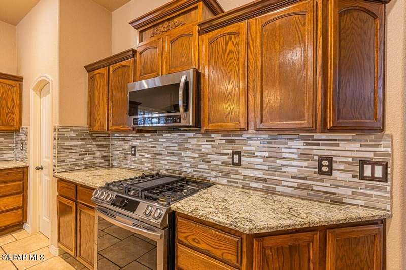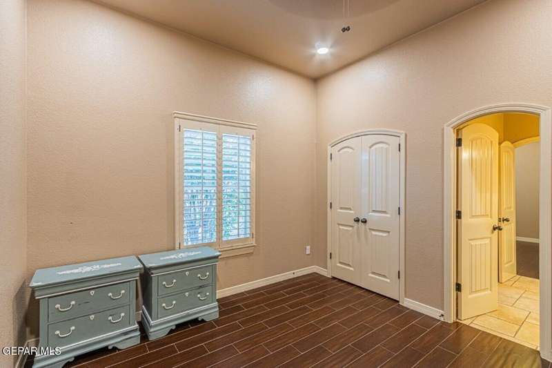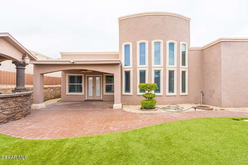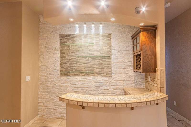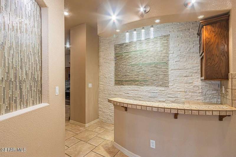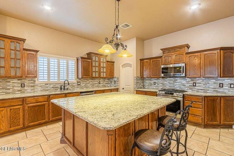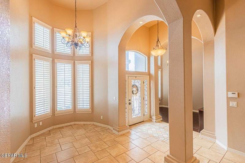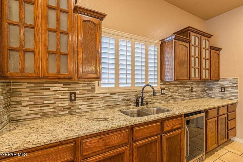 From the moment you step through the door, this stunning home makes a statement with its soaring 16-foot ceilings and elegant finishes throughout. Built by Fortune Homes, this one-of-a-kind property blends style, comfort, and functionality in all the right ways. Custom bar area brings a touch of luxury to your hosting game Guests will appreciate the convenient half bath, while the secondary bedrooms share a Jack & Jill bathroom. The oversized primary suite is a true retreat with high ceilings, a jetted tub, dual vanity, tiled walk-in shower, and large walk-in closet. No carpet here-tile floors throughout! The kitchen features a large island, stainless steel appliances, wine fridge, and built-in bar, ideal for entertaining. Laundry room includes a handy sink. Step outside to your fully landscaped backyard oasis-complete with an outdoor kitchen setup (just add your grill!) and a storage shed. Plantation shutters throughout add the perfect finishing touch. Schedule your tour today!