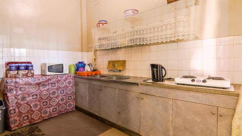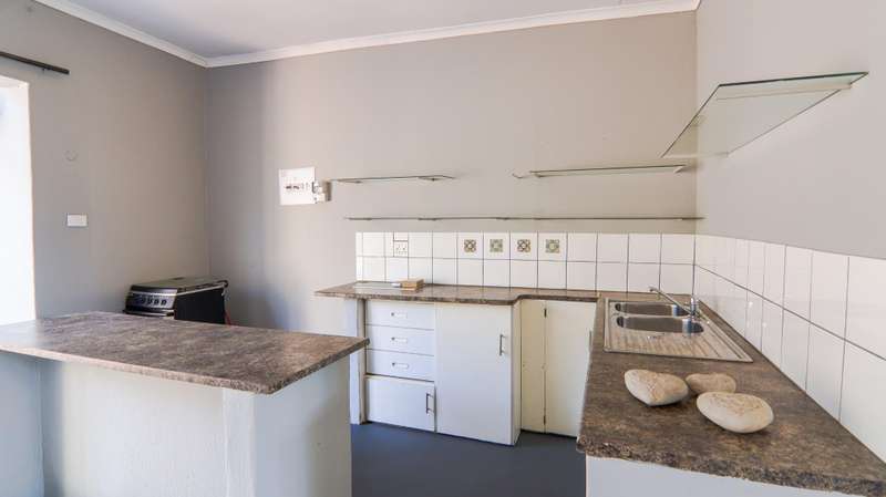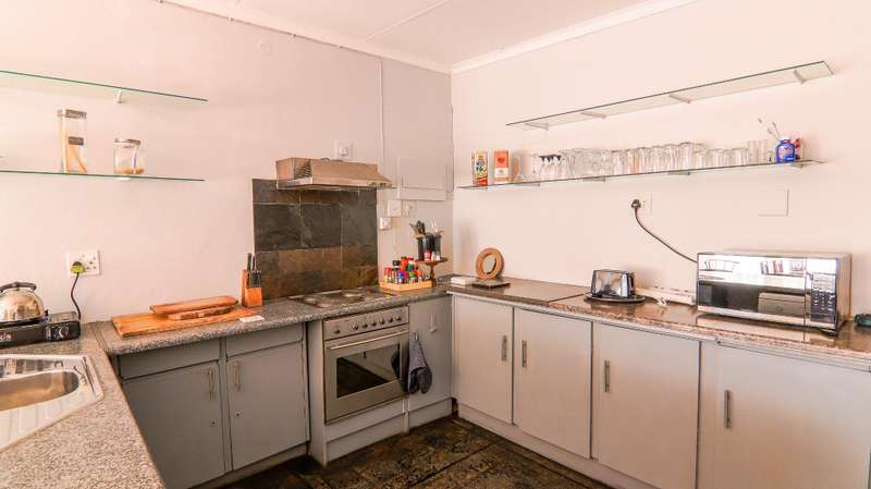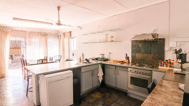 Spacious kitchen with ample cupboard space and a sliding door leading out onto the swimming pool and lapa.