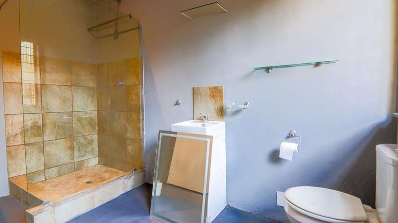 Separate bedroom with walk-in bathroom consisting of a shower, basin and toilet.