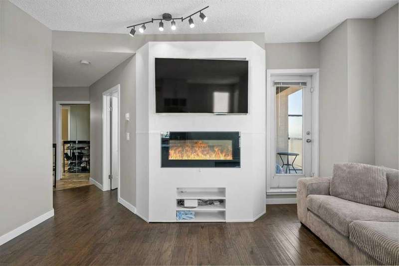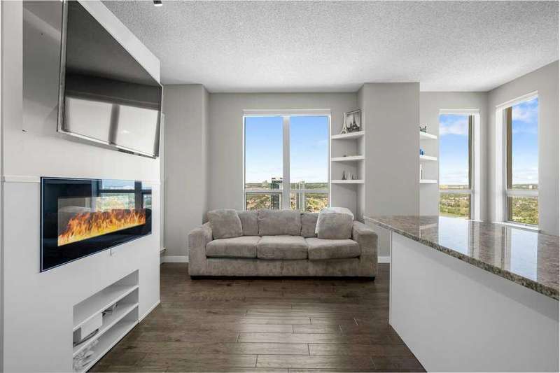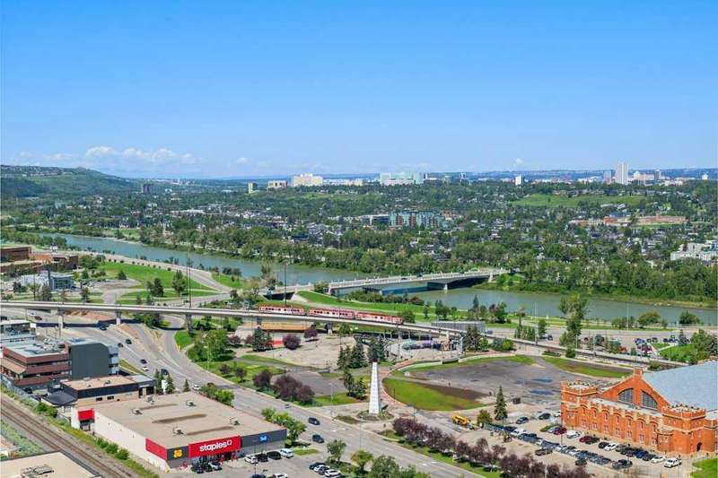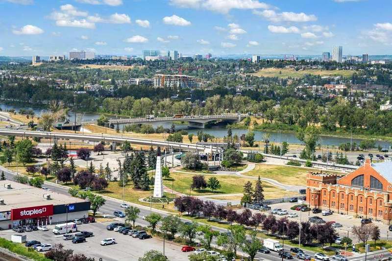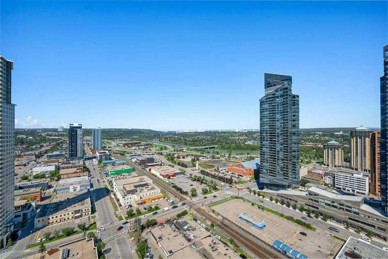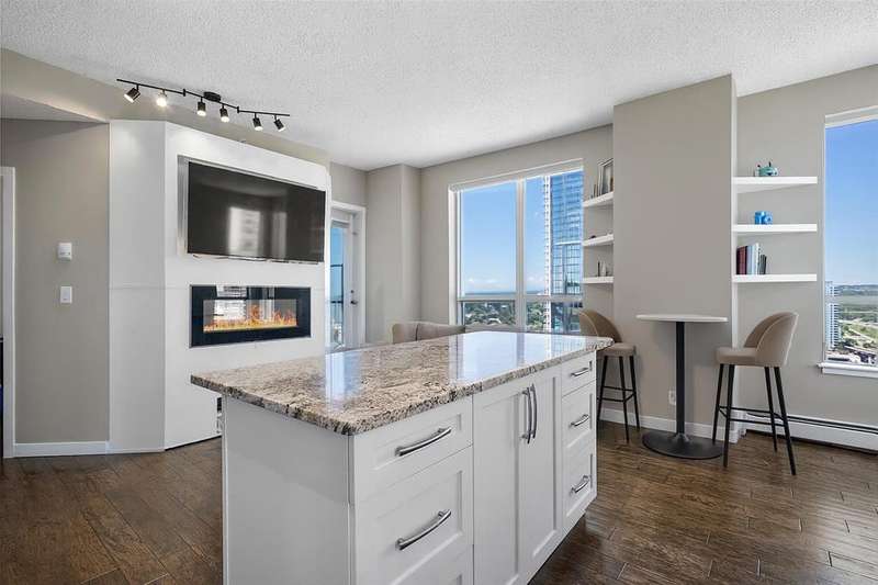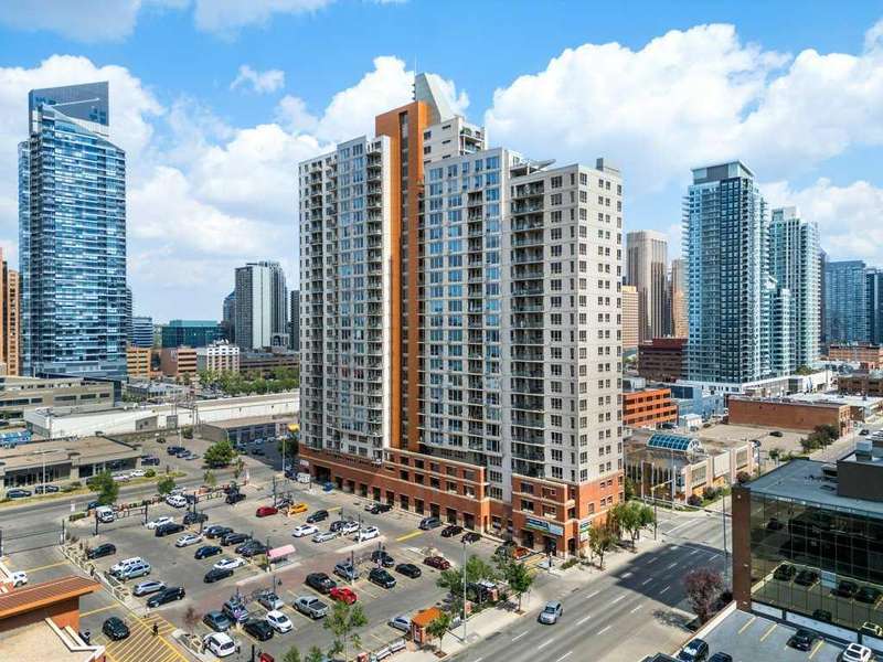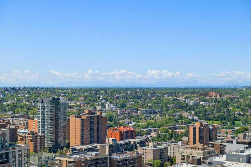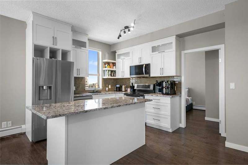 Penthouse living meets affordability: come take in the million dollar views - without the huge price tag! This 2 bedroom, top floor NW corner unit looks right out to the river + mountains while being positioned in the heart of the Beltline. Reap the benefits of all the upgrades in this reconfigured floor plan: neutral colour palette, wood flooring, electric fireplace + entertainment niche. The modern kitchen shines as the heart of the home: granite countertops. stainless steel appliances, clean white ceiling height cabinets + tile backsplash. Cozy up in the dining nook or unwind on the sofa in front of your favourite show. Head out to the west facing patio, crack a beverage, turn on the BBQ and really enjoy the endless viewpoints while waiting for the sunset. Retreat to the primary bedroom that features a dual door closet while the second bedroom is ideal for a murphy bed or home office. Get ready for the day in the stylish bathroom showcasing granite counters and a vessel sink. The unit comes with in-suite stacking washer + dryer plus an underground parking stall. Condo fees include all your main utilities! The building hosts a large fitness room along with concierge. Talk about convenience when the grocery store is right outside your door! You are also able to walk to all of your favourite pubs, restaurants, coffee shops + boutiques along with the c-train line, river pathways and downtown office core. A chance to elevate your life and live up top.