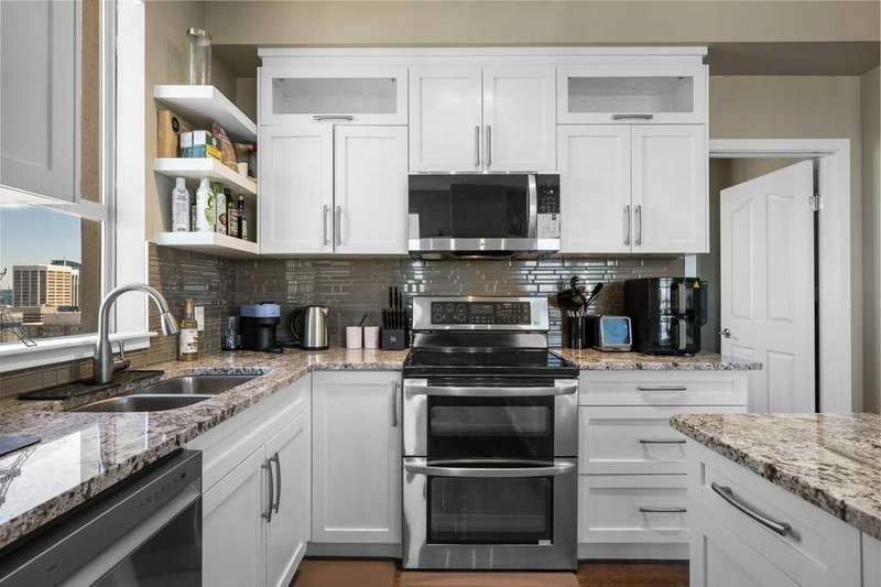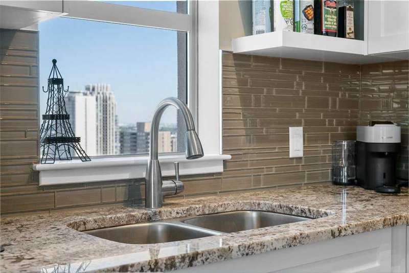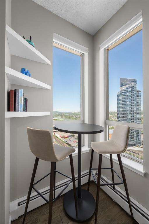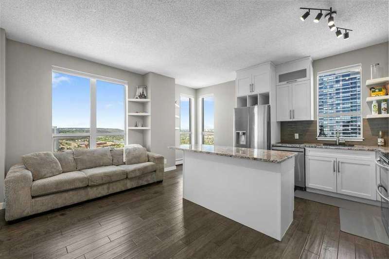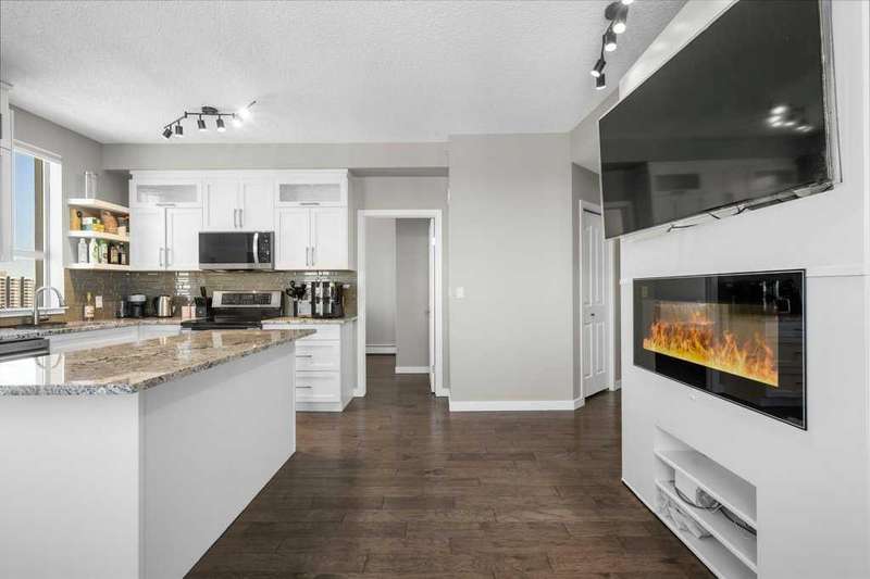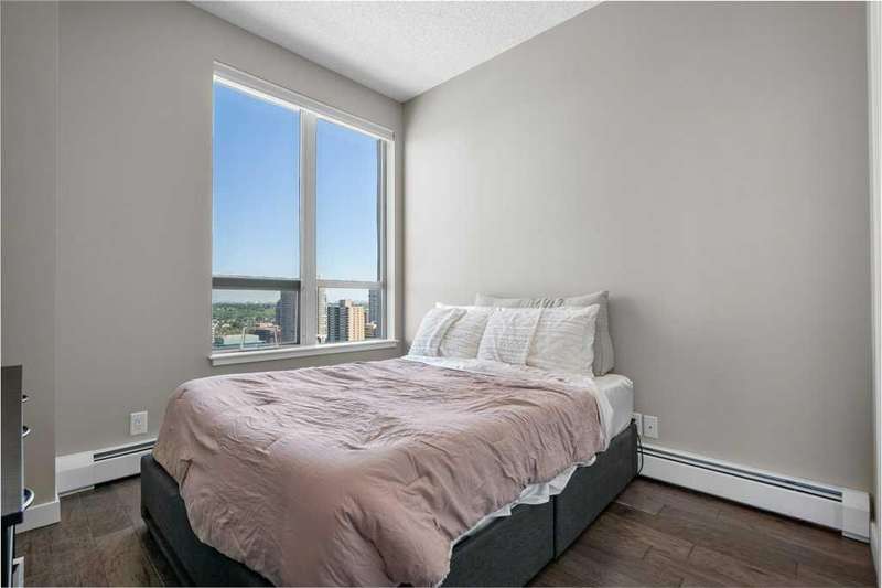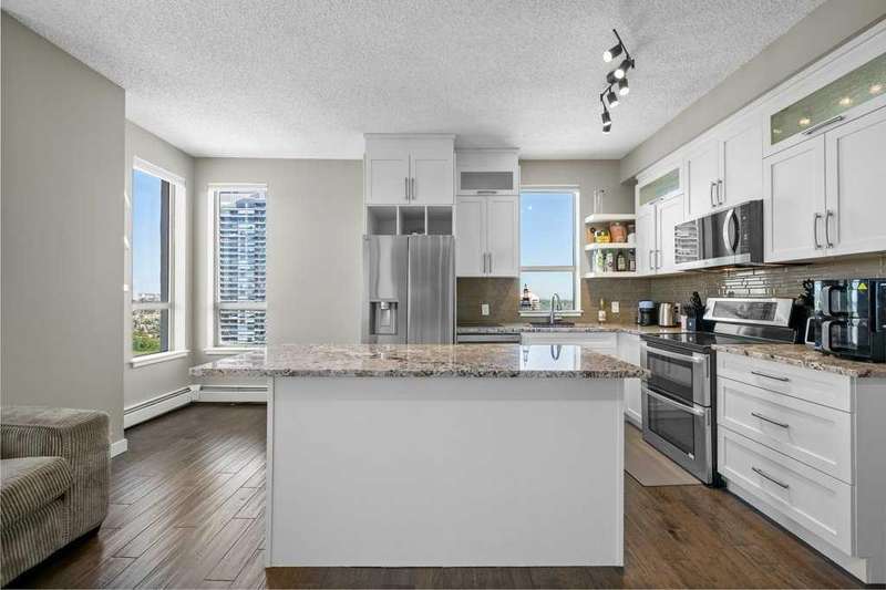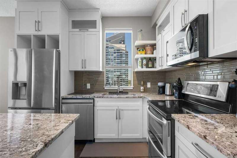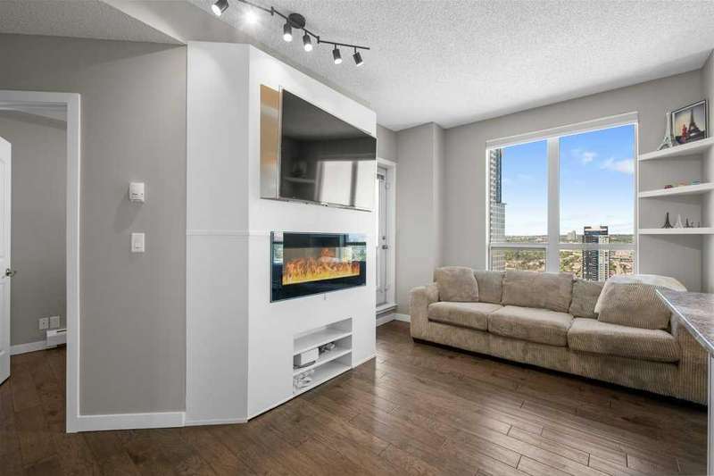 Penthouse living meets affordability: come take in the million dollar views - without the huge price tag! This 2 bedroom, top floor NW corner unit looks right out to the river + mountains while being positioned in the heart of the Beltline. Reap the benefits of all the upgrades in this reconfigured floor plan: neutral colour palette, wood flooring, electric fireplace + entertainment niche. The modern kitchen shines as the heart of the home: granite countertops. stainless steel appliances, clean white ceiling height cabinets + tile backsplash. Cozy up in the dining nook or unwind on the sofa in front of your favourite show. Head out to the west facing patio, crack a beverage, turn on the BBQ and really enjoy the endless viewpoints while waiting for the sunset. Retreat to the primary bedroom that features a dual door closet while the second bedroom is ideal for a murphy bed or home office. Get ready for the day in the stylish bathroom showcasing granite counters and a vessel sink. The unit comes with in-suite stacking washer + dryer plus an underground parking stall. Condo fees include all your main utilities! The building hosts a large fitness room along with concierge. Talk about convenience when the grocery store is right outside your door! You are also able to walk to all of your favourite pubs, restaurants, coffee shops + boutiques along with the c-train line, river pathways and downtown office core. A chance to elevate your life and live up top.