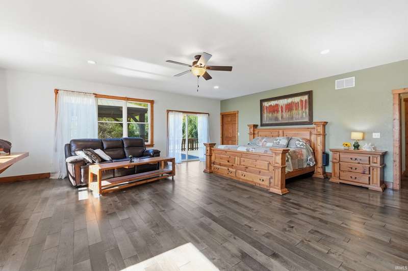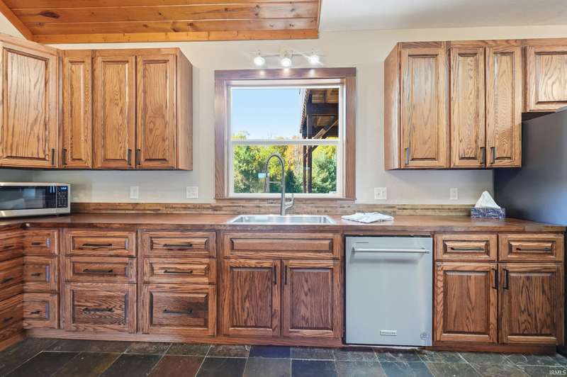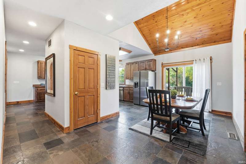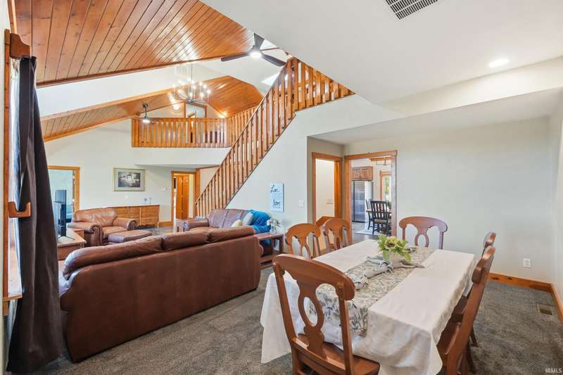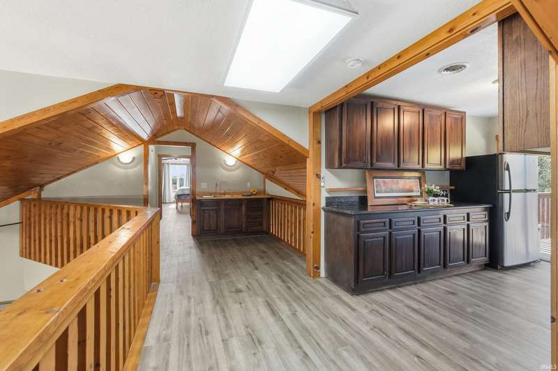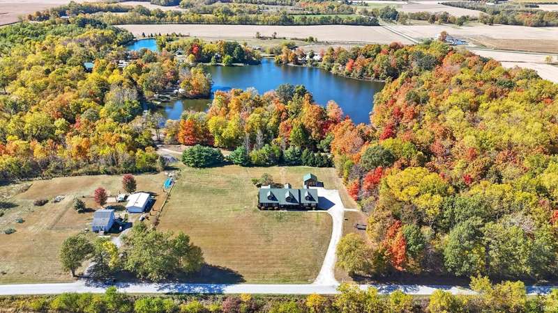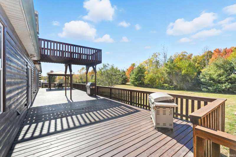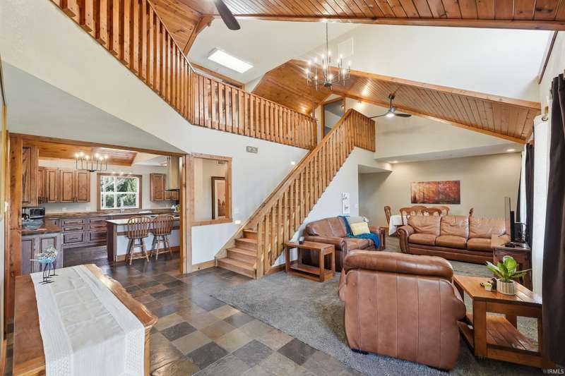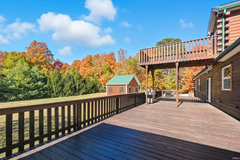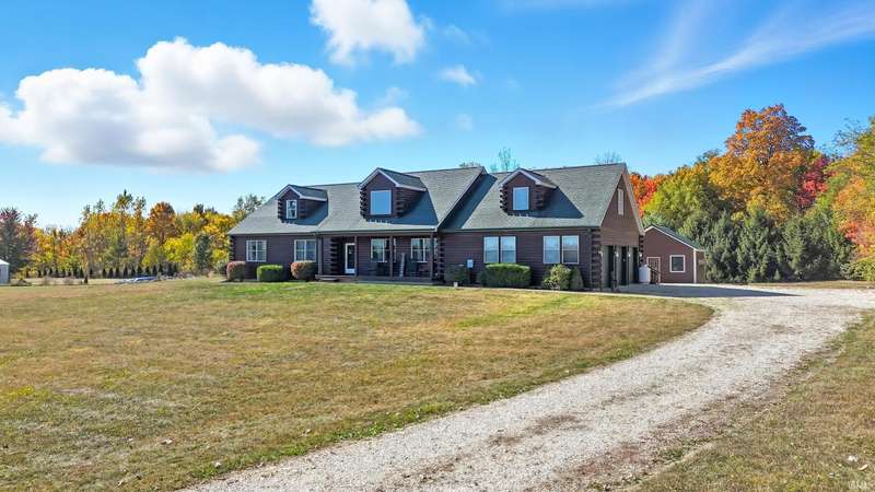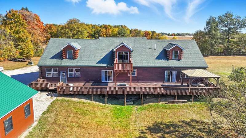 As you drive up the private lane, this beautiful stick-built log home immediately stands out for its craftsmanship and peaceful wooded setting. Nestled on nearly two acres in the rural Roanoke area, this property offers access to Timber Lake Campground for fishing, boating, and year-round recreation. A wide covered front porch welcomes you inside, where natural woodwork, vaulted ceilings, and an open-loft great room create a warm, inviting feel. The main level features a spacious master suite with a custom tile shower featuring dual shower heads along with direct deck access. Just off the master is a flexible office space or additional bedroom. The open-concept kitchen includes brand-new Amish-built cabinetry, solid wood countertops, a cooktop with double ovens, walk-in pantry, and a bright breakfast nook. A laundry room and mudroom conveniently connect the kitchen to the oversized three-car garage. Upstairs are two oversized bedrooms, a full bath, a secondary mini kitchen, and access to the upper deck. The finished basement adds even more living space with two potential bedrooms or a family room and a full bath. Step outside to enjoy nearly 1,600 square feet of outdoor living area, including a 90×16 main deck surrounded by nature. A 21×16 shed offers excellent storage. Built with efficiency in mind, this home features six-inch insulated walls, a closed-loop geothermal heating and cooling system, dual hot-water heaters, and a Manabloc plumbing system. Located about 12 miles from the GM Truck Plant and Vera Bradley, this peaceful retreat blends privacy, quality, and convenience in one property.