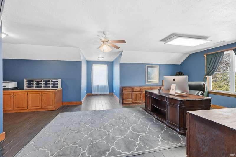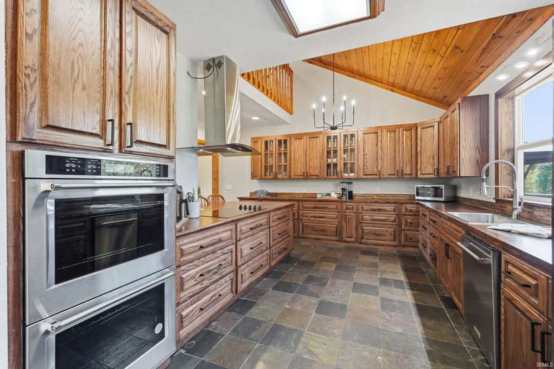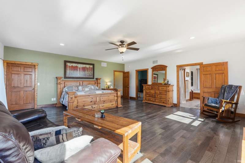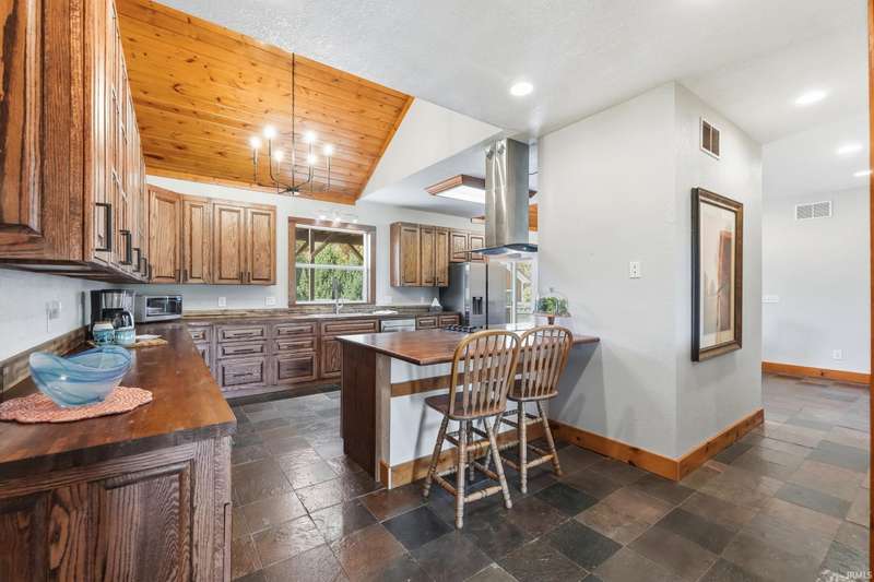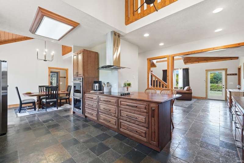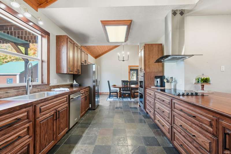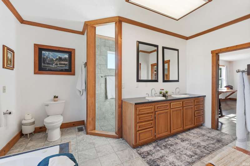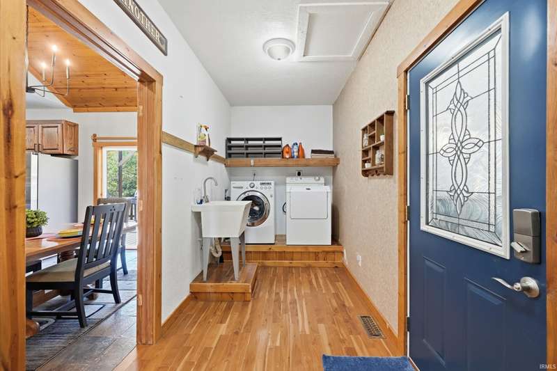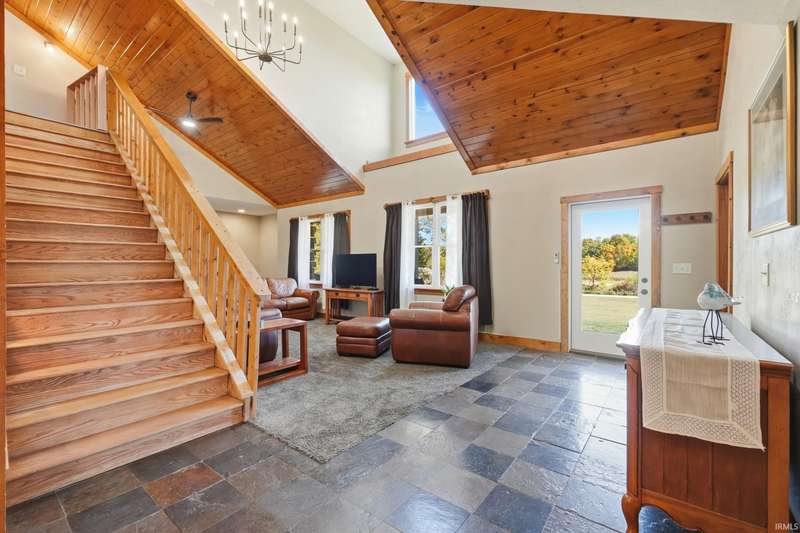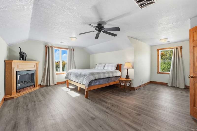 As you drive up the private lane, this beautiful stick-built log home immediately stands out for its craftsmanship and peaceful wooded setting. Nestled on nearly two acres in the rural Roanoke area, this property offers access to Timber Lake Campground for fishing, boating, and year-round recreation. A wide covered front porch welcomes you inside, where natural woodwork, vaulted ceilings, and an open-loft great room create a warm, inviting feel. The main level features a spacious master suite with a custom tile shower featuring dual shower heads along with direct deck access. Just off the master is a flexible office space or additional bedroom. The open-concept kitchen includes brand-new Amish-built cabinetry, solid wood countertops, a cooktop with double ovens, walk-in pantry, and a bright breakfast nook. A laundry room and mudroom conveniently connect the kitchen to the oversized three-car garage. Upstairs are two oversized bedrooms, a full bath, a secondary mini kitchen, and access to the upper deck. The finished basement adds even more living space with two potential bedrooms or a family room and a full bath. Step outside to enjoy nearly 1,600 square feet of outdoor living area, including a 90×16 main deck surrounded by nature. A 21×16 shed offers excellent storage. Built with efficiency in mind, this home features six-inch insulated walls, a closed-loop geothermal heating and cooling system, dual hot-water heaters, and a Manabloc plumbing system. Located about 12 miles from the GM Truck Plant and Vera Bradley, this peaceful retreat blends privacy, quality, and convenience in one property.