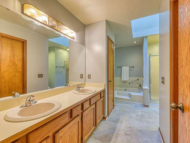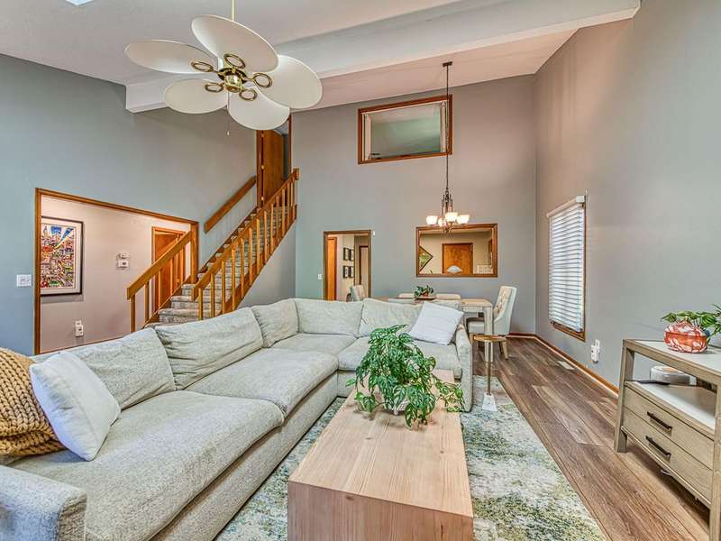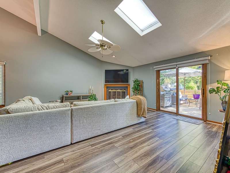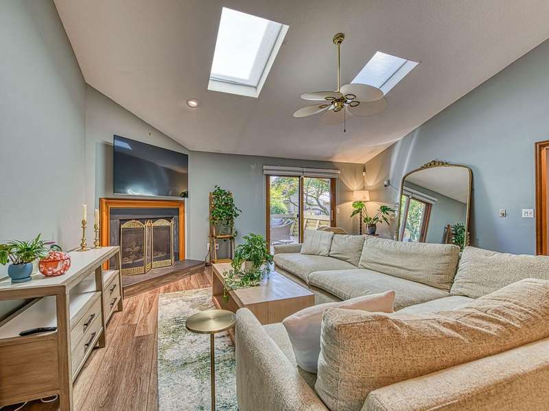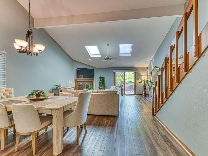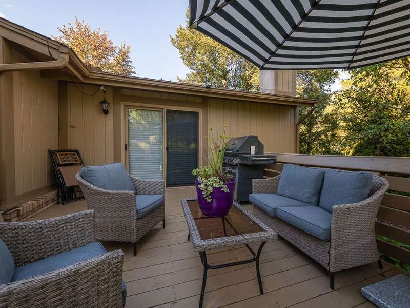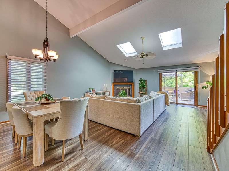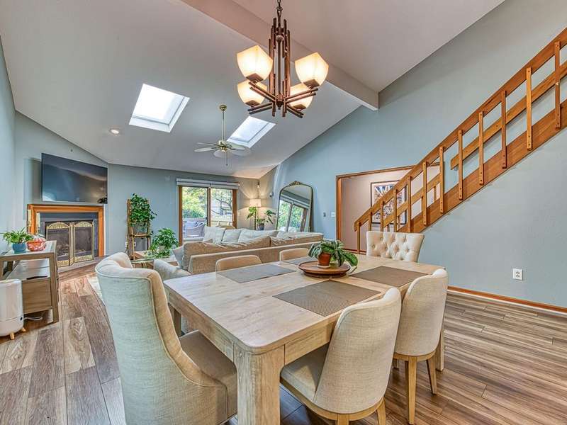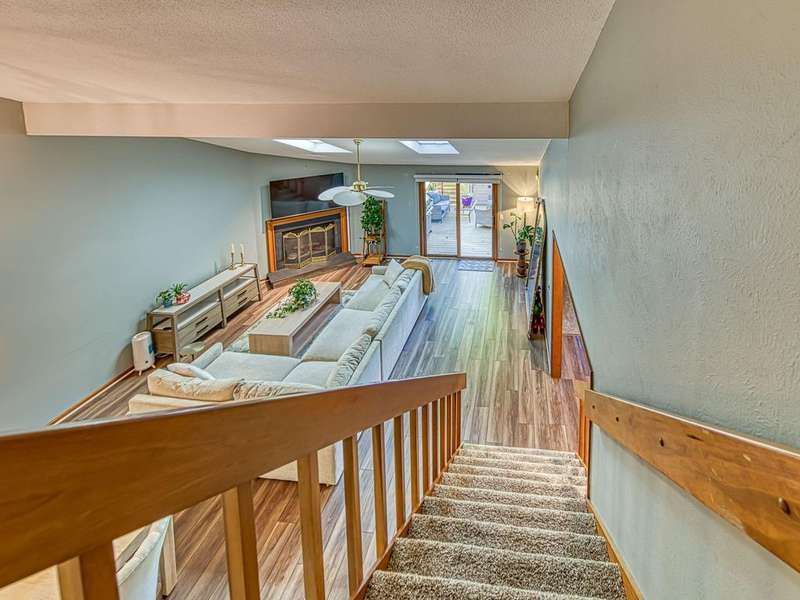 Updated and ready to move right in this spacious condo with a great floor plan. Newer laminate in the entry, living rm/dining room combo, and kitchen. Kitchen features newer countertops, subway tile and newer SS appliances. Living has vaulted ceiling with skylights, fireplace and slider door to private deck and mature landscaping. Large primary en suite and large second bedroom with newer carpet. Upstairs loft/bedroom with newer carpet. All this plus a finished basement with laminate floors.