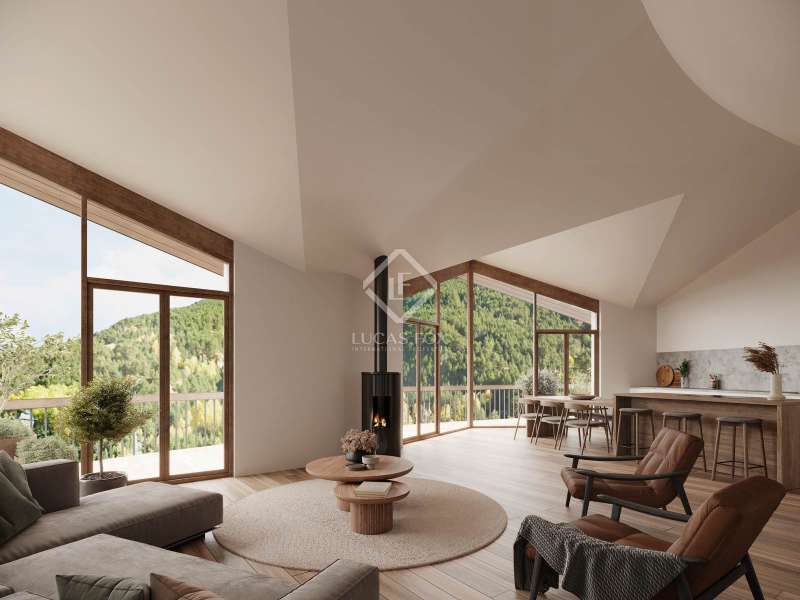 Lucas Fox is pleased to present the new build Development Refugis Canillo, with high-end apartments in a privileged location, next to the historic centre of Canillo, with all amenities within reach such as the cable car, but in a quiet natural setting, surrounded by mountains. The building has four floors, which contain the different types of housing. It stands out for its rustic style, with a slate roof and a volcanic stone façade that gives it a characteristic style. This ground floor floor apartment has a modern design, with neutral and soft tones and noble materials such as wood or marble, which make it very cozy. On the other hand, the property enjoys abundant natural light, thanks to its floor-to-ceiling windows that allow abundant natural light to enter the different spaces. In the same way, thanks to these windows, you can enjoy the impressive panoramic views of the surrounding mountainous environment. The layout is very functional, with open-plan rooms, such as the day area with the living-dining room and the open-plan kitchen with a central island that allows the connection between the different spaces and takes advantage of the dimensions of the property. The night area has two double bedrooms, the impressive main bedroom with its private bathroom and a dressing room, as well as a second additional bathroom to serve the entire property. To complete the layout, there is a large terrace with a garden of 217 m² with a pergola that provides shade and that could be used as a chill-out area. In addition, the property has top quality finishes and materials, such as a crowbar-proof armoured door or built-in wardrobes. The floors are also of the highest quality, as it benefits from Porcelanosa porcelain floors in wet areas , floating parquet in the rest of the property, ceramic stoneware on the balconies and synthetic flooring on the terrace. The bathrooms include ceramic cladding, sanitary ware and taps from Porcelanosa. The kitchen from the Nolte brand includes high and low furniture, Silestone countertops and all kinds of appliances. For total comfort, electric radiators, a pellet stove in the living room and triple-glazed windows with an air chamber and aluminium carpentry with thermal break are included. In addition, there is the possibility of acquiring parking spaces, closed boxes and storage rooms. Please contact for more information.