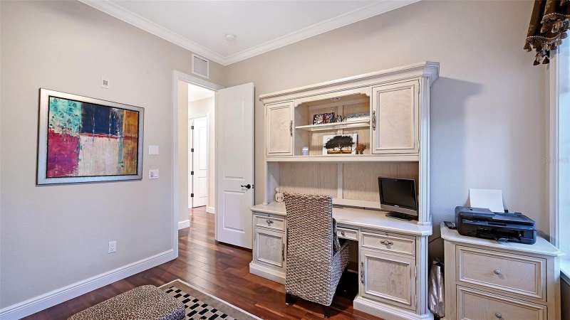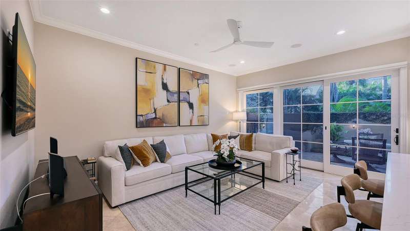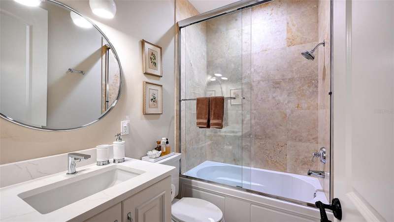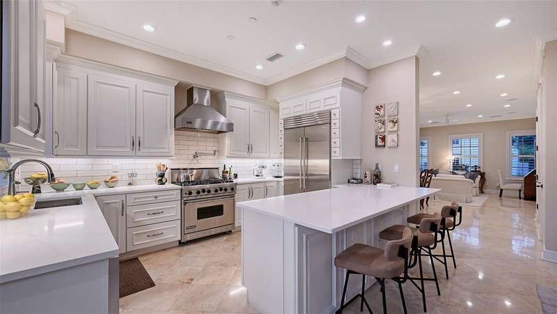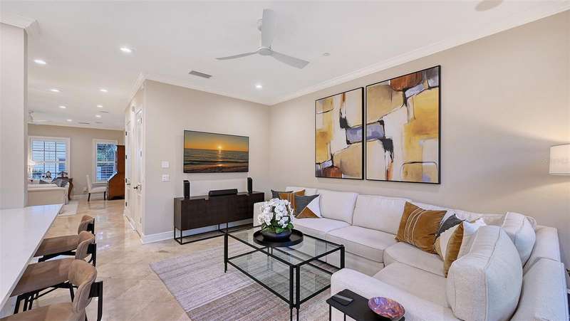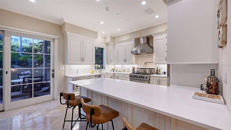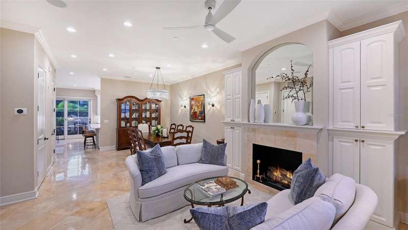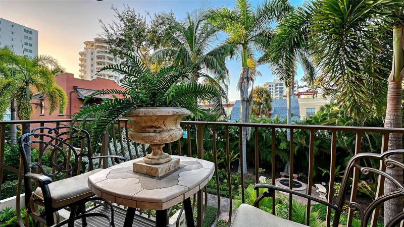 Under contract-accepting backup offers. Tucked within the highly sought-after Burns Court Villas in the heart of downtown Sarasota, this exquisite and inviting rarely available two-story townhouse lives with the comfort and privacy of a single-family home yet offers all the conveniences of vibrant downtown Sarasota living just outside your door. With nearly 2,000 square feet of thoughtfully designed space, 3 bedrooms, 2.5 baths, and 3 private balconies plus the largest private courtyard in the community, this residence beautifully balances elegance, comfort, and everyday livability. Step through the solid mahogany front door into light-filled interiors anchored by polished travertine floors, high ceilings, and soft natural light filtering through impact-rated windows and doors. The open living spaces flow gracefully, from the welcoming formal living room with gas fireplace, to the elegant dining room, and on to the fantastic family room just off the kitchen—a peaceful retreat overlooking the lush, private courtyard where birds sing and green Climbing Fig adorns the walls creating a rare, serene extension of the living space for morning coffee, quiet reading, or intimate outdoor entertaining. The kitchen remodel, completed in 2023, reflects impeccable craftsmanship and refined taste. Custom wood cabinetry with soft-close drawers and pull-out storage is paired with quartz countertops, a new Sub-Zero refrigerator, Viking six-burner gas range with electric oven, Viking convection microwave, and Miele dishwasher. Every detail was designed for both beauty and performance, while upgraded LED lighting throughout the home enhances its brightness and energy efficiency. Upstairs, Brazilian cherry engineered hardwood floors add warmth and continuity to the second level. The serene primary suite offers a restful ambiance, with a private balcony access, custom walk-in closet and a fully renovated primary bath—a spa-like retreat of glass, quartz, and intricate custom tilework with cohesive tile patterns and fine finishes. The space features a walk-in shower with bench seating, stainless fixtures, and a designated vanity illuminated by natural light. The 2 generous guest suites are calming private retreats and share a reimagined full bath that mirrors the sophisticated aesthetic of the primary- newly renovated with the finest of materials and finishes. Everyday practicality is elevated by the convenient second-story laundry room with Whirlpool Duet washer and dryer, storage cabinetry, and ample additional closet space. The home also features 2-zone A/C, a water heater less than a year old, GFI EV charging outlet, and assigned parking. Residents of Burns Court Villas enjoy a beautifully landscaped central courtyard with pool, relaxing spa, and fire pit—a true urban oasis. Peace of mind is paramount with enhanced perimeter security including fob-access gates & secure parking. Blending the warmth of a home with the ease of downtown living, this residence offers a lifestyle that’s both tranquil and connected. Walk or ride to Sarasota’s acclaimed dining, theaters, galleries, and the bayfront, then return home to your own private sanctuary—where modern comfort, timeless design, and a sense of calm meet in perfect harmony.