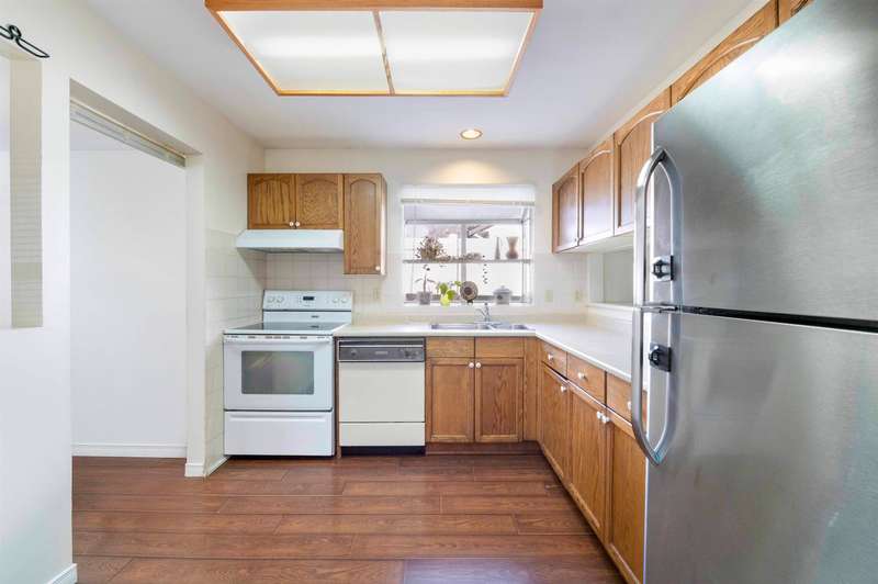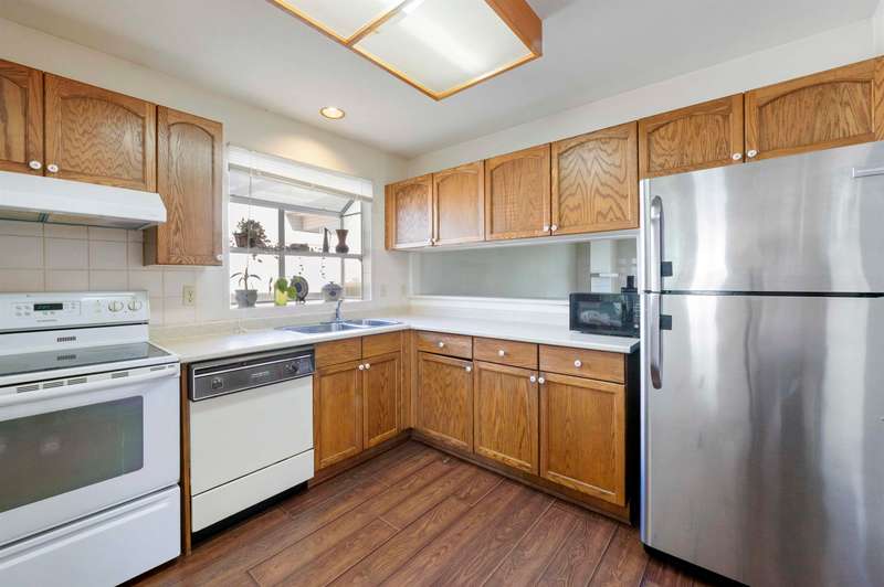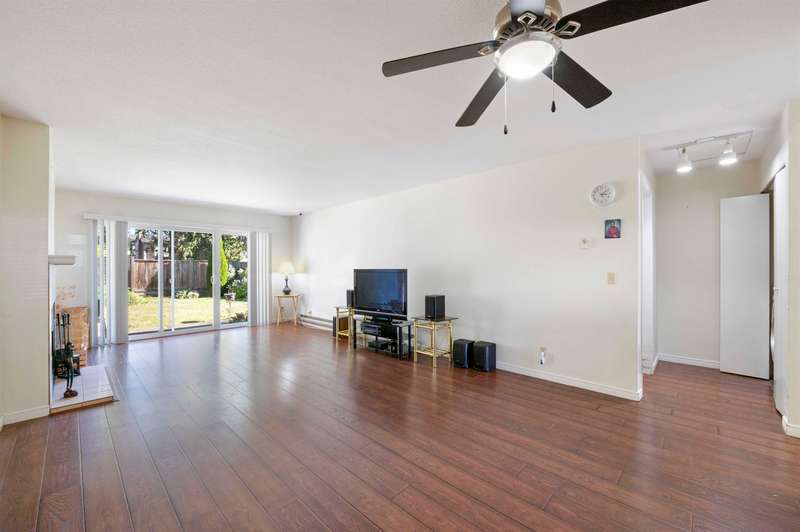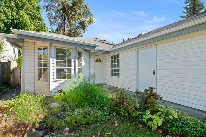 Welcome to Orchard Lake! This well maintained END UNIT rancher townhome offers 1,238 sq. ft. of comfortable living space and a rare, MASSIVE 1,300 sq. ft. backyard that backs onto city property—providing exceptional privacy & the feel of a detached home. Inside, you'll find 2 spacious bedrooms, 2 full bathrooms (including an ensuite), along with a bright, open-concept living/dining area. The well-appointed kitchen opens to a cozy eating area or family room, perfect for everyday living. Orchard Lake is a family-friendly, pet-friendly gated community featuring a picturesque central lake that adds a touch of serenity to daily life. Ideally located just steps from Kirkland Elementary & a nearby church, with easy access to transit, parks, shopping, LA Matheson Secondary, Scott Rd and Nordel Way