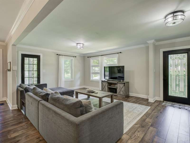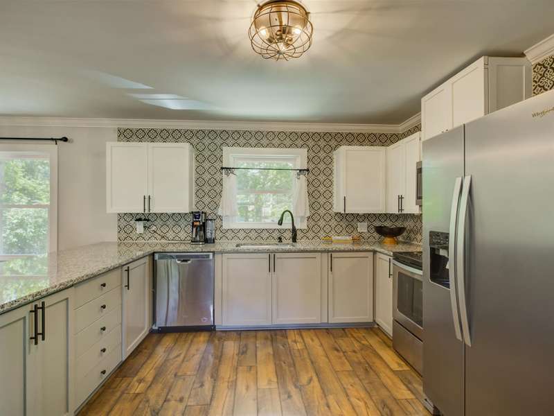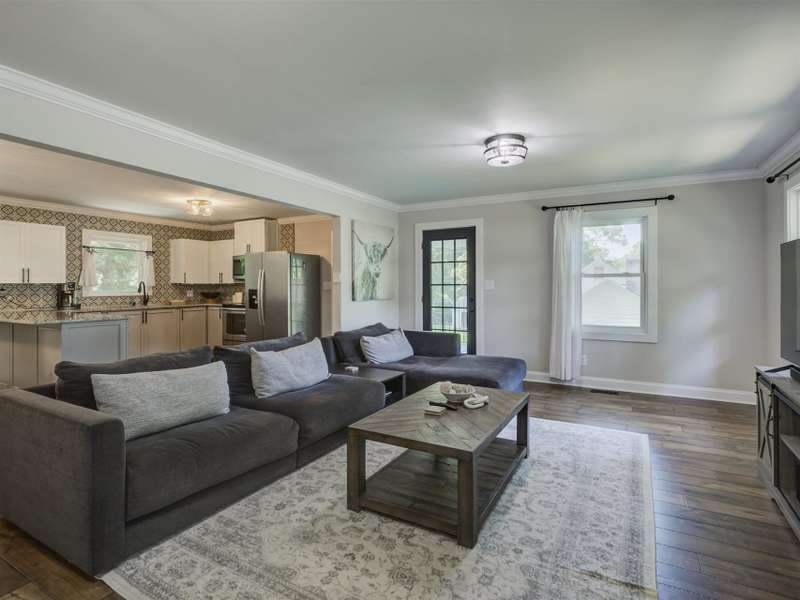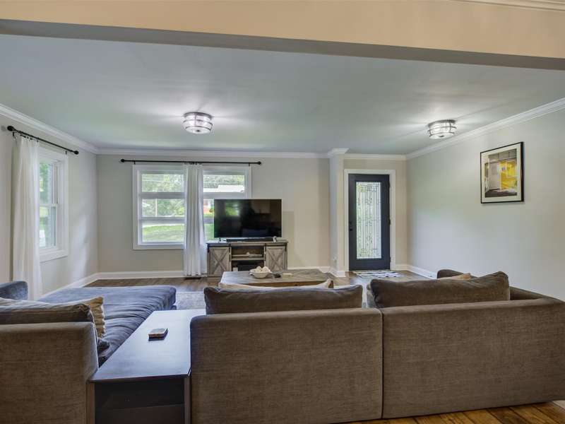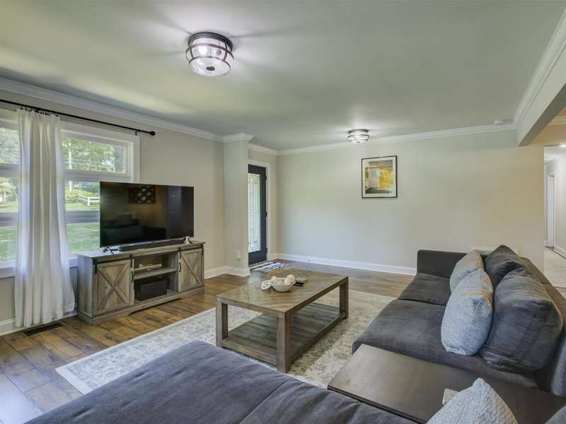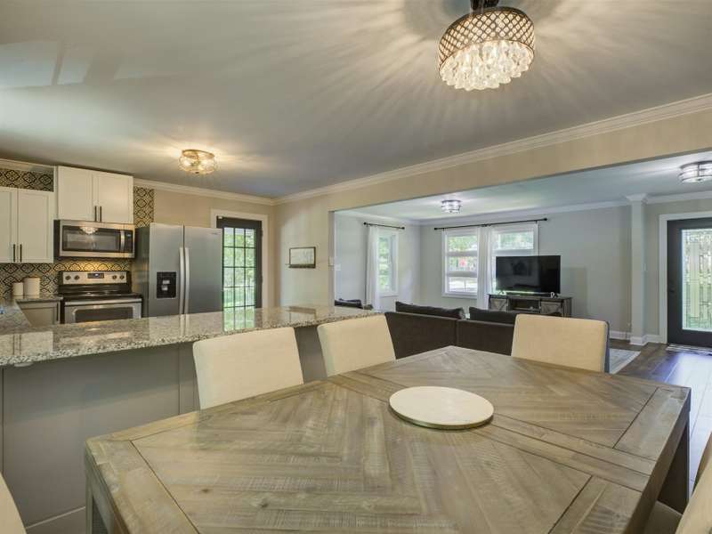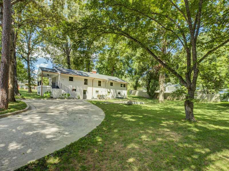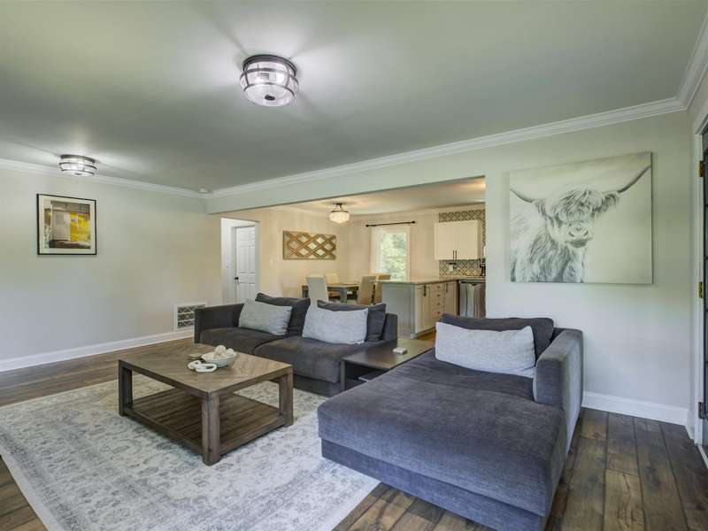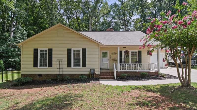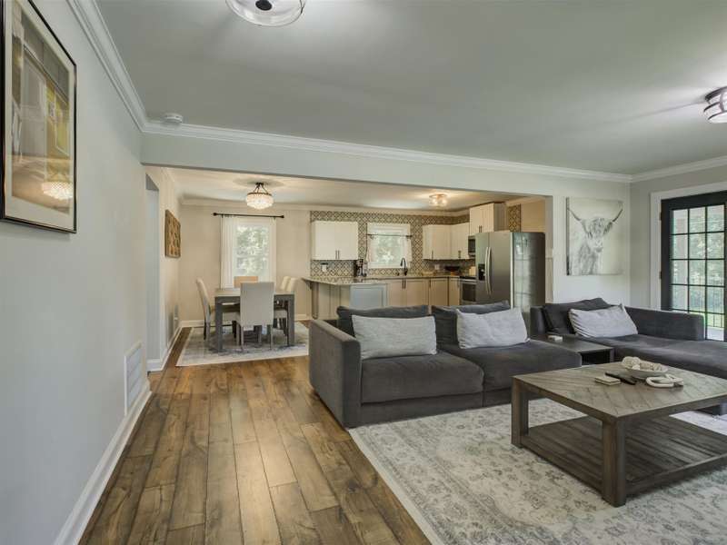 Full of character and modern updates, this 4-bedroom, 2-bath home offers over 1,700 sq ft with a spacious living area and open floor plan that flow easily for everyday living and entertaining. The corner lot sits on nearly half an acre, set back from the main road for privacy with a circular driveway for easy access. The kitchen features a breakfast bar with dining space and connects seamlessly to the main living space, making it a natural spot to gather. The primary suite stands out with large windows, an accent wall, and a fireplace for a comfortable retreat. A basement with exterior access adds storage and flexibility. Outdoors, the side covered deck and large patio extend the home's living space, perfect for relaxing or hosting guests.