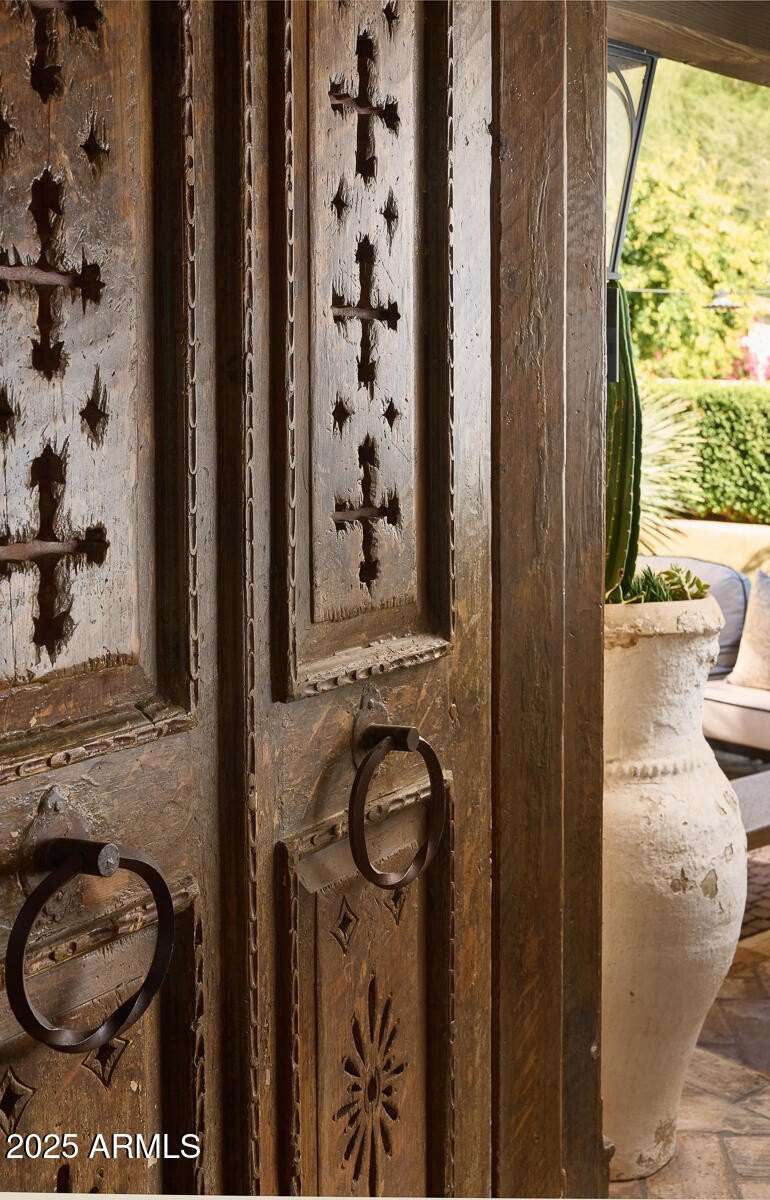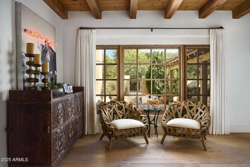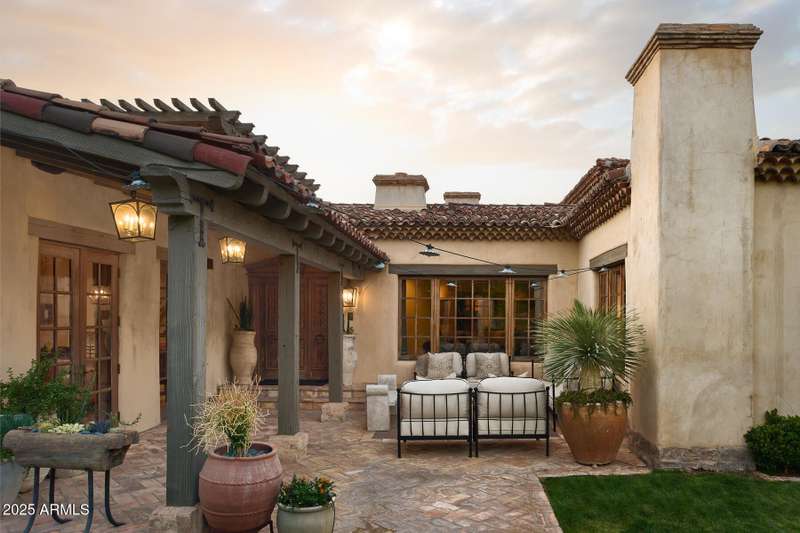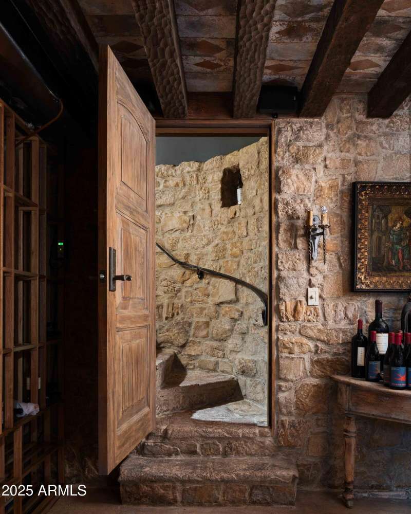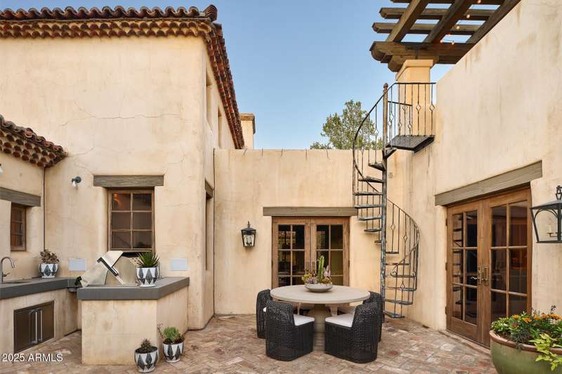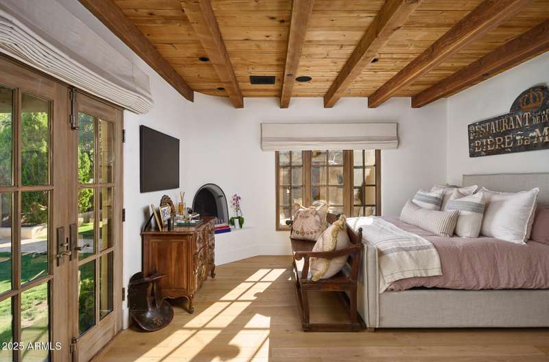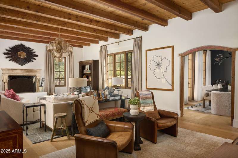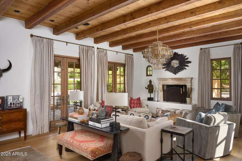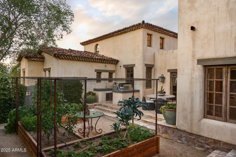 Step into a realm of refined French Mediterranean architectural grace, where timeless luxury meets modern innovation. Originally designed by renowned OZ Architects this extraordinary estate reflects a pedigree of distinction. Masterfully restored and renovated in 2023—this residence artfully blends antique European elements with thoughtful, refined finishes throughout. Spanning over 7,300 square feet on a lush 1.186-acre lot with dramatic mountain views, this home offers unmatched craftsmanship and functionality. Highlights include 4 en suite bedrooms, 5 full baths, a dedicated office (easily a 5th bedroom), a billiards room, a craft room, a roof deck, and a three-car garage with ample guest parking. Seamlessly integrated with a Savant Home Automation system, the property provides effortless control of lighting, climate, entertainment, and securityelevating everyday living to new heights. The enchanting grounds feature multiple private courtyards, a vegetable and herb garden, 8 fireplaces, an exterior fire pit, a private, heated pool with a charming poolside ramada, and a 5,000-bottle-capacity wine cellar. Designed for both entertaining and intimate gatherings, the formal dining room offers a private courtyard view and direct access to the wine cellar, while the butler's pantry conveniently connects the kitchen and dining areas. The chef's kitchen is a culinary dream, featuring top-of-the-line Wolf appliances: a six-burner plus griddle double oven range, a steam oven and a Sub-Zero refrigerator/freezer. A dedicated coffee station includes a Miele in-wall espresso system and warming drawer for morning indulgence. The luxurious primary suite overlooks the lush grounds and private patio, with a serene window bench nook. The spa-like primary bath boasts a spacious walk-in shower, standalone tub, dual vanities, and 2 separate fully renovated oversized closets. Additional bedrooms offer walk-in closets and scenic mountain views, providing comfort and privacy. From Venetian plaster walls and rough-hewn ceiling beams to custom European millwork, every detail radiates Old World charm and enduring elegance. With room to expand or personalize further, this is a residence where artistry, sophistication, and modern comforts come together in perfect harmony. Welcome to a masterpiece of luxury livingtimeless, distinguished, and simply extraordinary.