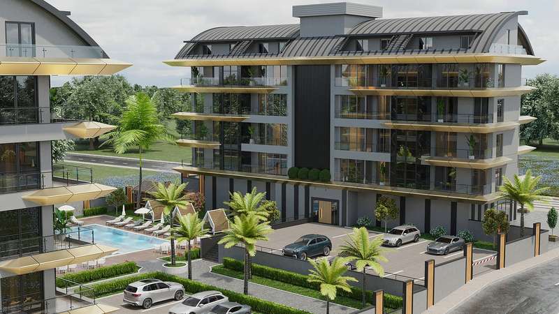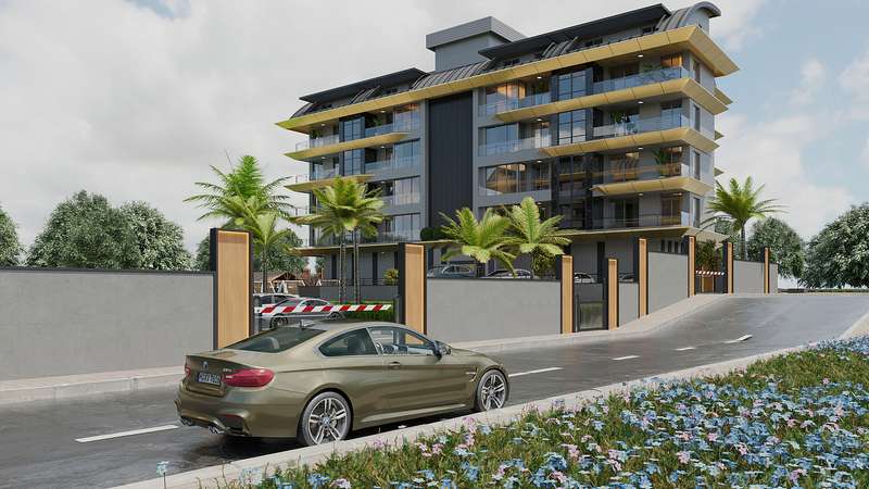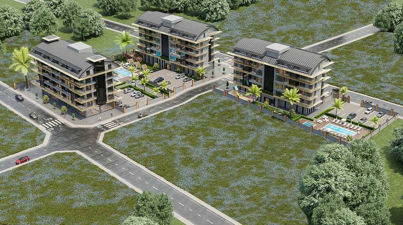 The project in Kargicak Alanya is constructed on a 6,500 m² plot and consists of 3 blocks with a total of 100 apartments. The complex includes an outdoor swimming pool, children's pool, parking lot, sauna, gym, children's playground, landscaped garden, pergola, generator, and central satellite system.