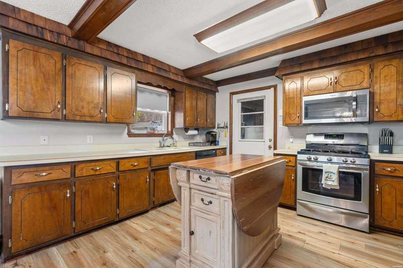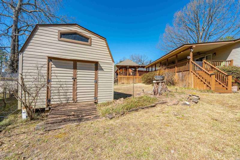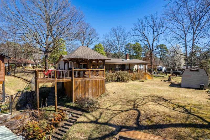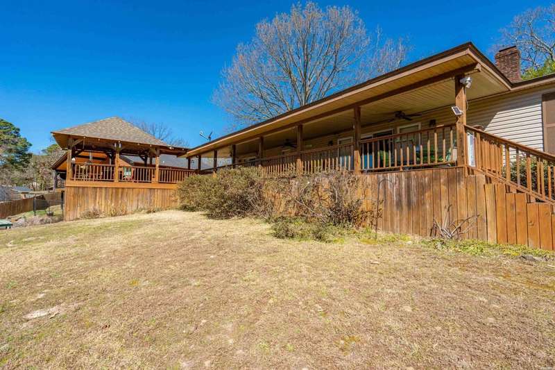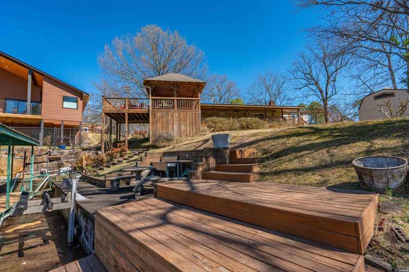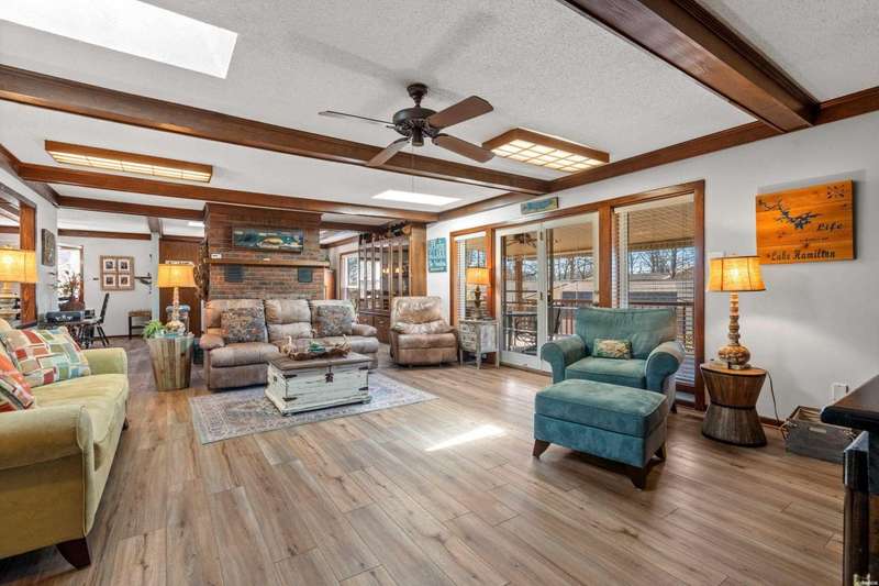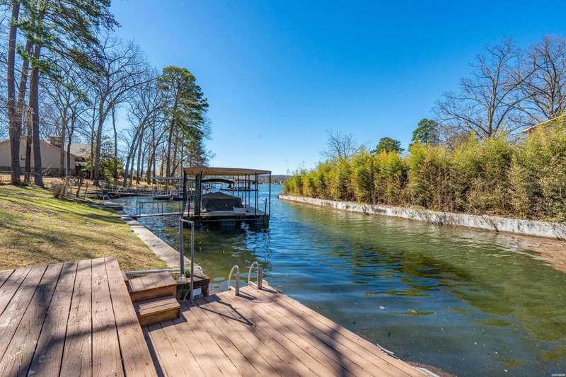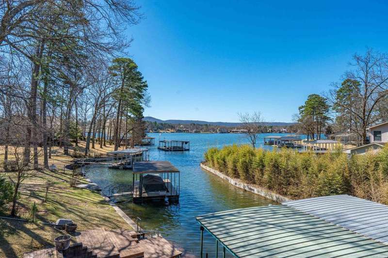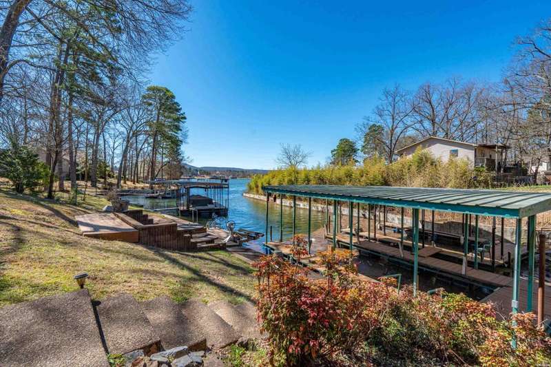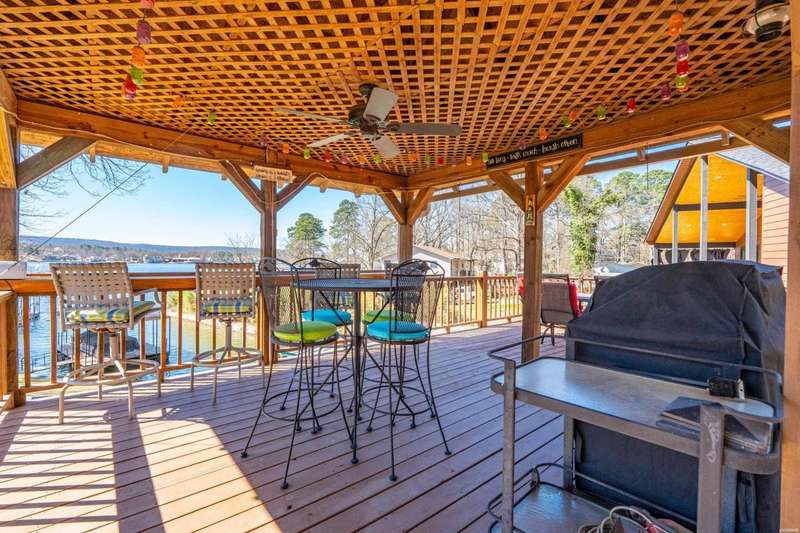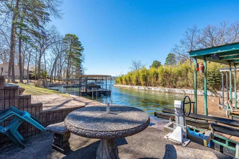 Imagine a charming lake house nestled along the water's edge that has a spacious covered patio along the entire the back of the house that offers multiple cozy outdoor seating arrangements. In addition to the covered patio is an additional deck offering both covered and uncovered seating options, all overlooking the lake. The boat dock is just steps from your deck for ease in getting on the boat to enjoy lake life. Inside the lake house, the open floor plan seamlessly blends the living room, kitchen, and dining area to allow for ease of conversations. Multiple large windows across the back of the house flood the space with natural light, offering an uninterrupted view of the water. The living area features a ceiling with exposed wooden beams, a 2-sided fireplace for both the dining room and living room to enjoy. The primary suite is a private lakeside retreat, designed for both comfort and luxury. Large windows frame stunning views of the water, allowing natural light to pour in while offering a peaceful ambiance. A glass door leads directly to the covered patio, making it easy to step outside and enjoy the fresh lake breeze. The newly updated bathroom is spacious and elegant. There are an additional 2 bedrooms for guests and another updated bathroom. Enjoy the perfect summer on the lake, where long sunny days are filled with boating, fishing, swimming, and relaxing by the water. Whether you're out on a kayak or paddleboard, cruising on a pontoon, or simply floating in the refreshing water, every moment is a chance to soak in the beauty of lake life. Make plans to see this house today! Call to schedule a private tour and experience the beauty of lakeside living firsthand. Whether you're looking for a weekend getaway or a full-time escape, this home is ready to welcome you. Call now before it's gone!