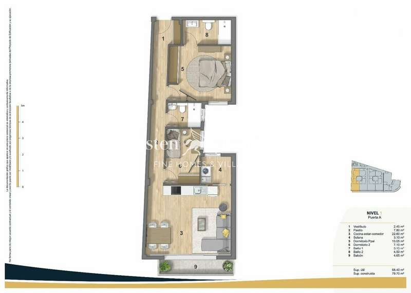 Floor 2A, 2 bedrooms, 2 bathrooms, 79,70 m2 total with 4,65 m2 balcony, PRICE €325.000