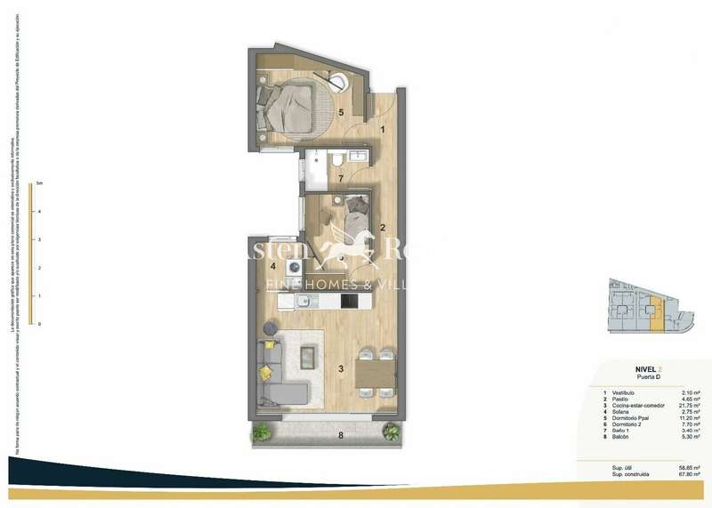 Floor 2D, 2 bedrooms, 2 bathrooms, 67,80 m2 total with 5,30 m2 balcony, PRICE €345.000