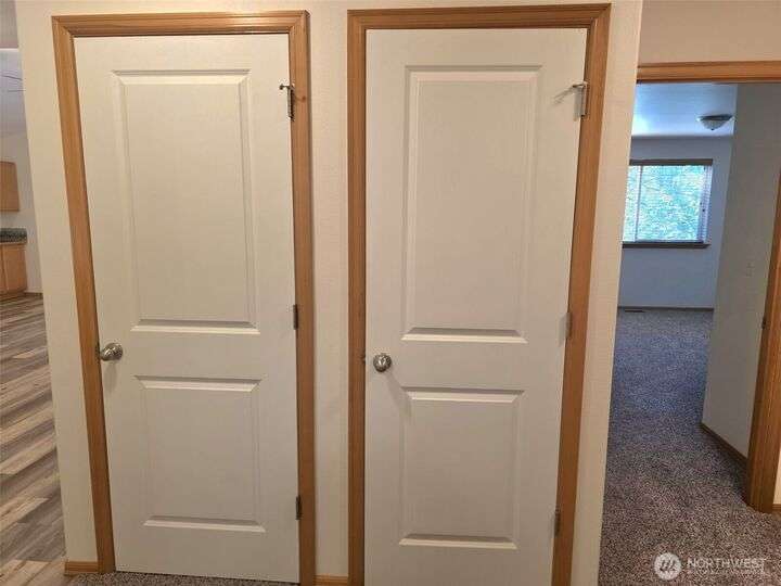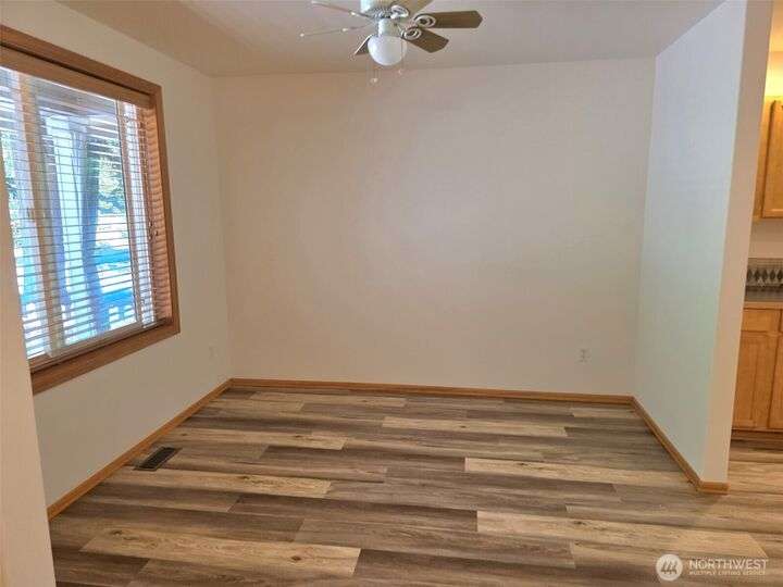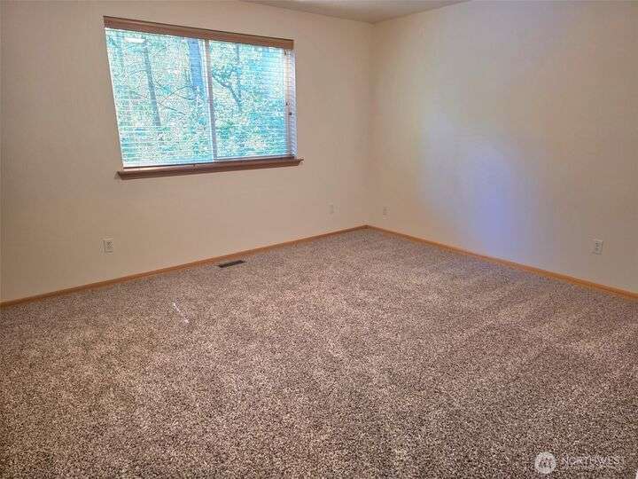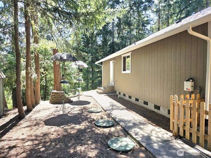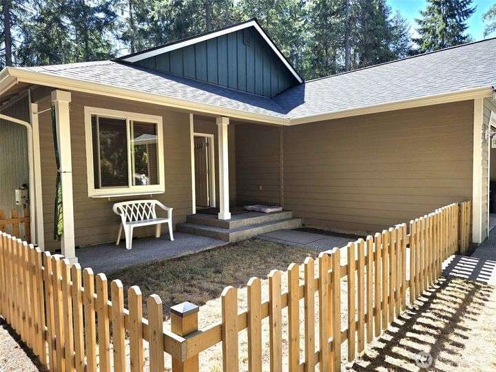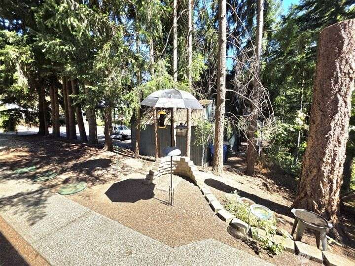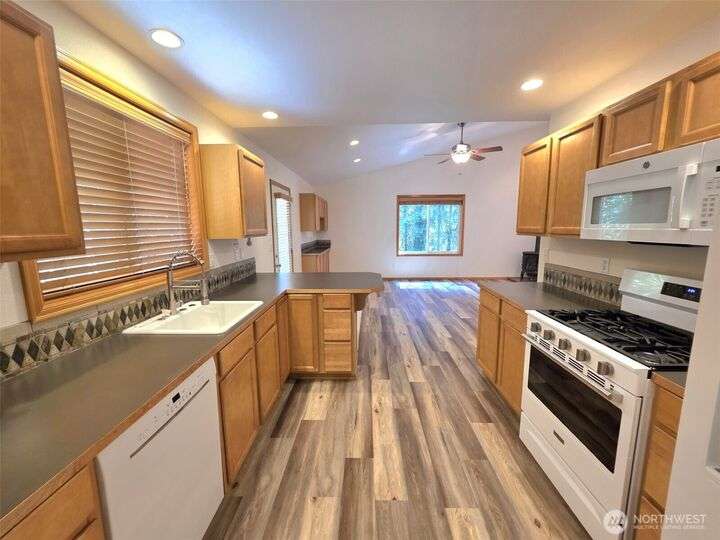 This meticulously maintained home just received a 40k upgrade - just for a new buyer! Beautiful open concept layout with vaulted ceilings and a wooded view of Horseshoe lake out the picture window! Cozy gas stove, open shelving and a built in side board in the central living area. Brand new laminate hardwood floors, new carpet, new fridge, new stove and roof! House has wood wrapped windows, wooden blinds, fully finished garage and on demand water heater. Storage area in garage is easily detachable. Pretty side yard, and backyard slopes down to the walking trail and the lake. Beautiful cedars in front yard create privacy. Enjoy all the lakes, trails, beaches, picnic areas, pool, tennis and all of Clearwood's fabulous amenities. !!