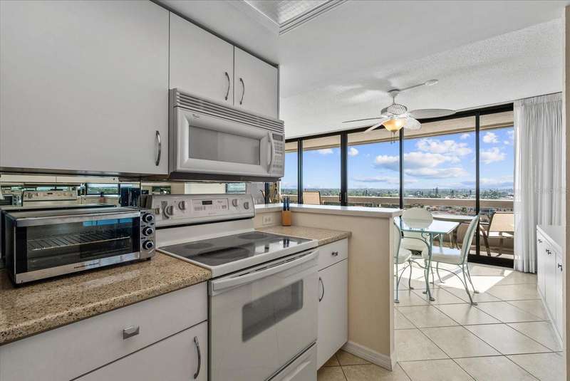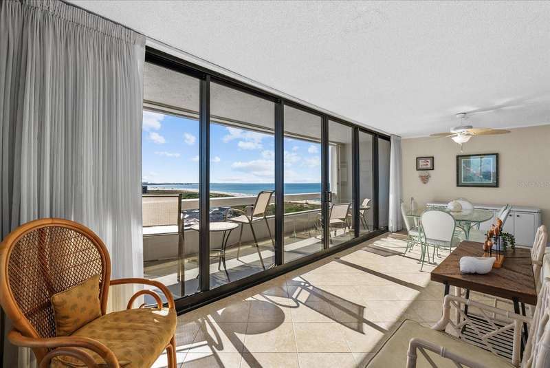 Discover coastal luxury at Beach Terrace, one of Siesta Key's most coveted addresses. Perfectly positioned at the end of the village with direct Gulf of Mexico frontage, this exceptional 1 bedroom, 1 bathroom corner residence offers an unparalleled beachfront lifestyle with breathtaking panoramic views that truly set it apart. This thoughtfully designed condominium showcases sweeping vistas that capture the essence of Florida's Gulf Coast living. From the pristine white sands of Siesta Key Beach to the sparkling aqua waters of the Gulf, and extending to the glittering skyline of downtown Sarasota and even Longboat Key in the distance, the views are simply extraordinary. At night, watch as the twinkling lights of Siesta Key Village and downtown Sarasota create a magical backdrop that makes this easily one of the best views on Siesta Key. One of the standout features of this residence is the three spacious private balconies that provide the perfect vantage points to embrace the coastal lifestyle. Start your morning with coffee while watching the sunrise, unwind with spectacular sunset views in the evening, or simply soak in the panoramic scenery throughout the day. These outdoor spaces are truly an extension of your living area and offer unmatched opportunities to experience the beauty of Siesta Key from every angle. Enter through an inviting tiled foyer that flows seamlessly into the well-appointed kitchen. The generous living area features dual sliding glass doors that flood the space with natural light and frame the expansive views of Siesta Key and the beach beyond. Imagine relaxing on your couch while gazing at the sparkling waters of the Gulf, this is everyday living at Beach Terrace. The dining area offers ample room for entertaining family and friends with gorgeous views. Beach Terrace provides resort-style amenities that complete the coastal living experience. Residents enjoy an elevated heated saltwater pool, a modern fitness center, and a welcoming community room, all just steps from your private beach access. Everything you need for the ultimate Florida lifestyle is right at your doorstep. This is more than just a home; it's a lifestyle. Beach Terrace combines the tranquility of a secluded Gulf-front location with the convenience of being nestled at the end of the charming Siesta Key Village. Location, location, location! Don't miss this rare opportunity to own a piece of paradise in one of Florida's most desirable beach communities, where stunning views and coastal elegance come together in perfect harmony.