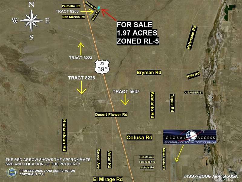 PRIME 1.97-ACRE CORNER RESIDENTIALLY ZONED LAND PARCEL IN THE ADELANTO AREA. IT IS SITUATED AT THE NORTHEAST CORNER OF MORONGO AND NAVAJO, TO THE NORTH OF THE SOUTHERN CALIFORNIA LOGISTICS AIRPORT, AND IN CLOSE PROXIMITY TO THE ADELANTO CITY LIMITS. About 0.59-miles east of U.S. Hwy 395, about 3.79-miles north of Oleander, and about 3.79-miles north of the Adelanto city limits. Adelanto is home to the Adelanto Industrial Parks. These Industrial Parks are home to hundreds of industrial companies. This 1.97-acre property is located about 10.2-miles to the north of these Industrial Parks. This property also lies about 7.14-miles northwest of the Southern California Logistics Airport, which is poised to become one the most important cargo airports in the nation. The parade of billion dollar companies like Boeing, General Electric, FedEx, Red Bull, has already begun at the Southern California Logistics Airport. This 1.97-acre is in recorded Subdivision Tract 8203 in the unincorporated area of San Bernardino County. RL-5 zoning would permit one single family home on this property, subject to the development approval and requirements of the County of San Bernardino.