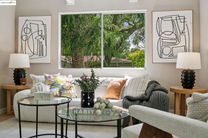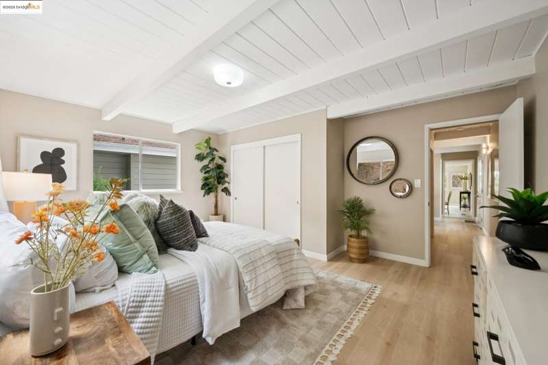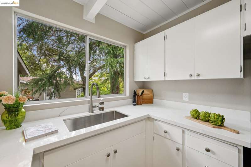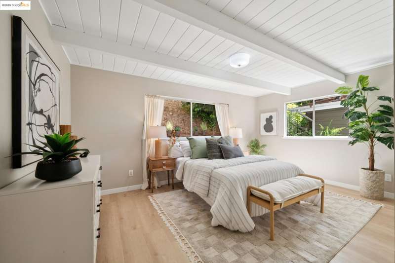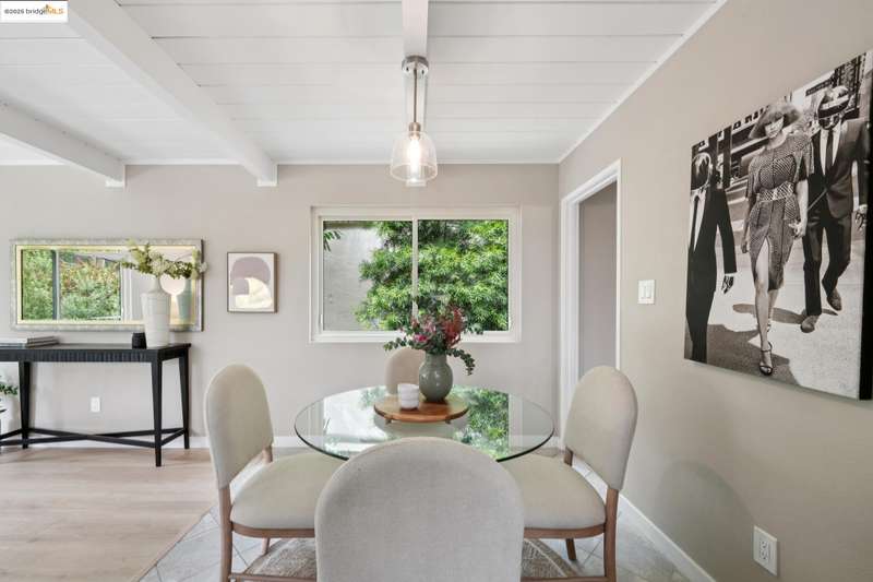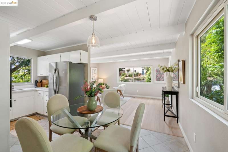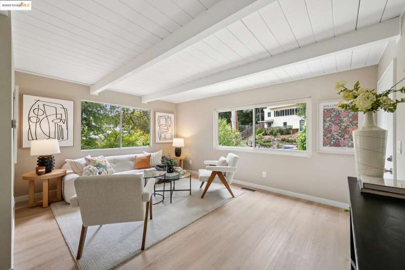 Welcome to this tastefully rehabbed home. Located in a pocket neighborhood in Lincoln Highlands. Nestled off the street with a long useful driveway, this 2 bedroom, 1 bathroom home is a light filled oasis with south, east and west sight lines. The exposed beam/tongue and groove wood ceiling throughout captures the early 60’s architectural vibe. New floors and a great overall layout. The open floorplan with banks of windows has a living, dining and kitchen all connecting in the front part of the home. A tastefully redone kitchen has new lighting, stone counters, new sink and new appliances. In the rear are two generously sized bedrooms with the primary looking out onto the backyard. The refreshed bathroom with vanity and tiles and tub is located off the hallway off the bedrooms. Access the backyard - peaceful and quiet from a door near the kitchen – ideal for quick BBQ checks as well as hosting friends and family. Overall the lot is 11,576 SQF. Lincoln Highlands is a premier Oakland neighborhood where City living meets the serenity of nature in addition to great weather! Joaquin Miller Park and Diamond Park are nearby – come and experience blissful trails, Redwood groves and fabulous views. Finally, Avenue Terrace kids park is conveniently close.