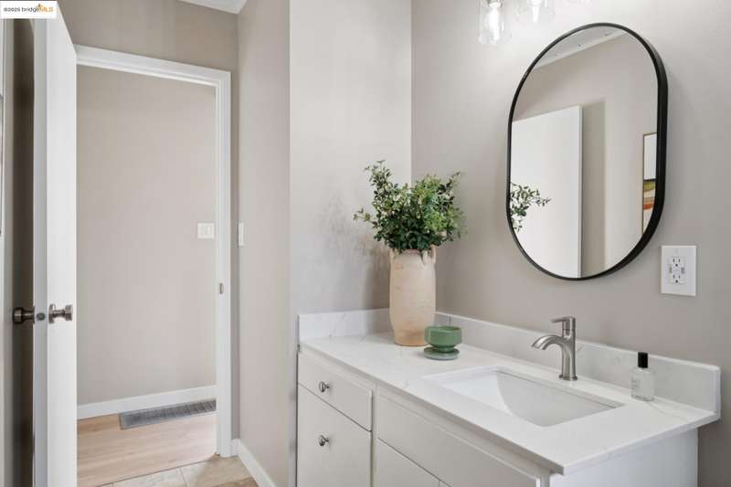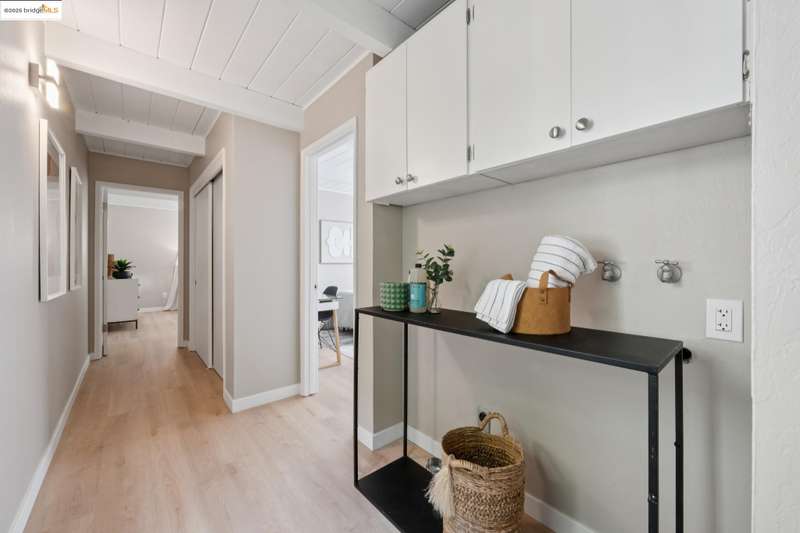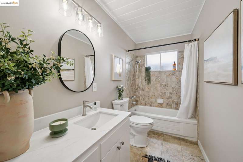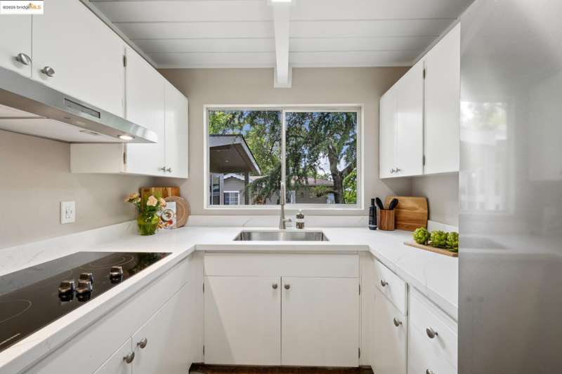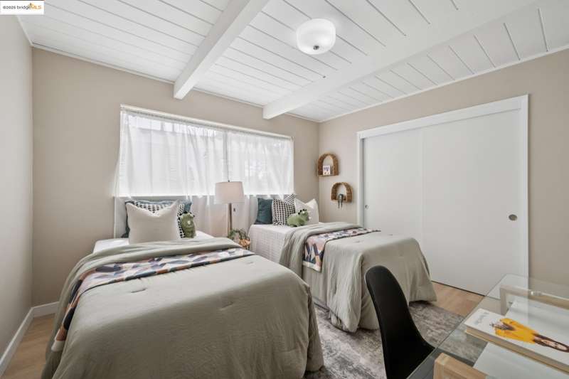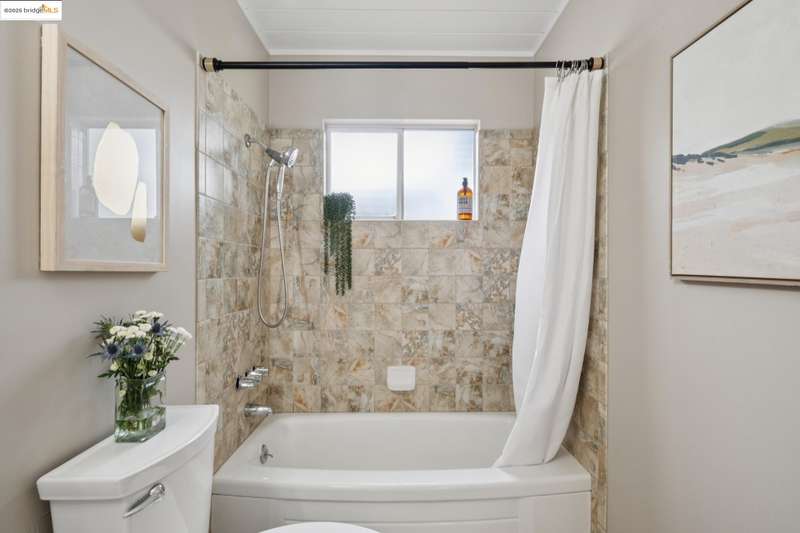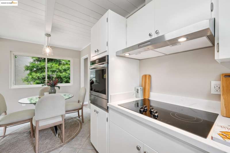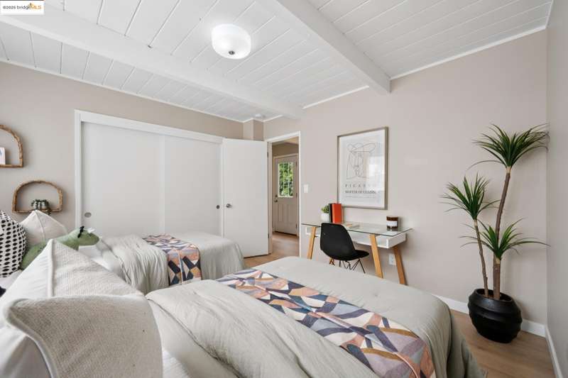 Welcome to this tastefully rehabbed home. Located in a pocket neighborhood in Lincoln Highlands. Nestled off the street with a long useful driveway, this 2 bedroom, 1 bathroom home is a light filled oasis with south, east and west sight lines. The exposed beam/tongue and groove wood ceiling throughout captures the early 60’s architectural vibe. New floors and a great overall layout. The open floorplan with banks of windows has a living, dining and kitchen all connecting in the front part of the home. A tastefully redone kitchen has new lighting, stone counters, new sink and new appliances. In the rear are two generously sized bedrooms with the primary looking out onto the backyard. The refreshed bathroom with vanity and tiles and tub is located off the hallway off the bedrooms. Access the backyard - peaceful and quiet from a door near the kitchen – ideal for quick BBQ checks as well as hosting friends and family. Overall the lot is 11,576 SQF. Lincoln Highlands is a premier Oakland neighborhood where City living meets the serenity of nature in addition to great weather! Joaquin Miller Park and Diamond Park are nearby – come and experience blissful trails, Redwood groves and fabulous views. Finally, Avenue Terrace kids park is conveniently close.