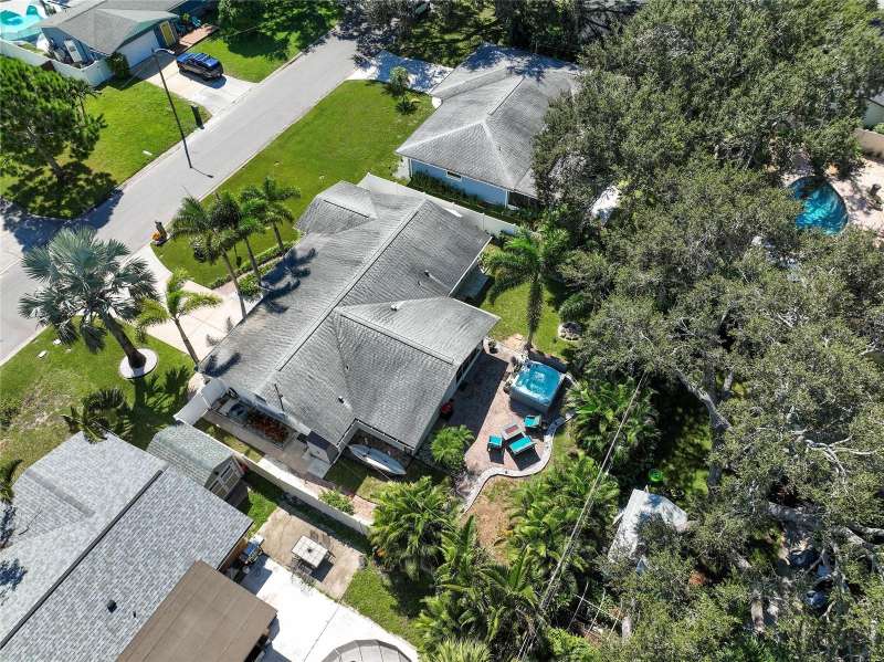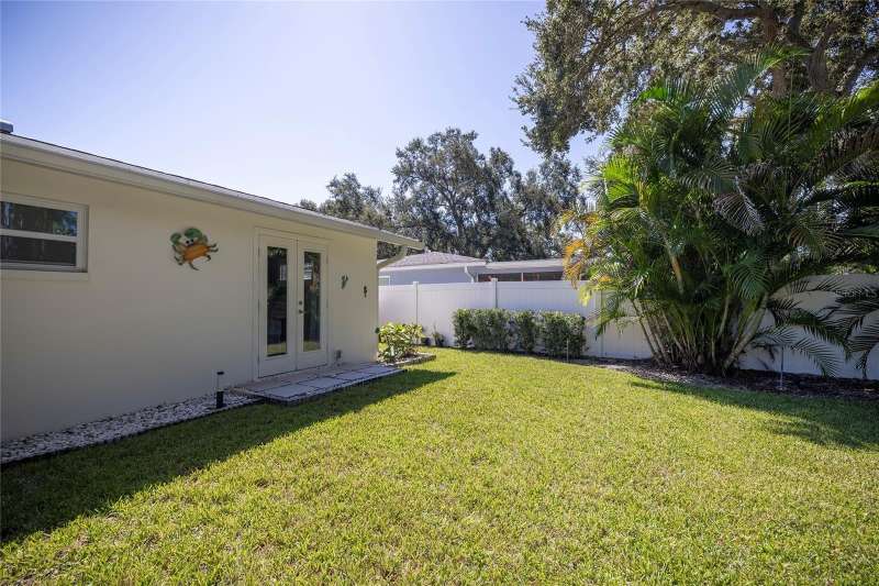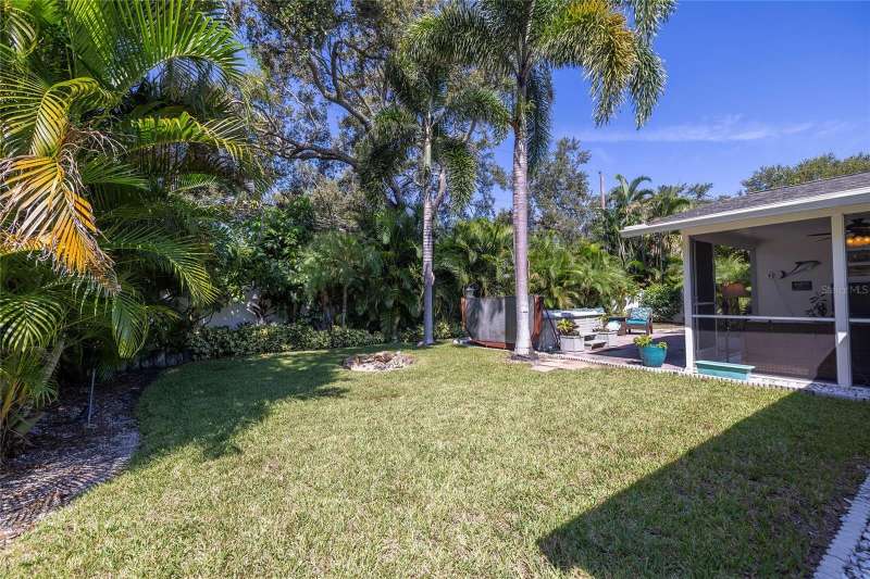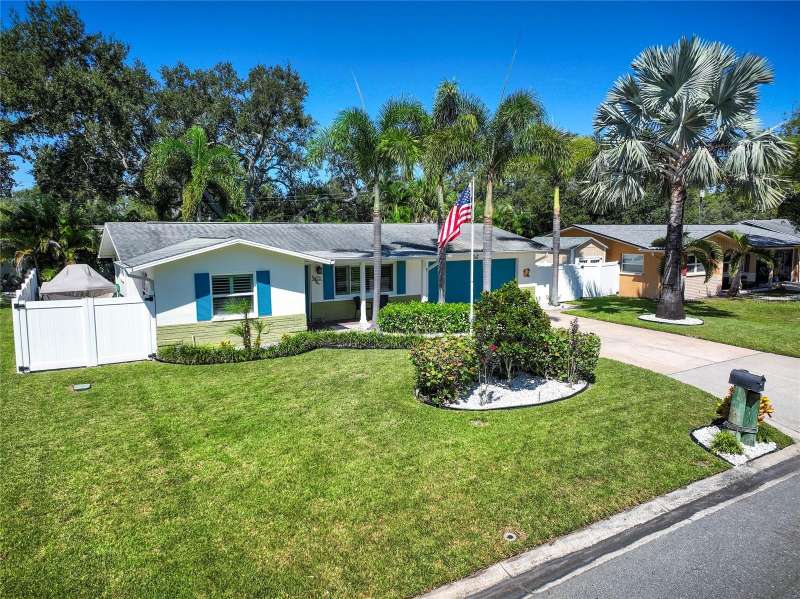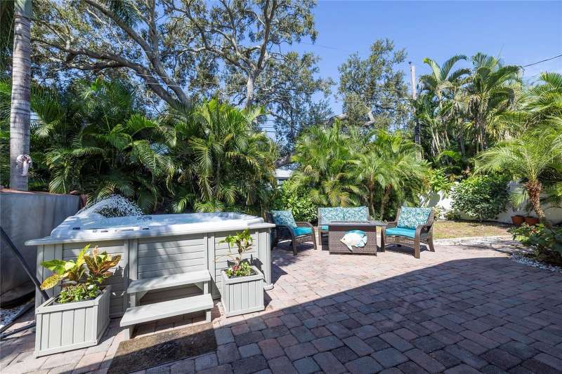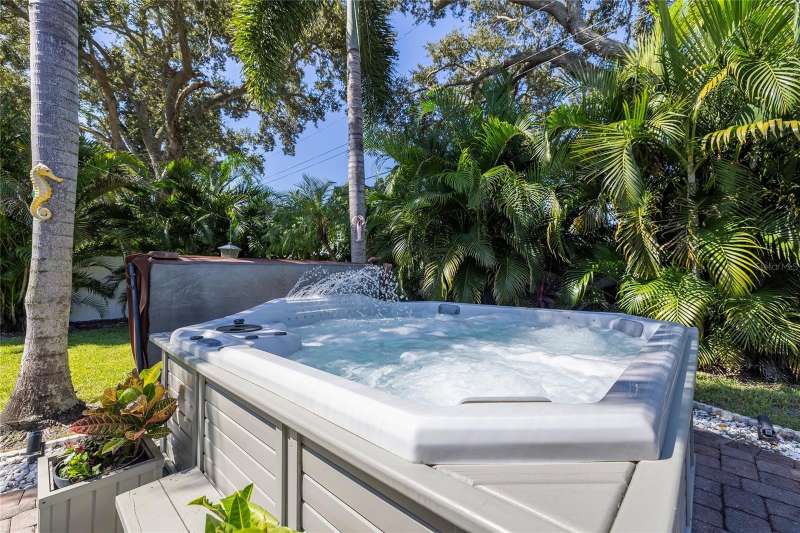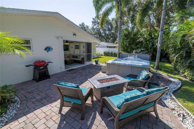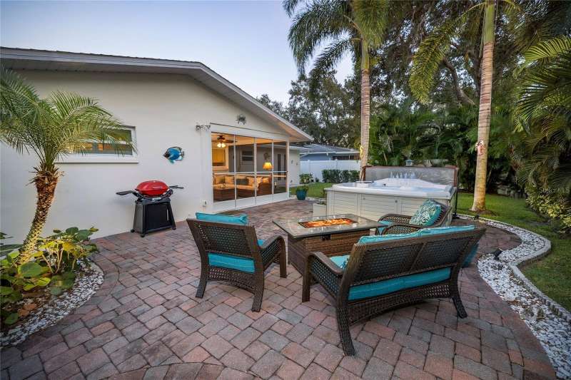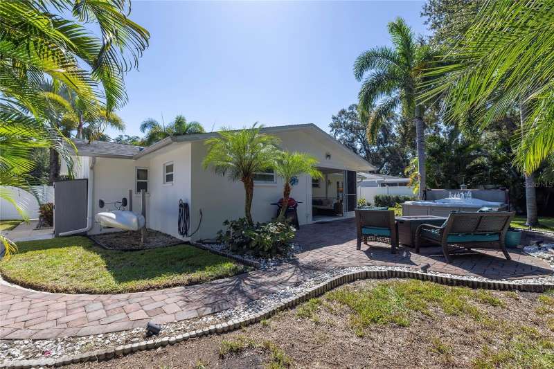 YOUR OWN PERSONAL PRIVATE PARADISE IN DELIGHTFUL DUNEDIN, FLORIDA - NO FLOOD INSURANCE REQUIRED - LOCATED IN GOLF CART ZONE - SPLIT PLAN - HOME WARRANTY OFFERED. This 2BR/2BA/2 Car Garage home is located in the Dunedin golf cart zone and is around the corner from the Dunedin Community and Fine Arts centers as well as Highlander Park. It is a short walk to the Pinellas trail and Hammock Park or a quick bike ride to Honeymoon Island. As you enter the home you will be amazed by the open floor plan with bright natural colors and coastal décor. The split-floor plan offers a primary bedroom which features an ensuite bathroom with walk-in shower, and a second bedroom with access to its own bathroom area with garden tub and French doors leading to the backyard. The bright updated kitchen features granite counters, large kitchen island with breakfast bar area, stainless steel appliances and under cabinet lighting with views of a very private fenced backyard and screened lanai. Once you enter the screened lanai you will feel like you have entered your own private paradise and outdoor living room. The backyard is completely fenced with 6-foot vinyl fencing, mature landscaping including Foxtail palms, Plumerias, along with Areca palms and Clusia providing privacy. Enjoy the large paver patio with an awesome 6 person hot tub with led lighting and waterfall. A firepit is in the center of the backyard for those cooler nights. The yard features landscape lighting throughout the front and back of the house. A parking area is dedicated on the side yard of the house behind the privacy fencing for a boat, golf cart, or other recreational vehicles. On the opposite side there is a location for hanging up kayaks or paddleboards. An irrigation system on reclaimed water is available to keep the grass and shrubbery looking beautiful. The large 2 car garage and large driveway give you plenty of room to park. Enjoy desirable Dunedin's downtown nightlife, festivals, & restaurants just minutes away. Don't forget to relax on your Gulf Beaches at Honeymoon Island, Caladesi Island, Dunedin Causeway, & Clearwater Beach! Tampa International provides a gateway to the world and is only 20 miles away or half-hour drive as well as Raymond James Stadium, home to the Tampa Bay Buccaneers; downtown Tampa is only a few minutes further and is home to the Tampa Bay Lightning and the Straz Center for Performing Arts. You may also want to go just 20 miles south to Downtown St Petersburg for the Tampa Bay Rays and the great night life and arts along Beach Drive. All this is within only a short drive from your future home. Listing agent is the owner.